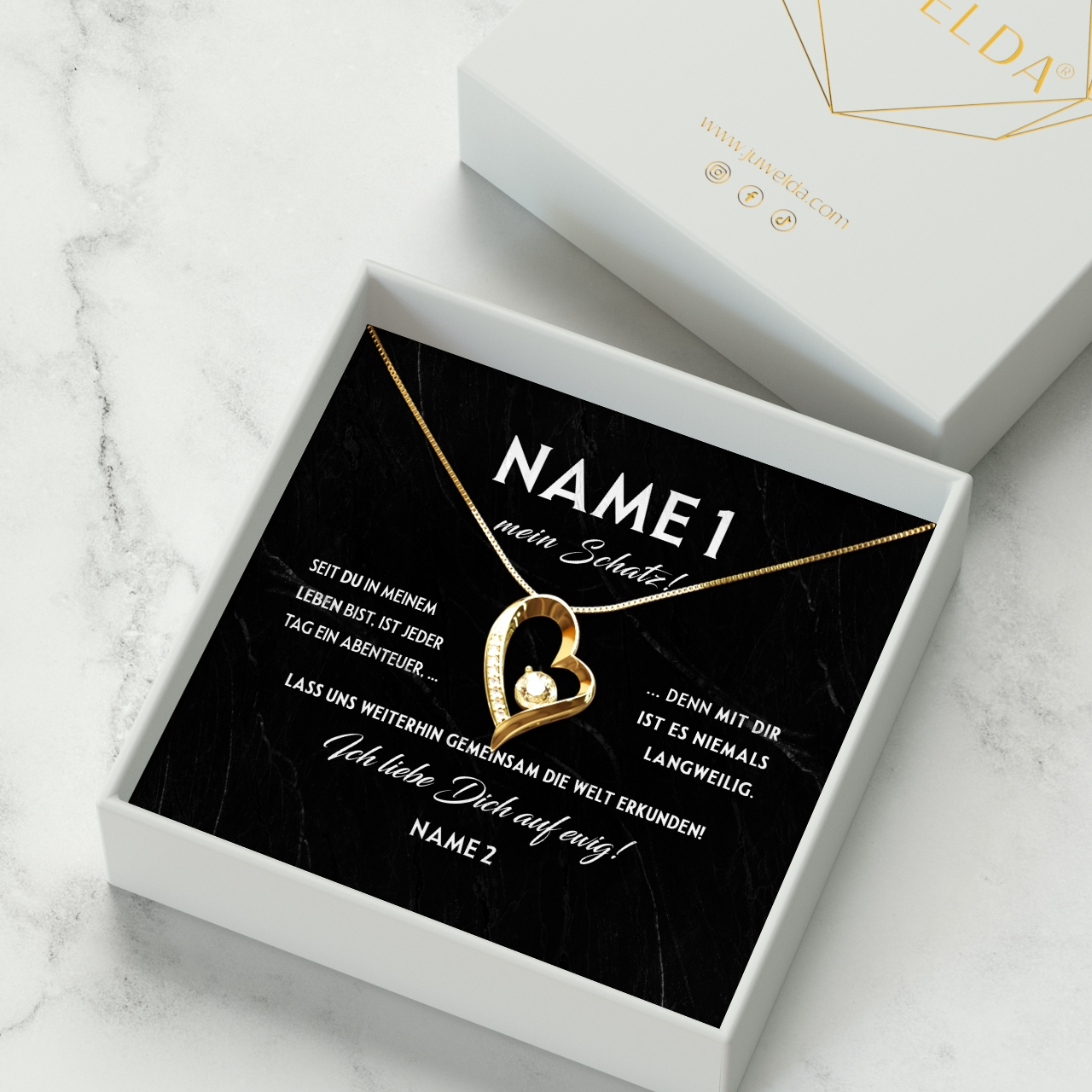 Wähle die Premium-Variante, und Du erhältst das Schmuckstück mit der Karte in einer schwarzen Schatulle. Diese wird in Seidenpapier eingewickelt. Zusätzlich gibt es eine elegante Präsentbox sowie eine Tragetasche im Juwelda-Design. Überreiche ein wunderbares Geschenk zu allen Anlässen und mache Deinen Partner richtig glücklich.