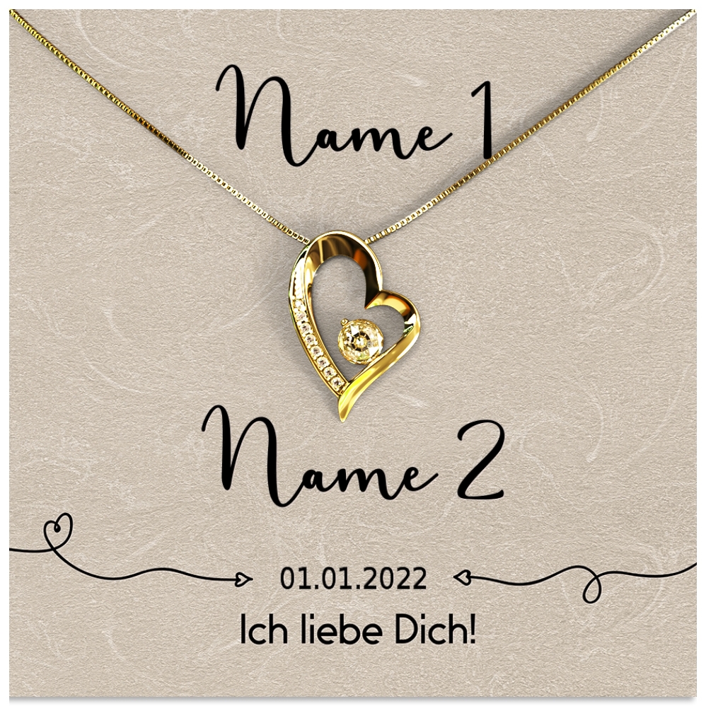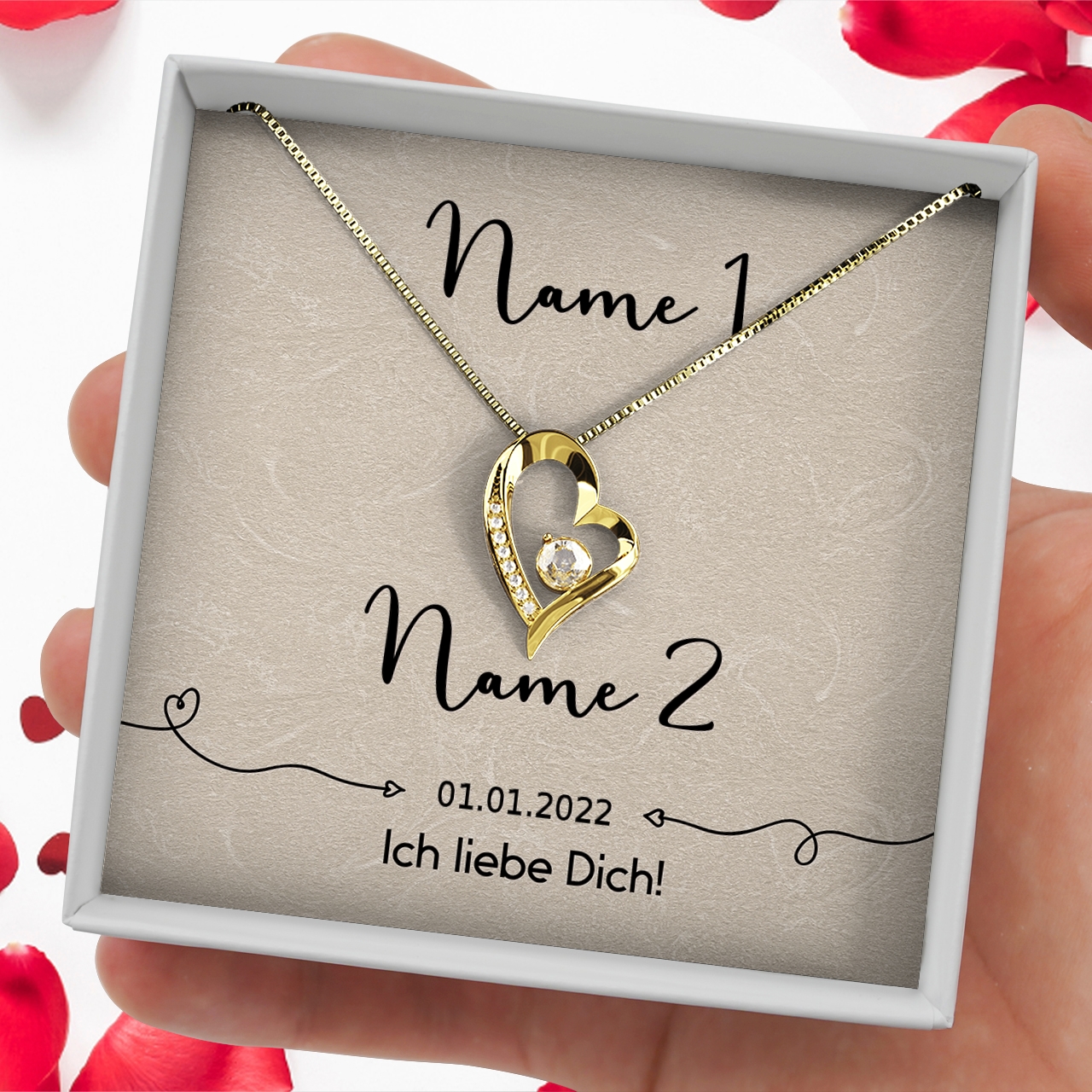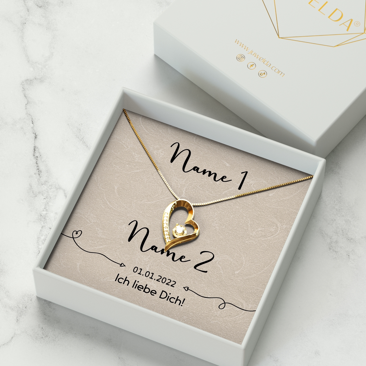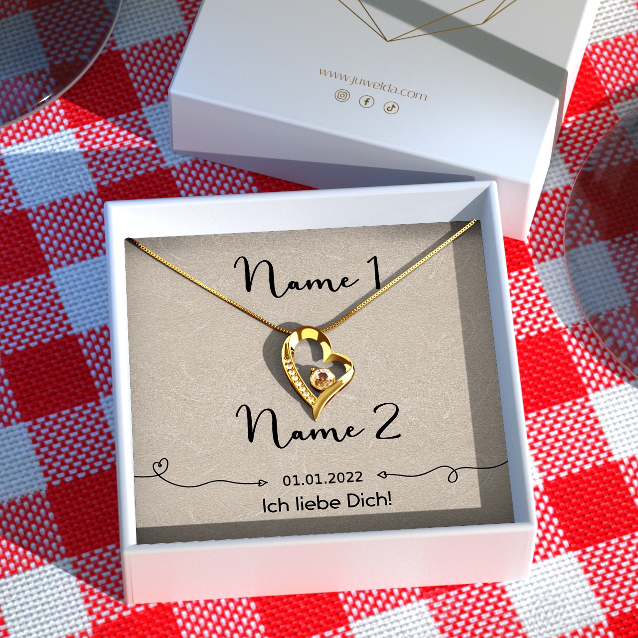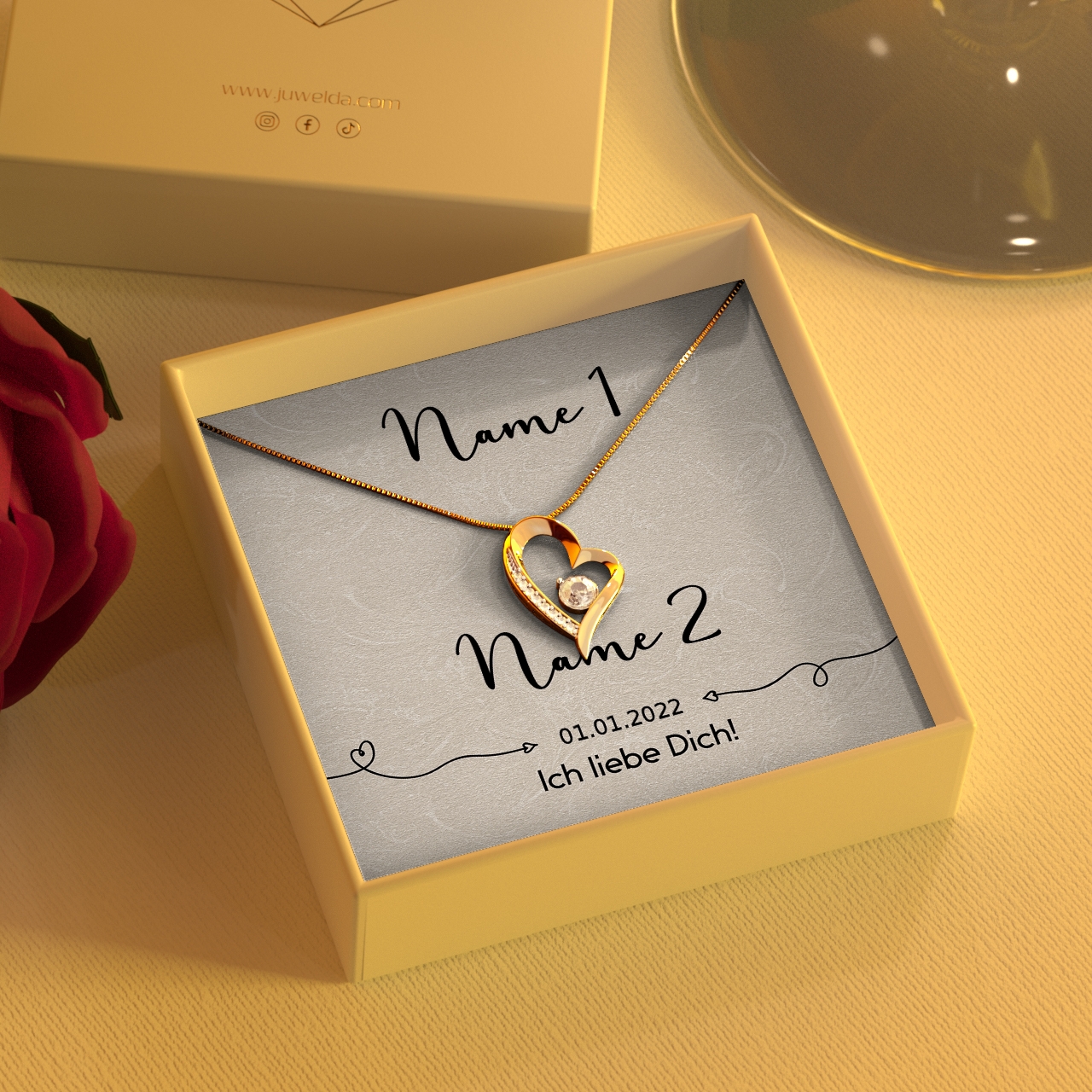 Euer Jahrestag steht bald an und Du möchtest Deinem Herzblatt ein vom Herzen kommendes Geschenk überreichen? Dieses einmalige Schmuckset ist ein Geschenk, dass nicht nur romantisch, persönlich und einzigartig ist, es beschert Euch auch einen wundervollen Überraschungsmoment, der für immer in Erinnerung bleiben wird. Kreiere Dein Geschenk mit einer funkelnden Halskette Deiner Wahl und personalisierbaren Karte „Pfeile der Liebe“. Versehen mit Eurem Jahrestag und dem Namen Deines Schatzes, drückst Du mit der personalisierten Karte alles aus, was Du Deinem Herzblatt schon immer sagen wolltest. Die Amorpfeile zeigen auf Euren Jahrestag und betonen Euren Tag, an dem Du realisiert hast, dass Du Deiner Liebsten vollkommen verfallen bist.
