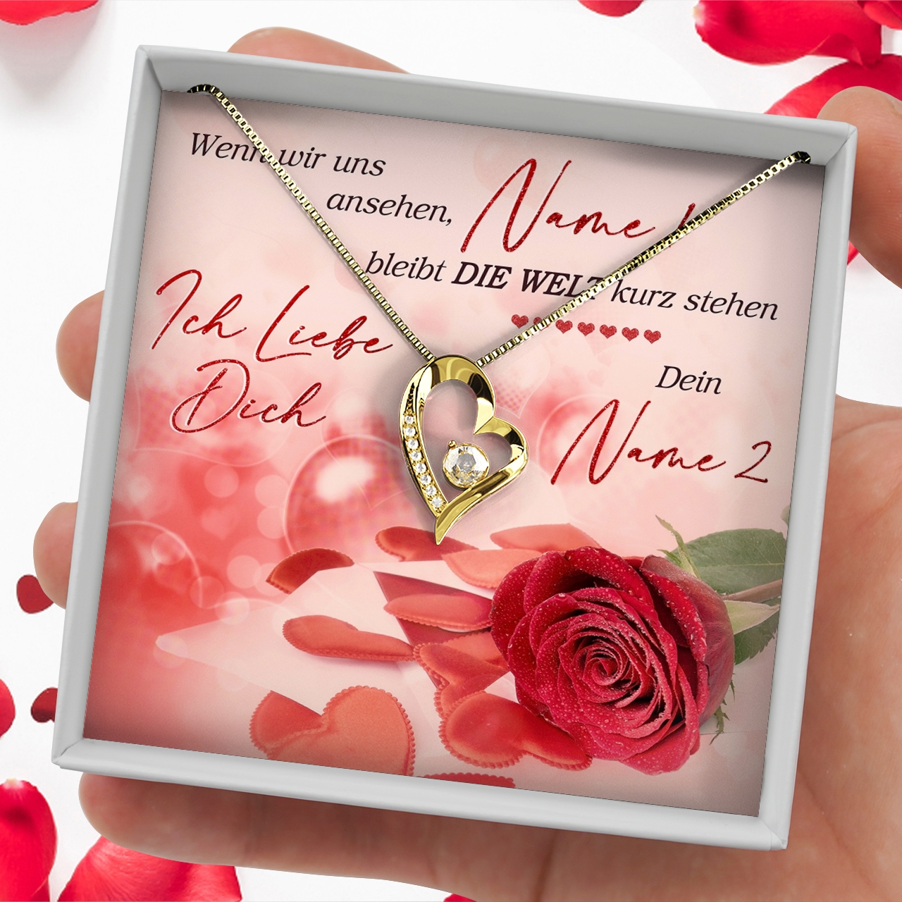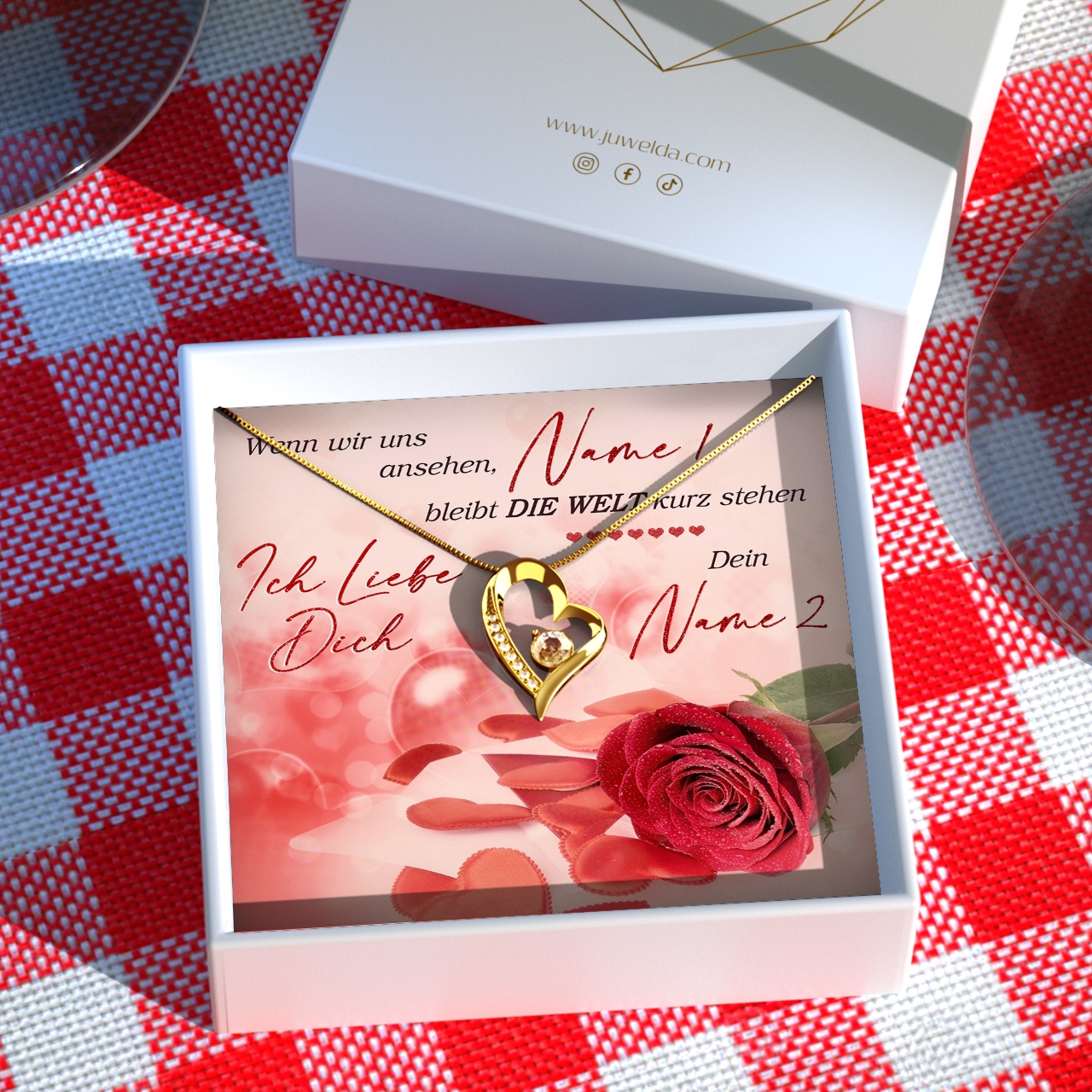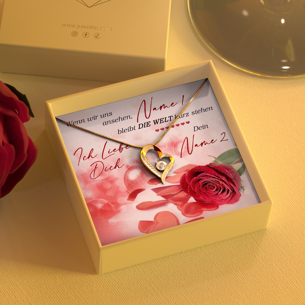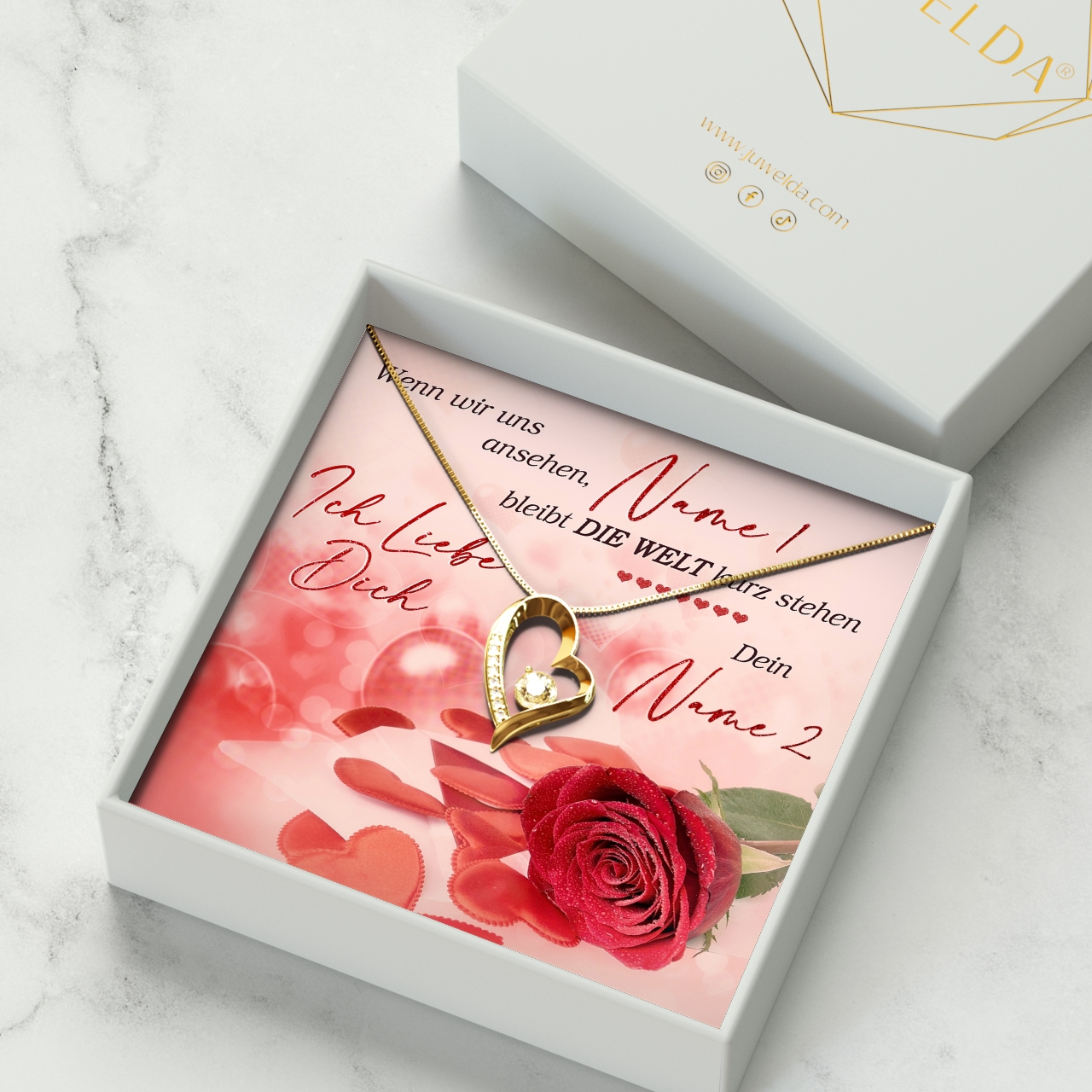 Möchtest Du Dein Geschenk sofort an Deinen Lieblingsmenschen überreichen? Dann solltest Du ein Blick auf die Variante mit der premium Geschenkverpackung werfen. Die Halskette Deiner Wahl und Deine personalisierte Karte werden liebevoll in eine hochwertige Schmuckbox mit Kunstlederüberzug und Samt-Innenbezug gelegt. Damit die Überraschung auch wirklich gut ankommt, wird alles behutsam in eine Geschenktasche gelegt, in Seidenpapier verpackt und mit einer Schleife zugebunden. Hier bekommst Du bereits einen kleinen Vorgeschmack: