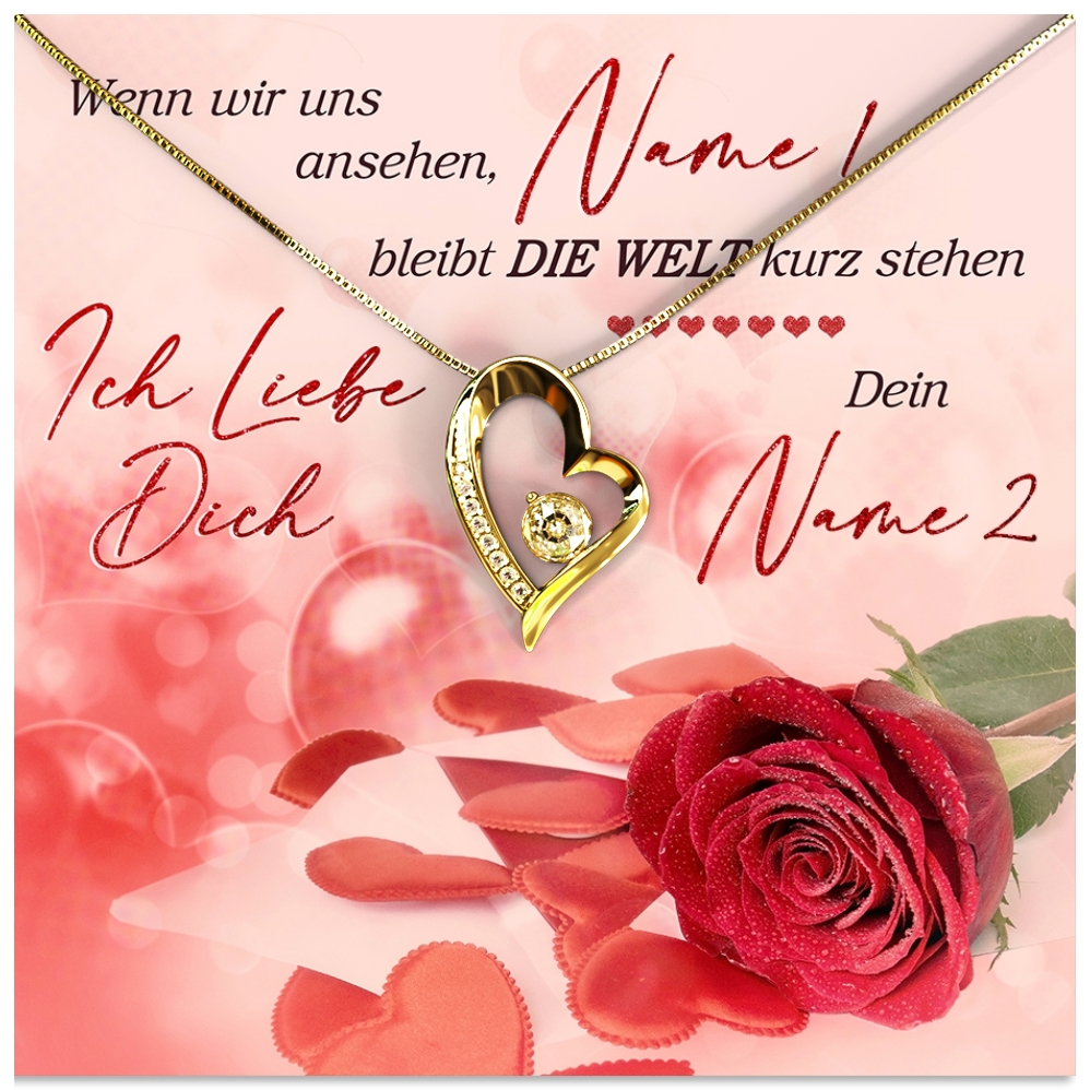 Zu besonderen Anlässen wie Geburtstag, Valentinstag oder Jahrestag verschenkst Du Rosen als Zeichen Deiner Liebe? Wie wäre es, wenn Du unsere personalisierbare Karte „Rose der Liebe“ mit Deinem Namen und den Namen Deines Schatzes individualisierst und gemeinsam mit einem atemberaubend schönen Schmuckstück verschenkst? Das Design der Grußkarte besticht durch den verspielten Hintergrund mit vielen kleinen Herzchen und einer eleganten Rose. Der Spruch bildet das Highlight der Karte und hier werden Deine Gefühle in Worte gefasst.
