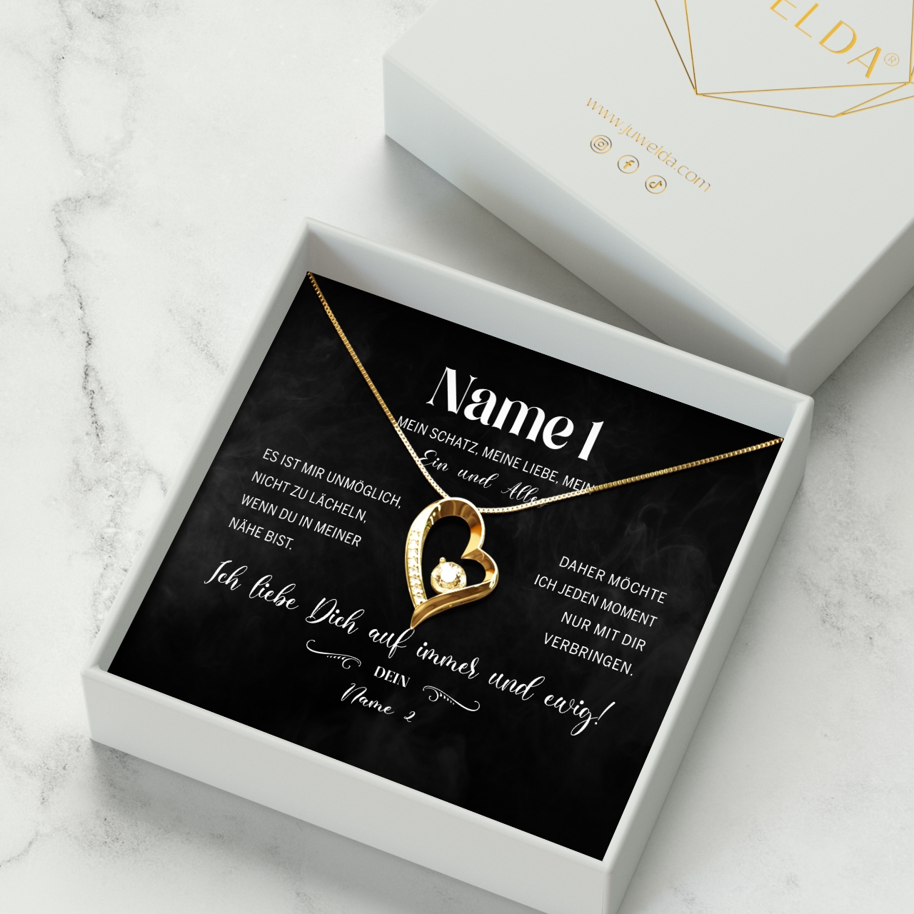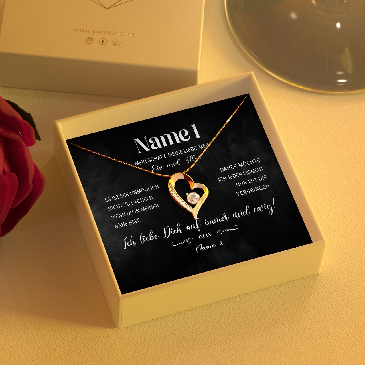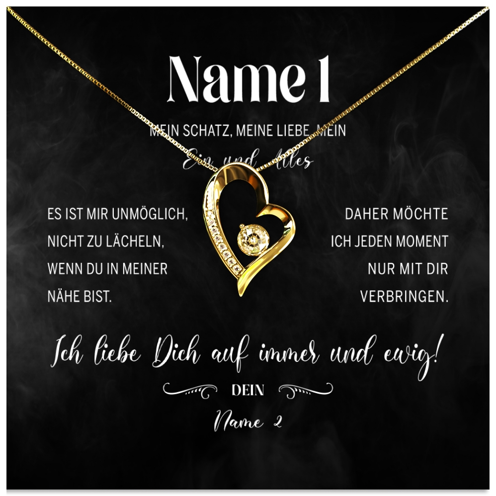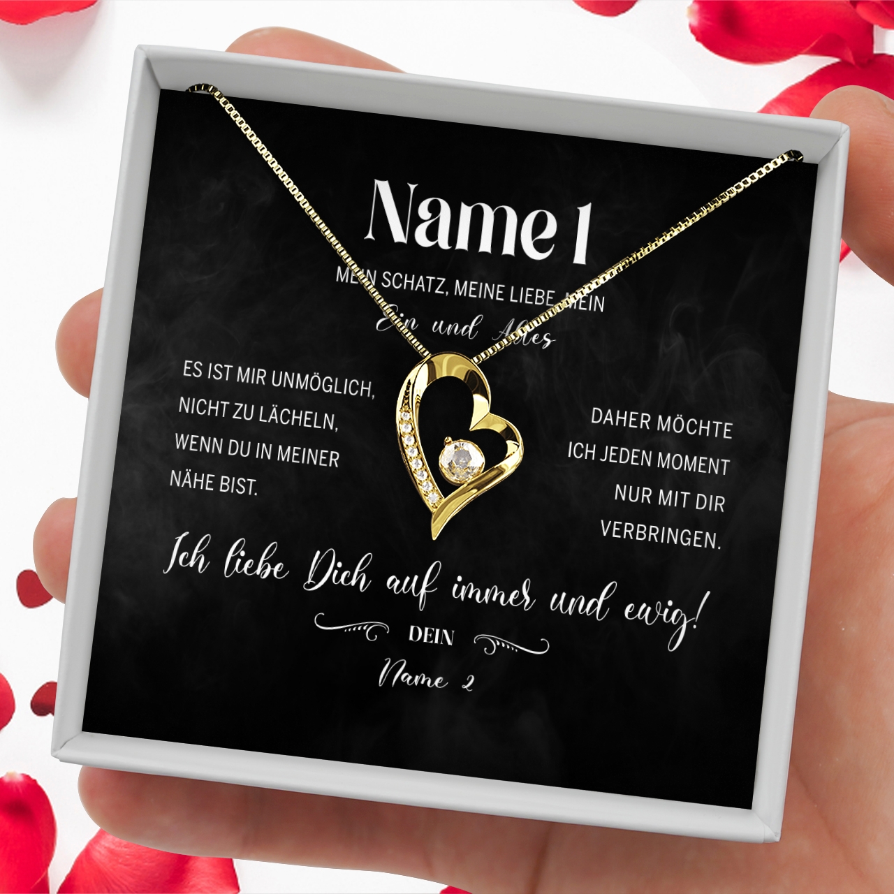 Die gemeinsame Zeit mit einer geliebten Person ist besonders wichtig. Denn Ihr könnt bleibende Erinnerungen schaffen. Feiert Eure Liebe mit einem ganz besonderen Geschenk. Wähle ein wunderschönes Schmuckstück und kombiniere es mit dieser personalisierten Grußkarte. Du gibst einfach die Namen an, die in das Design integriert werden sollen und schon kannst Du das finale Kartendesign sehen. So kreierst Du ein Geschenk, das so einzigartig ist wie Eure Liebe.