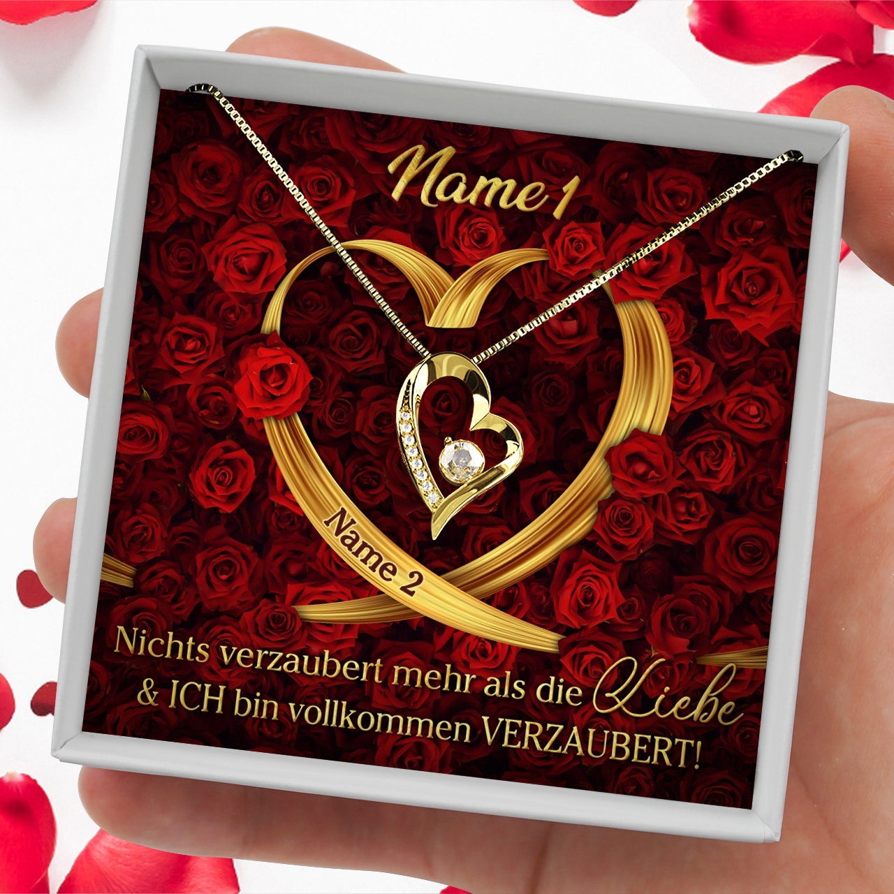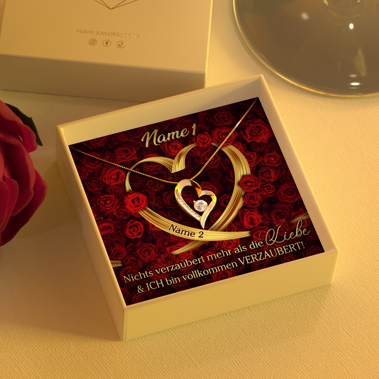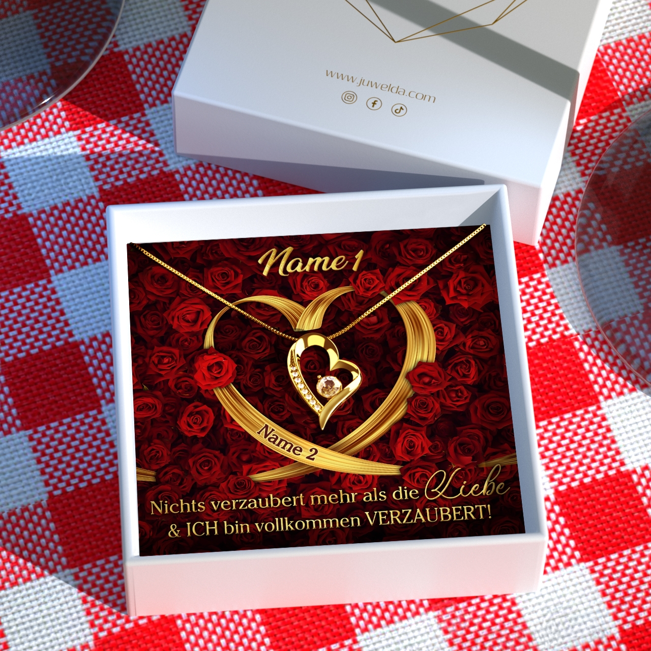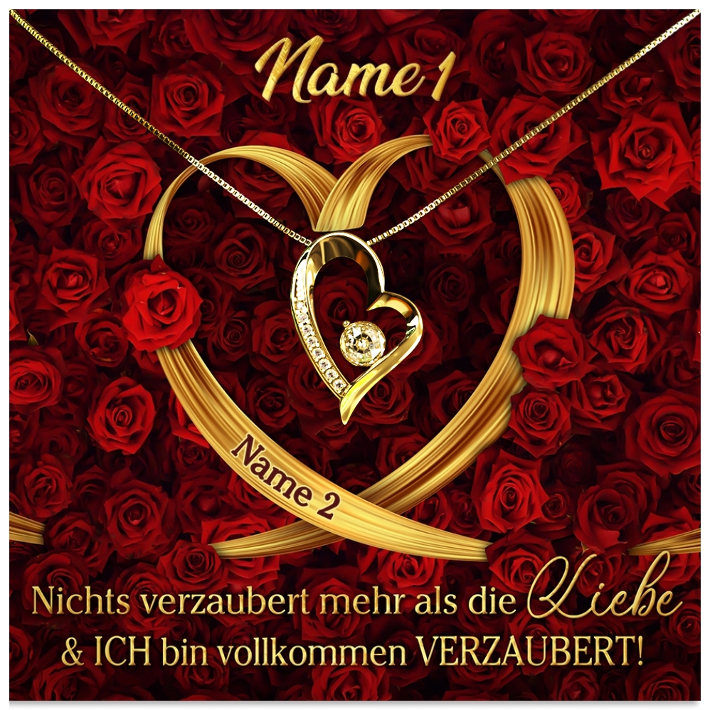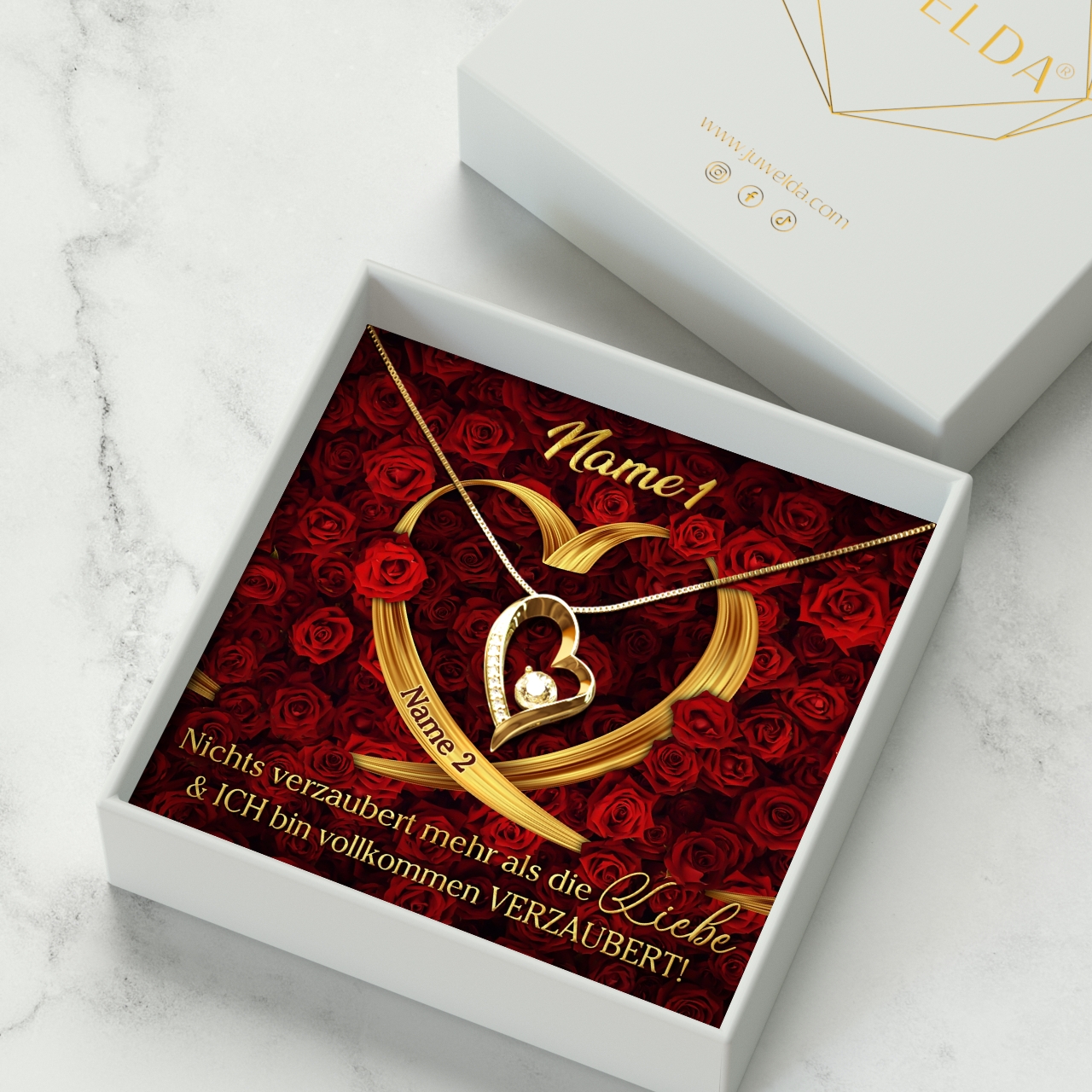 Der Valentinstag ist für Deine Frau und Dich besonders wichtig? Denn an diesem Tag möchtet ihr Eure Liebe füreinander feiern? Unser Schmuckgeschenkset mit der personalisierten Grußkarte „Verzauberte Liebe“ macht genau dies möglich. Das romantische Rosenmotiv mit dem goldenen Herzen und dem herzlichen Liebesspruch ist ideal für den Tag der Liebe geeignet. Suche aus unserer eleganten Schmuckkollektion ein Stück aus, das die Schönheit Deiner Frau zum Leuchten bringt. Zusammen mit der Karte übergibst Du dann das perfekte Präsent.
