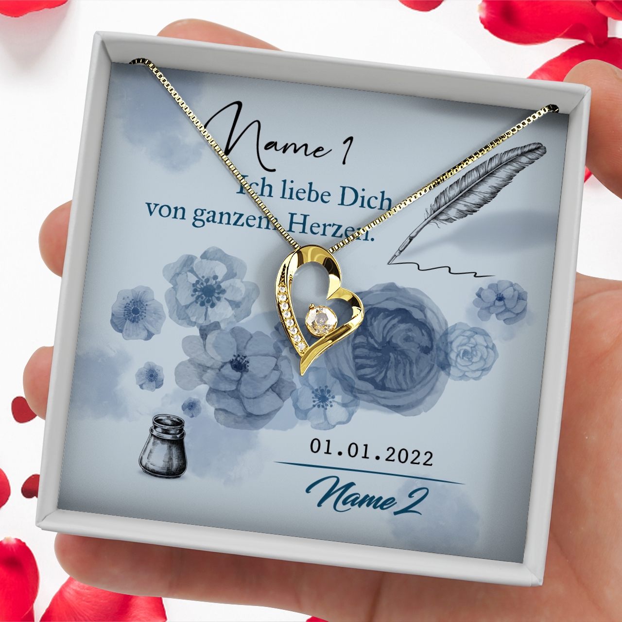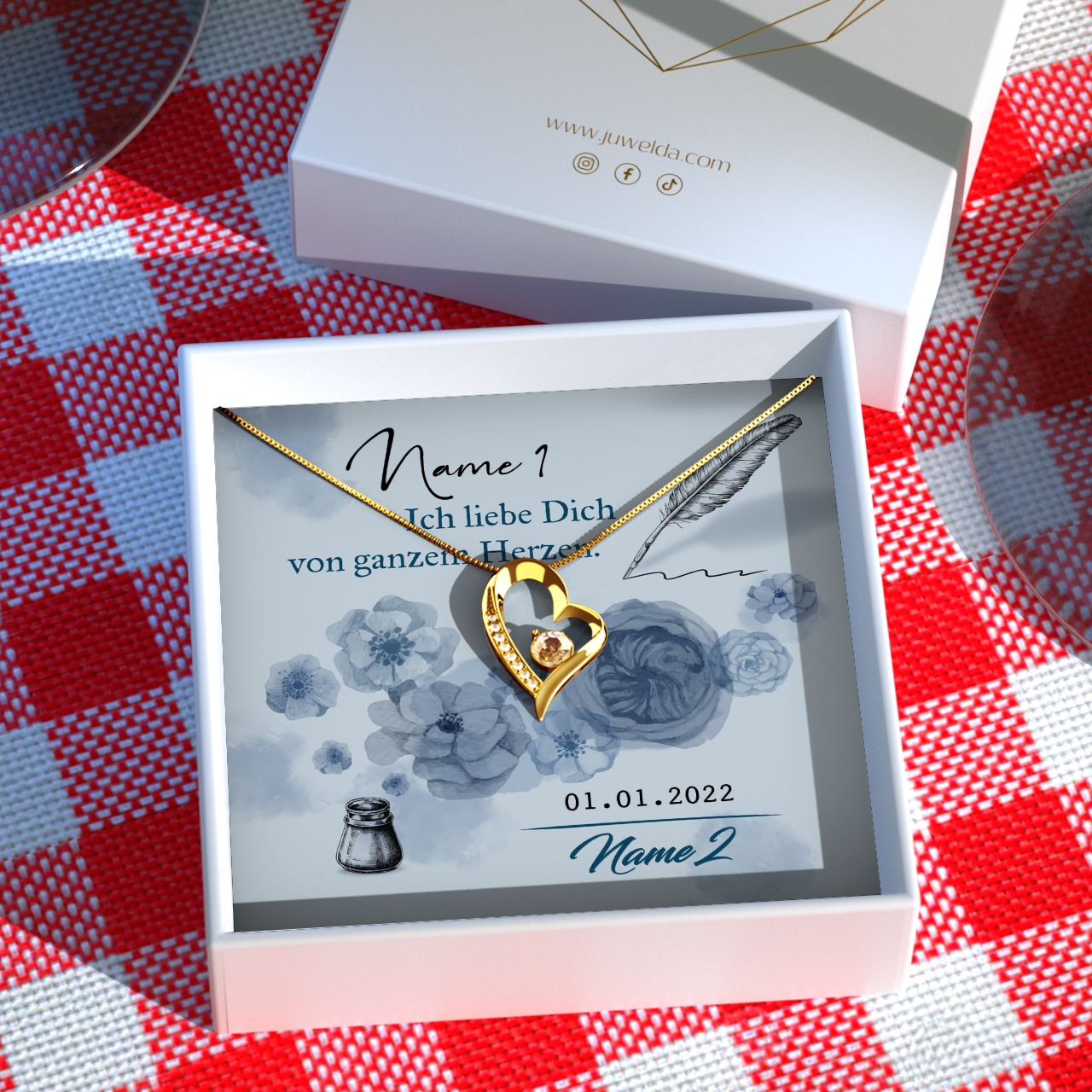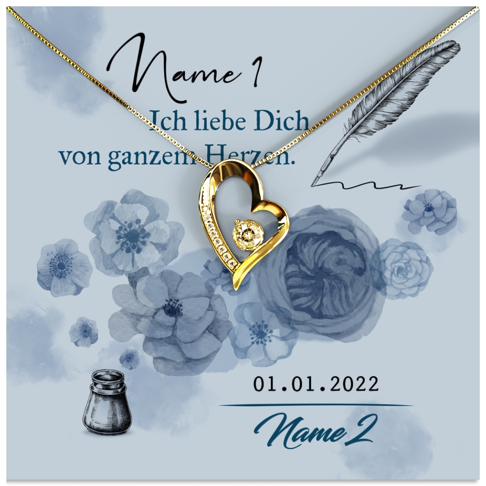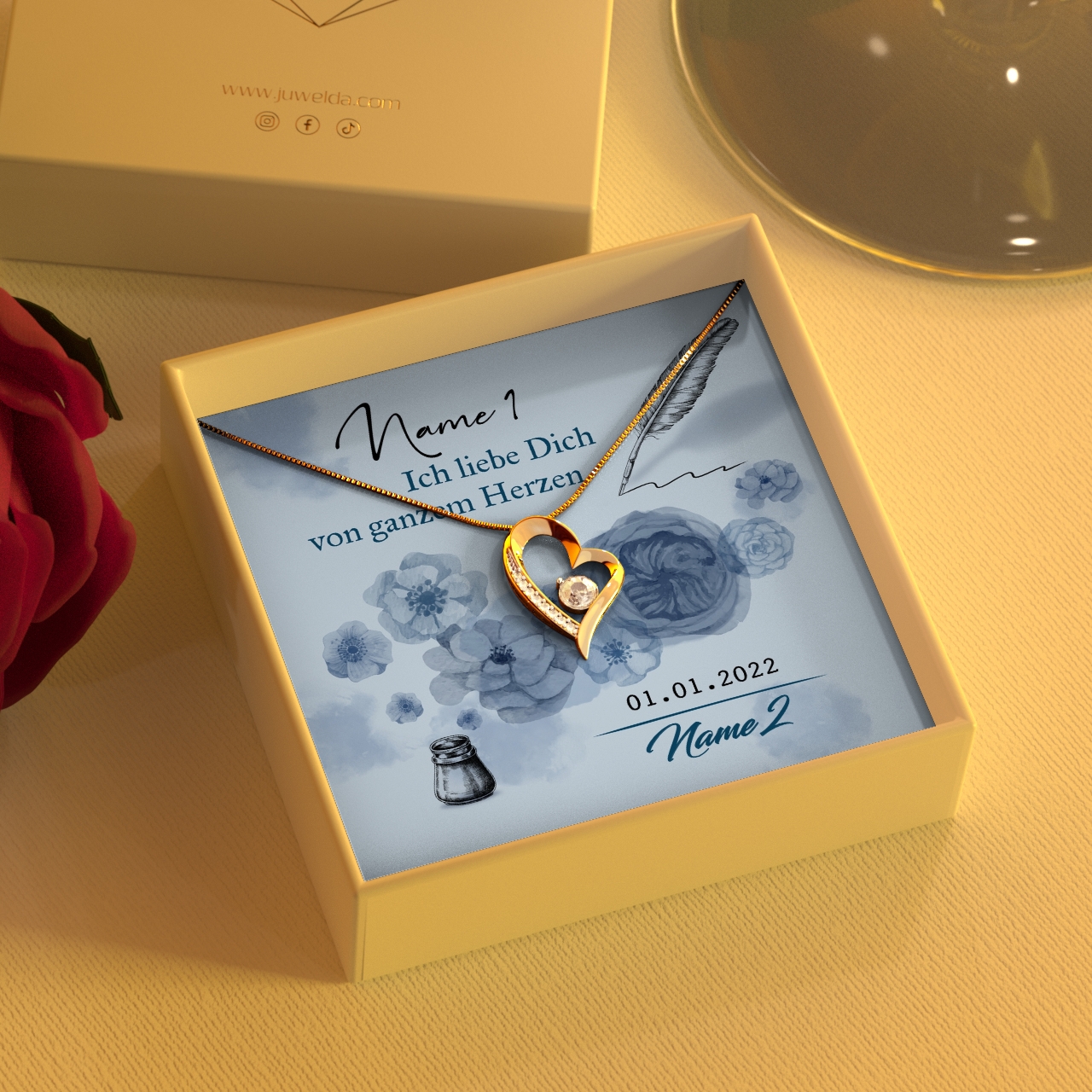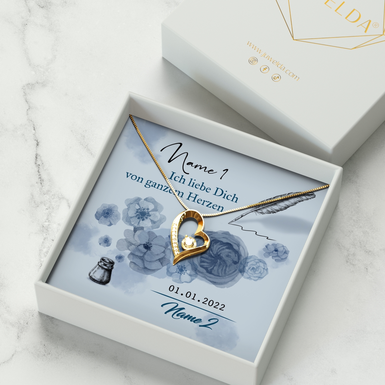 Du und Deine Frau feiern den ersten oder auch den 20. Hochzeitstag? Das ist immer ein Grund, sie mit einem sehr besonderen wie persönlichen Geschen zu beglücken. Bei uns erhältst Du wunderschöne Geschenk-Boxen mit einem edlen Schmuckstück und einer personalisierbaren Grußkarte. Das „Von ganzem Herzen“ Design ziert ein romantischer Spruch und Blumen in Pastellblau, die im Aquarell-Stil gehalten sind. Der Name Deiner Frau wird in Federschreibschrift aufgedruckt und wirkt so besonders filigran.