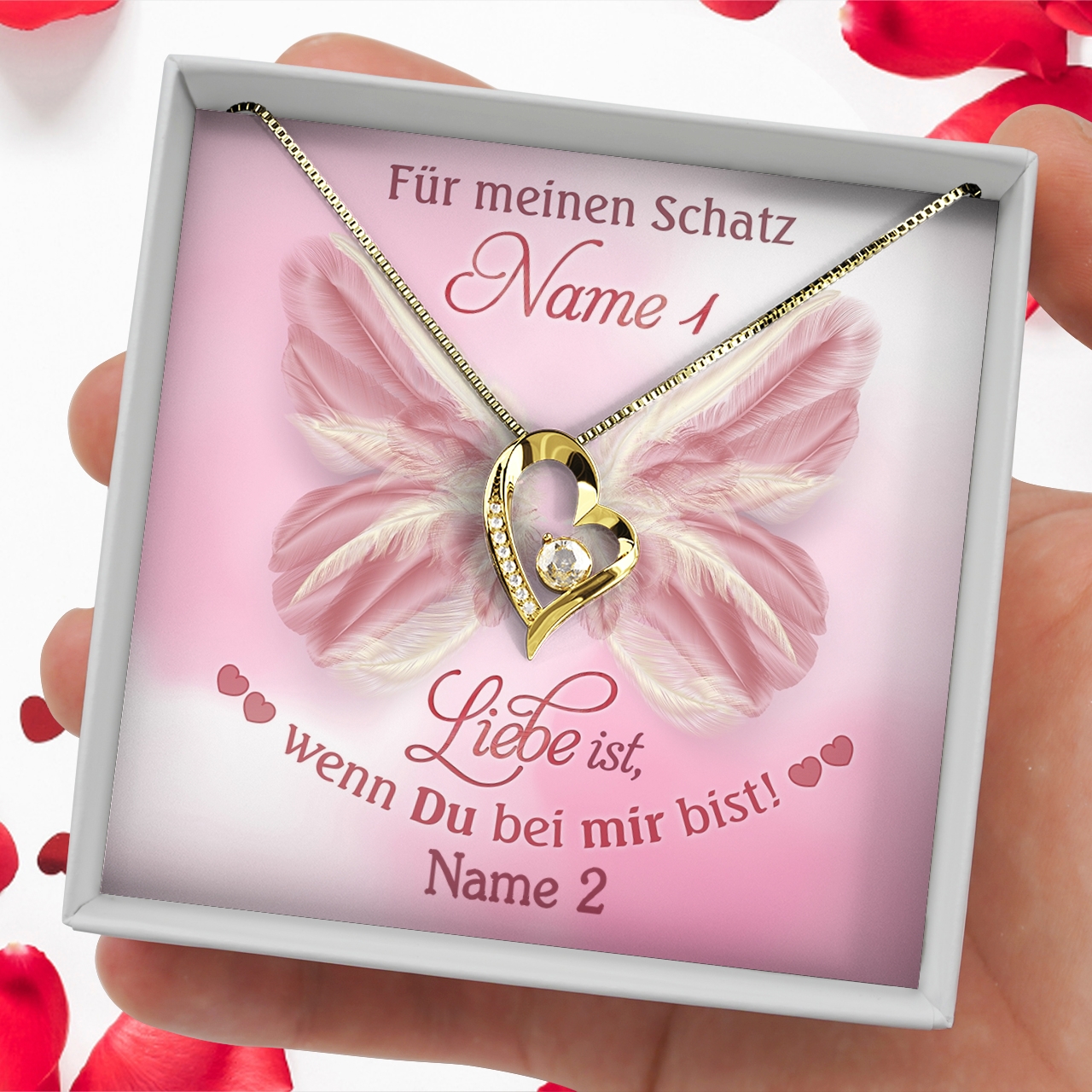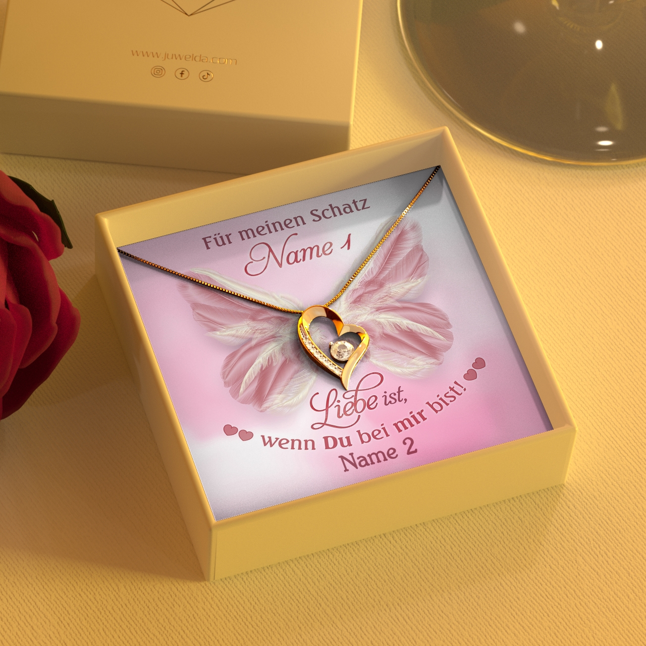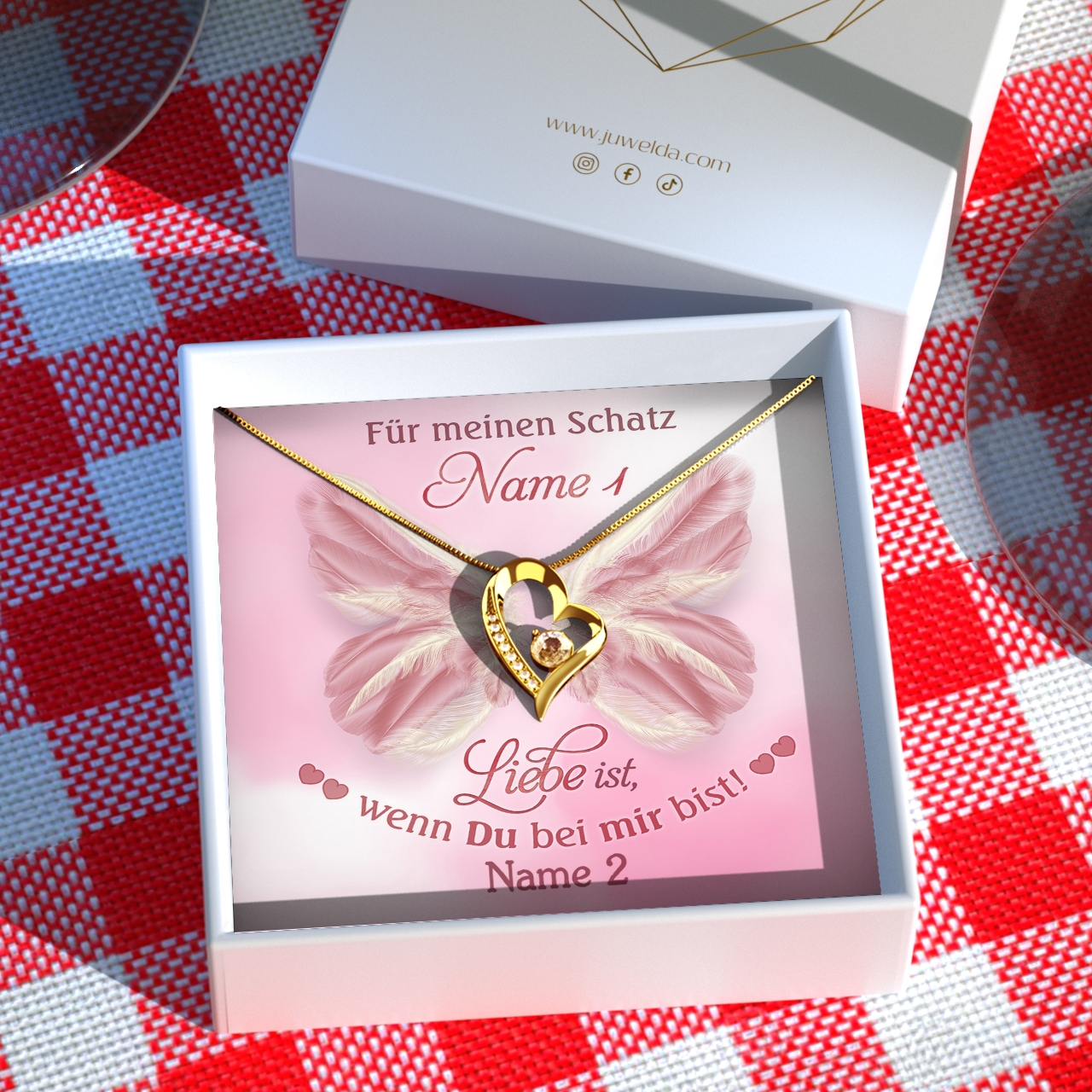 Möchtest Du die Karte noch persönlicher machen? Dann kannst Du einfach Eure Namen auf die individuelle Grußkarte drucken lassen. Damit Deine Liebesbotschaft nie in Vergessenheit gerät, kann die Schmuckbox mit der personalisierten Karte in Eurer Wohnung platziert werden. Beim Betrachten wird Deine Partnerin immer daran erinnert, dass Du sie von ganzem Herzen liebst!