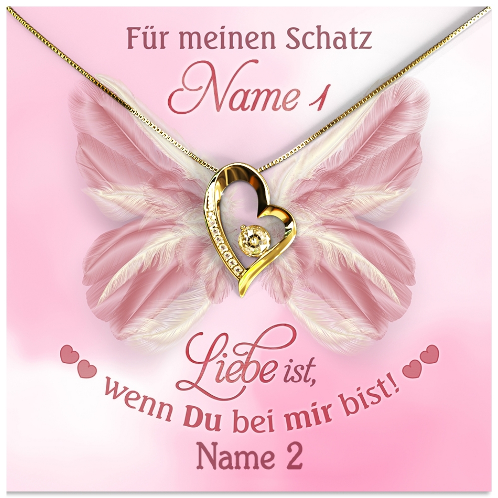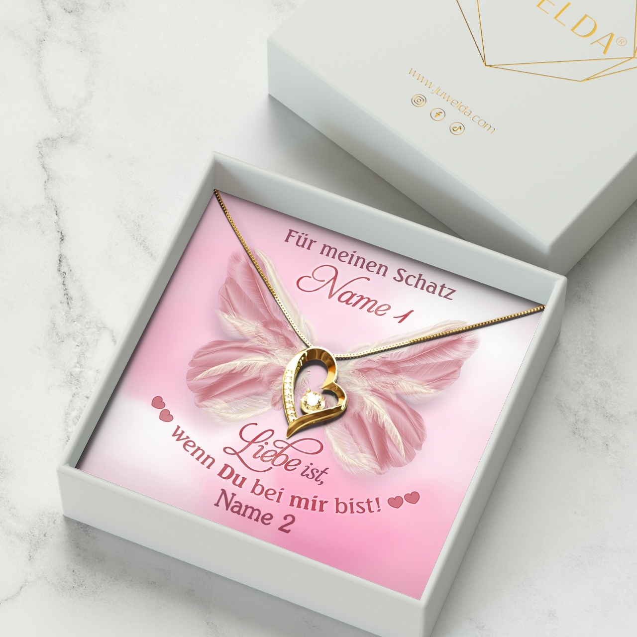Jedes Mal, wenn Du nach Hause kommst und Dein Schatz Dich mit einem herzlichen Kuss begrüßt, weißt Du, dass Du an keinem anderen Ort der Welt sein möchtest als bei ihr – Deiner großen Liebe. Du liebst Deinen Schatz über alles und möchtest ihr das gerne auf die etwas andere Art mitteilen? Dann kannst Du das jetzt mit unserer personalisierbaren Karte „Wenn Du bei mir bist“ tun. Ein graziler Schmetterling gepaart mit schwungvollen rosa Federn auf einem schlichten Hintergrund hinterlegt das von dir gewählte Schmuckstück. Mit diesem Geschenk überbringst Du Deine ganz persönliche Liebesbotschaft und bringst Deine Gefühle zum Ausdruck.
