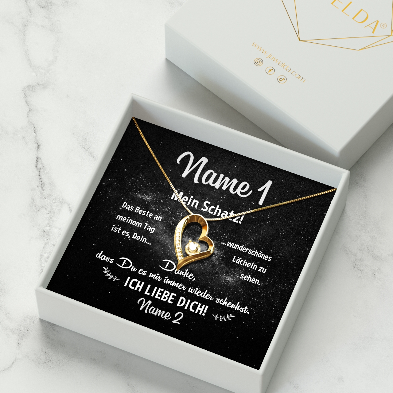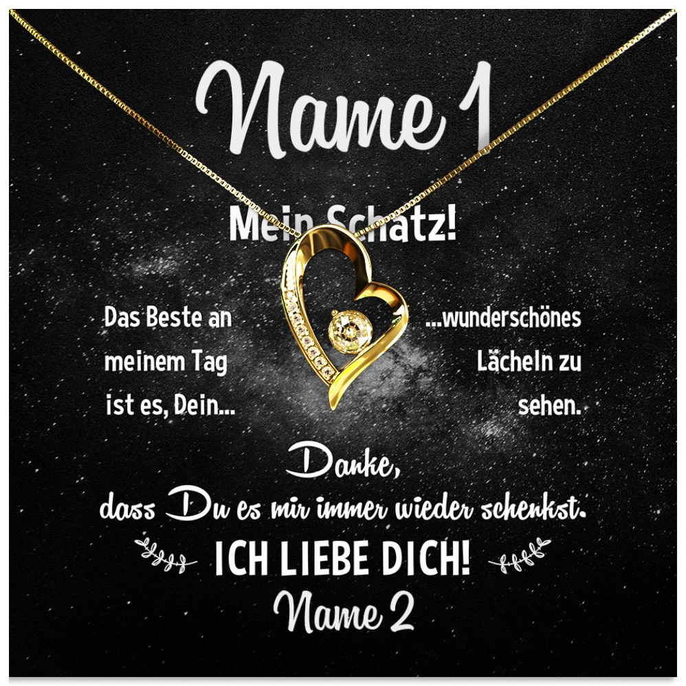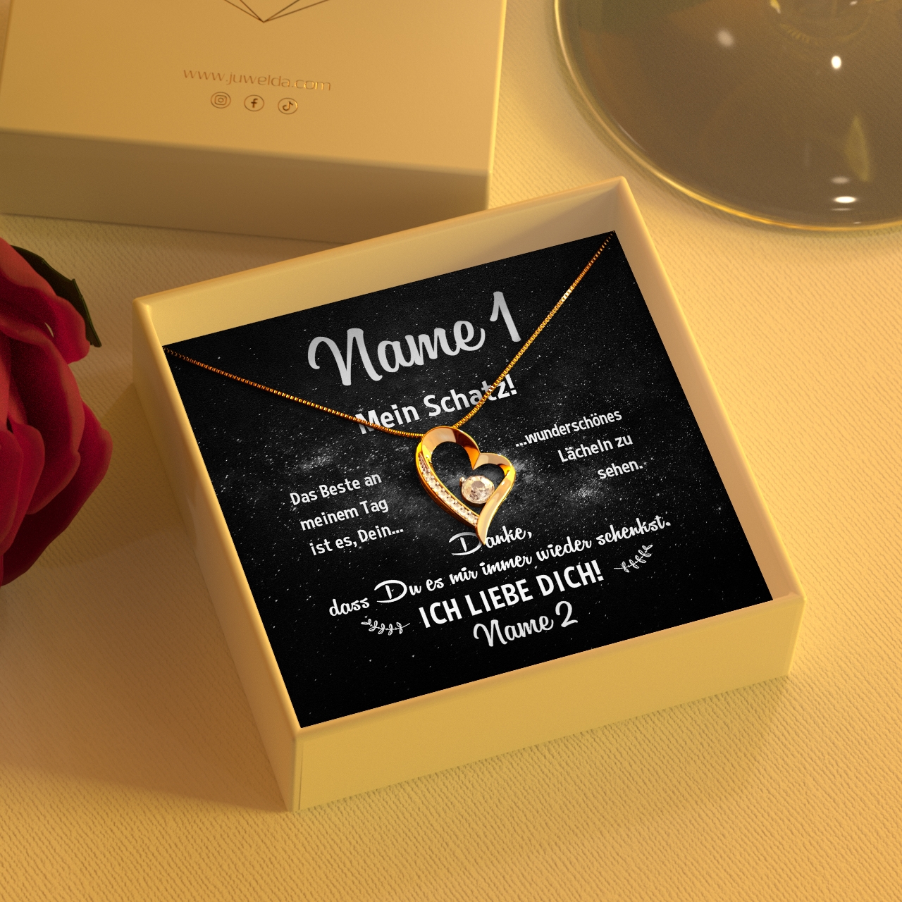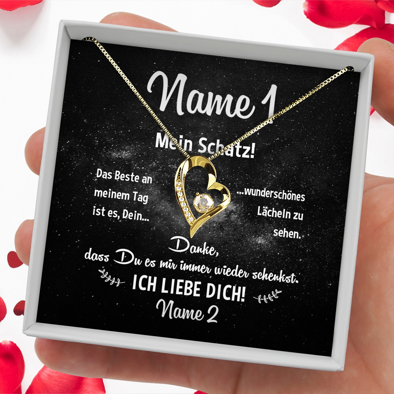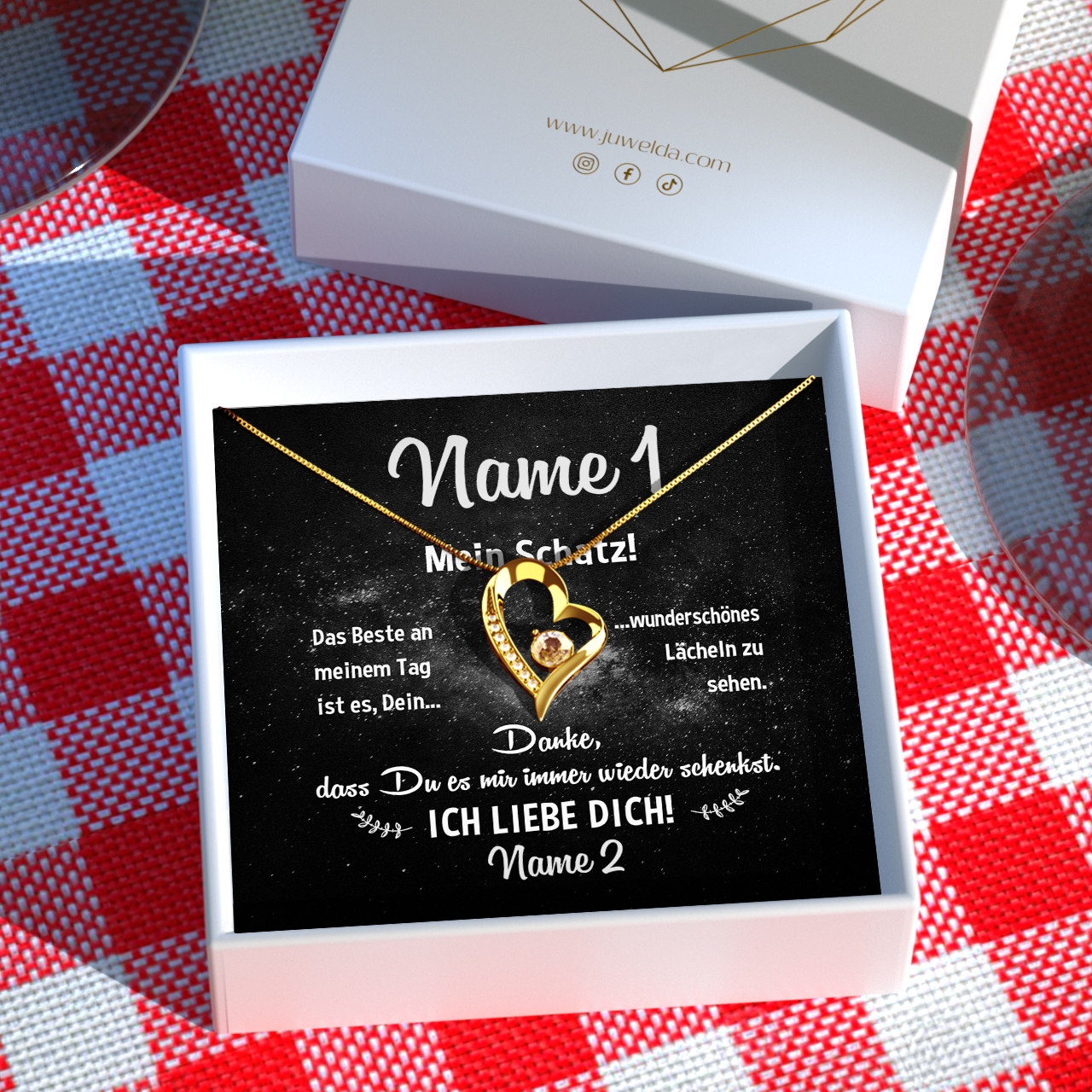 Du kannst gar nicht genug davon bekommen, das Lächeln Deines Partner zu sehen? Dann zaubere ihm mit einem personalisierten Geschenkset mit Grußkarte ein Lächeln ins Gesicht. Das Set umfasst ein vor Dir gewähltes Schmuckstück und eine Grußkarte mit Euren Namen. Das Design lässt sich ganz einfach online anpassen. In der Vorschau kannst Du sofort sehen, wie das finale Set aussehen wird.