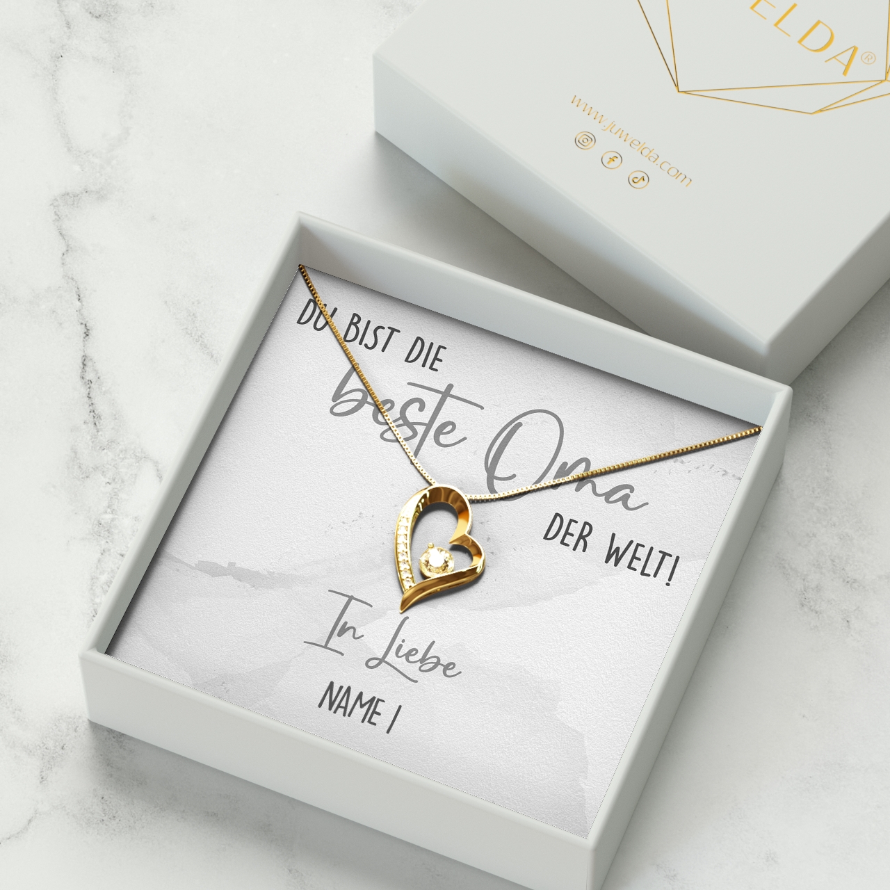 Möchtest Du Dein Geschenk sofort an Deinen Lieblingsmenschen überreichen? Dann solltest Du ein Blick auf die Variante mit der premium Geschenkverpackung werfen. Die Halskette Deiner Wahl und Deine personalisierte Karte werden liebevoll in eine hochwertige Schmuckbox mit Kunstlederüberzug und Samt-Innenbezug gelegt. Damit die Überraschung auch wirklich gut ankommt, wird alles behutsam in eine Geschenktasche gelegt, in Seidenpapier verpackt und mit einer Schleife zugebunden. Hier bekommst Du bereits einen kleinen Vorgeschmack: