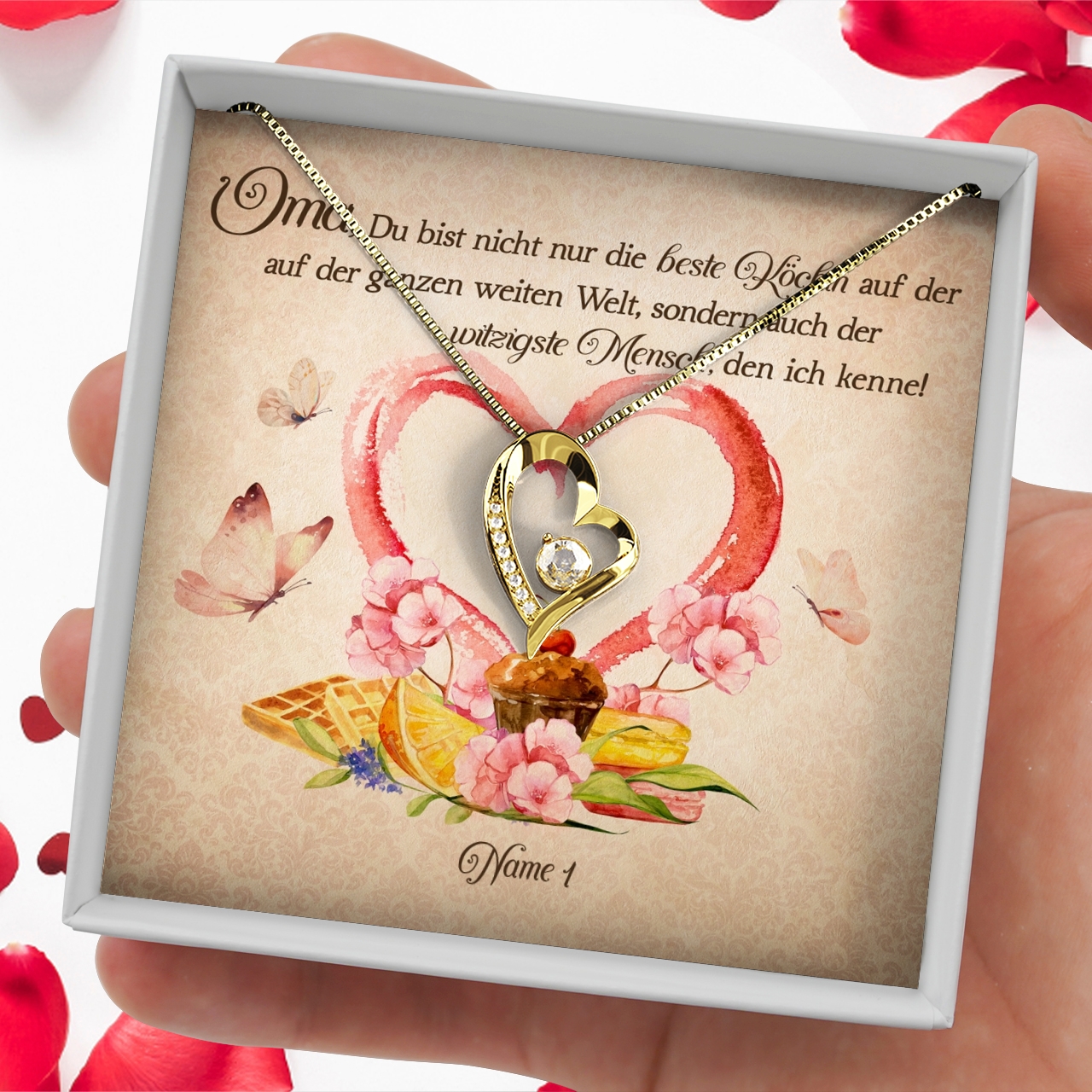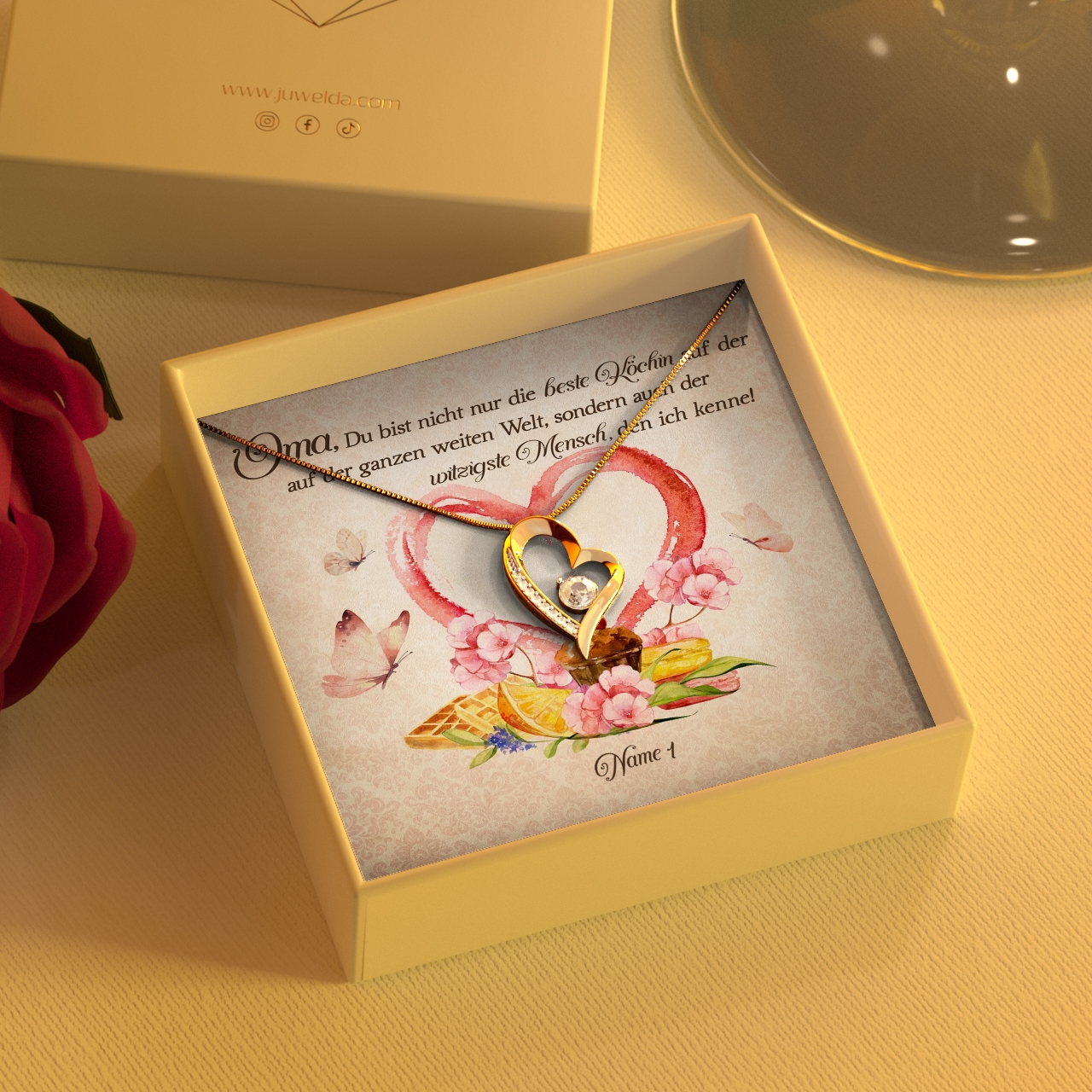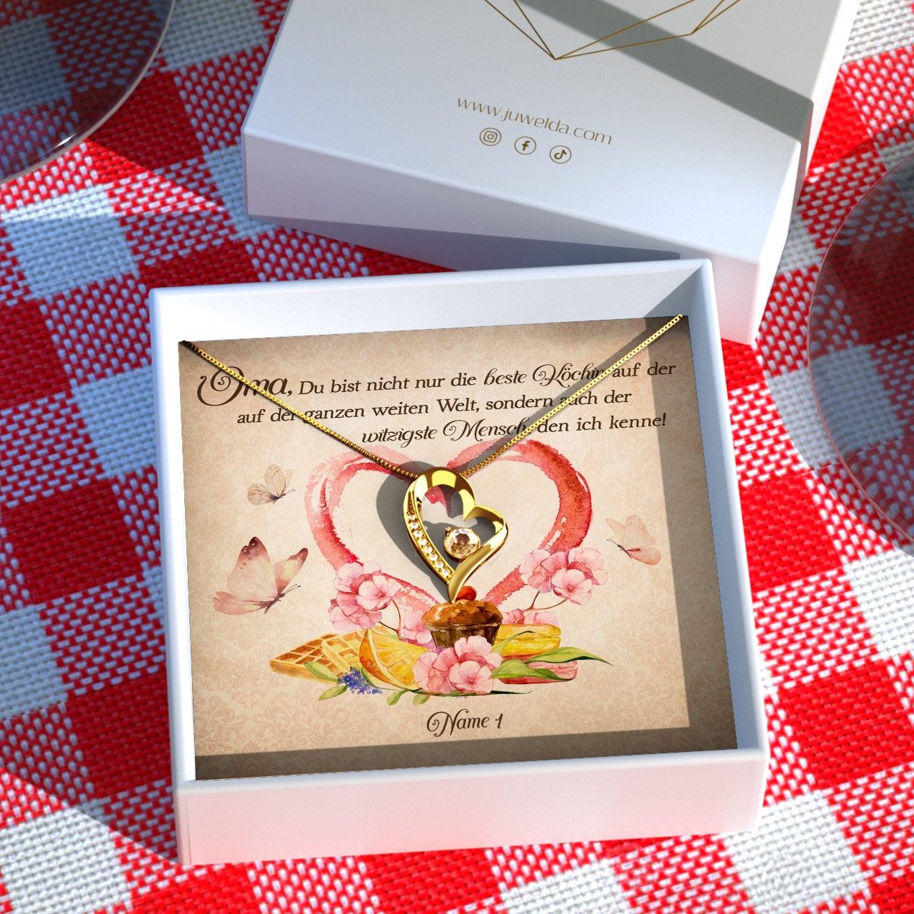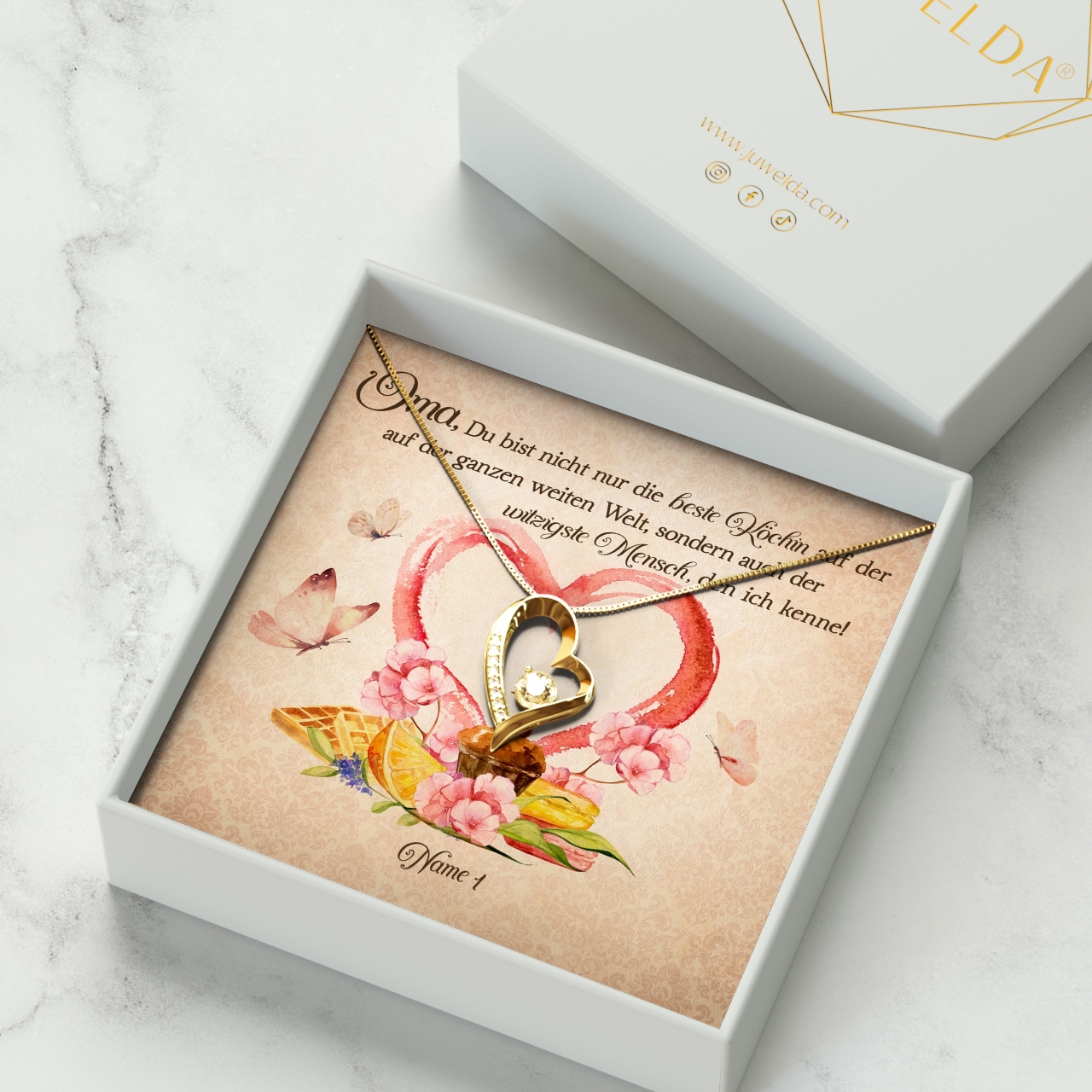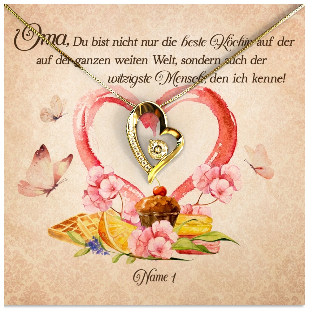 Dass die Liebe bekanntlich durch den Magen geht, ist eine globale Weisheit. Und weil Deine Oma die beste Köchin der Welt ist und Dich jeden Tag auf ein neues glücklich macht, solltest Du ihr das auch sagen. Dafür ist dieses schöne Schmuckgeschenk-Set mit einer personalisierten Grußkarte die beste Wahl. Du kannst das Design mit den leckeren Köstlichkeiten und den niedlichen Schmetterlingen mit nur wenigen Klicks mit einem oder mehreren Namen personalisieren.
