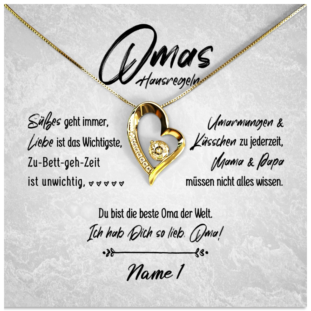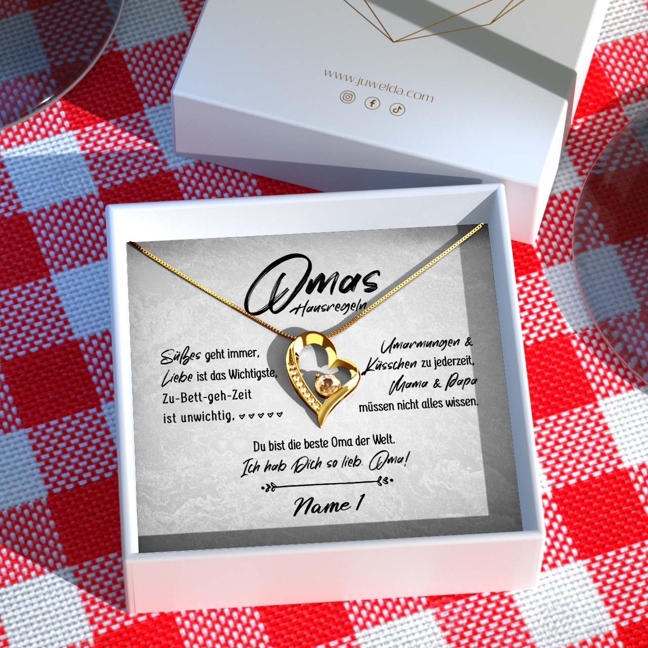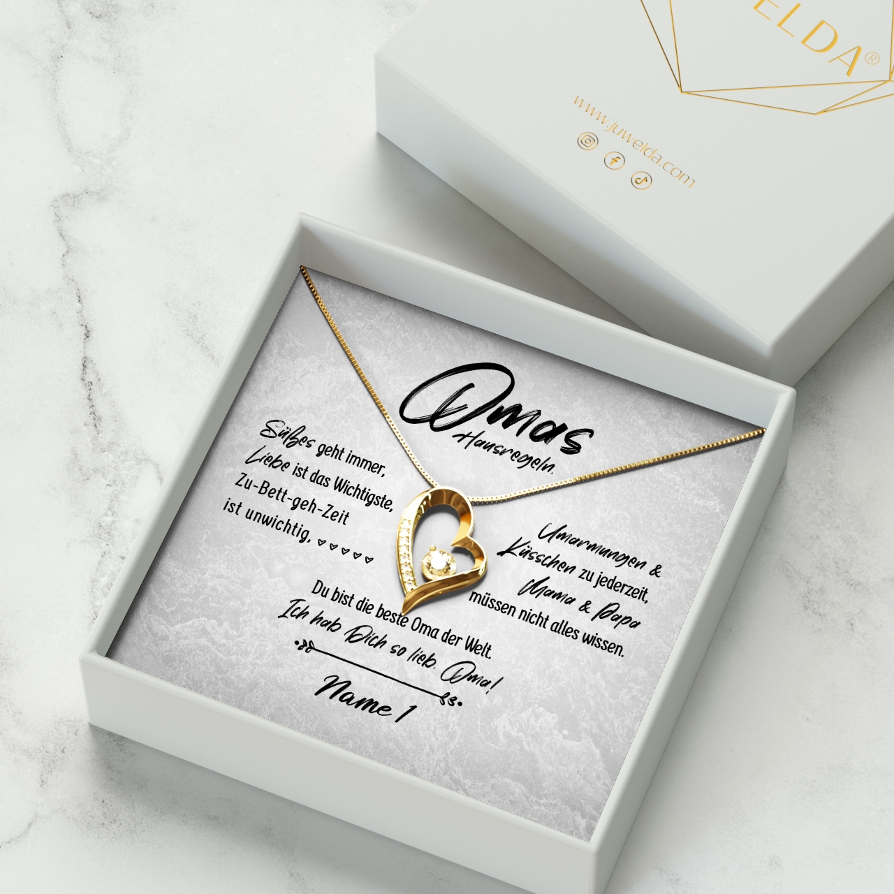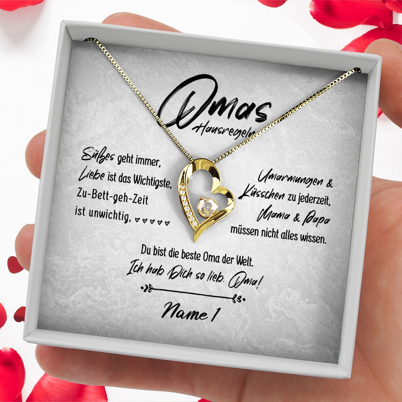 Neben der personalisierten Karte verpacken wir Dir eine Halskette aus echtem Sterling Silber in eine edle Schmuckbox. Außerdem legen wir Dir eine Geschenktasche in Dein Paket und umhüllen diese in hochwertiges Seidenpapier. Die Schleife um das Seidenpapier macht das Geschenk zu etwas sehr Besonderem. Innerhalb von 2-3 Werktagen erhältst Du Dein sehr persönliches Präsent und wirst bei Deiner Oma für viel Freude sorgen.
