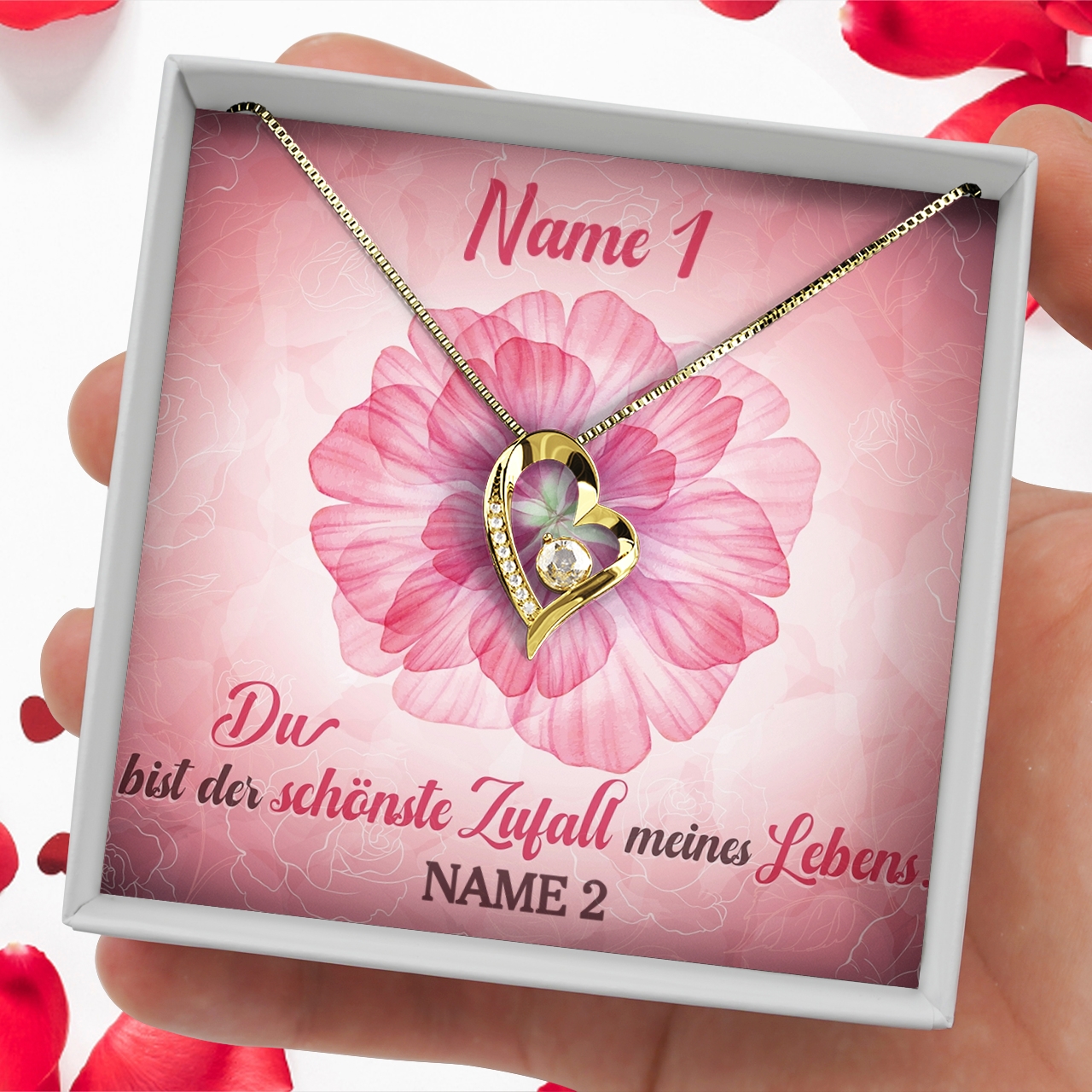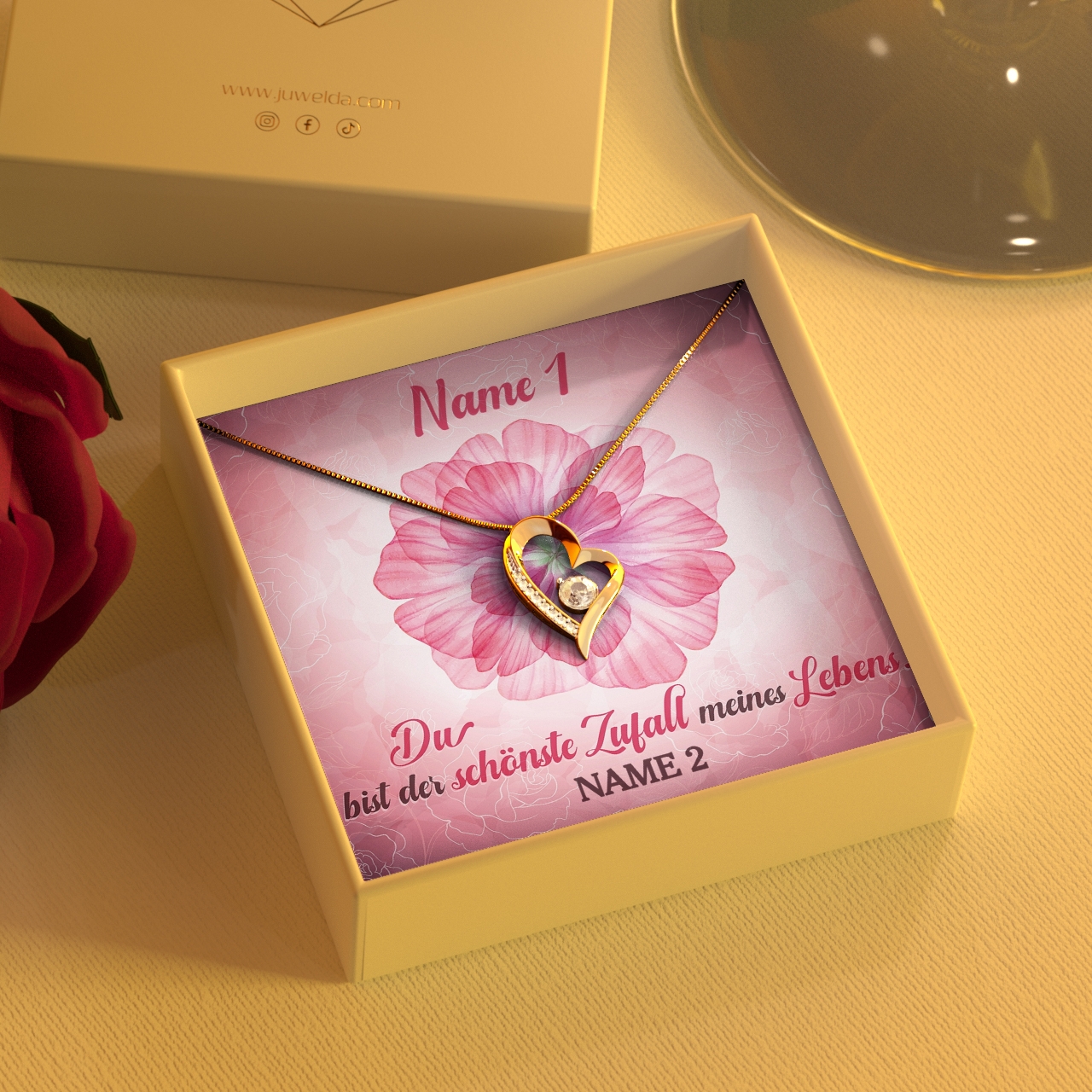 Es gibt kaum etwas Schöneres, als die Liebe seines Lebens zu finden. Überrasche Deine Partnerin zum Valentinstag mit einem Schmuckgeschenk und einer personalisierten Grußkarte. Dieses hübsche Design zeigt eine elegante Blüte, auf der das von Dir gewählte Schmuckstück liegen wird. Mach daraus ein echtes Highlight, indem Du die Grußkarte mit Euren Namen individuell anpasst.