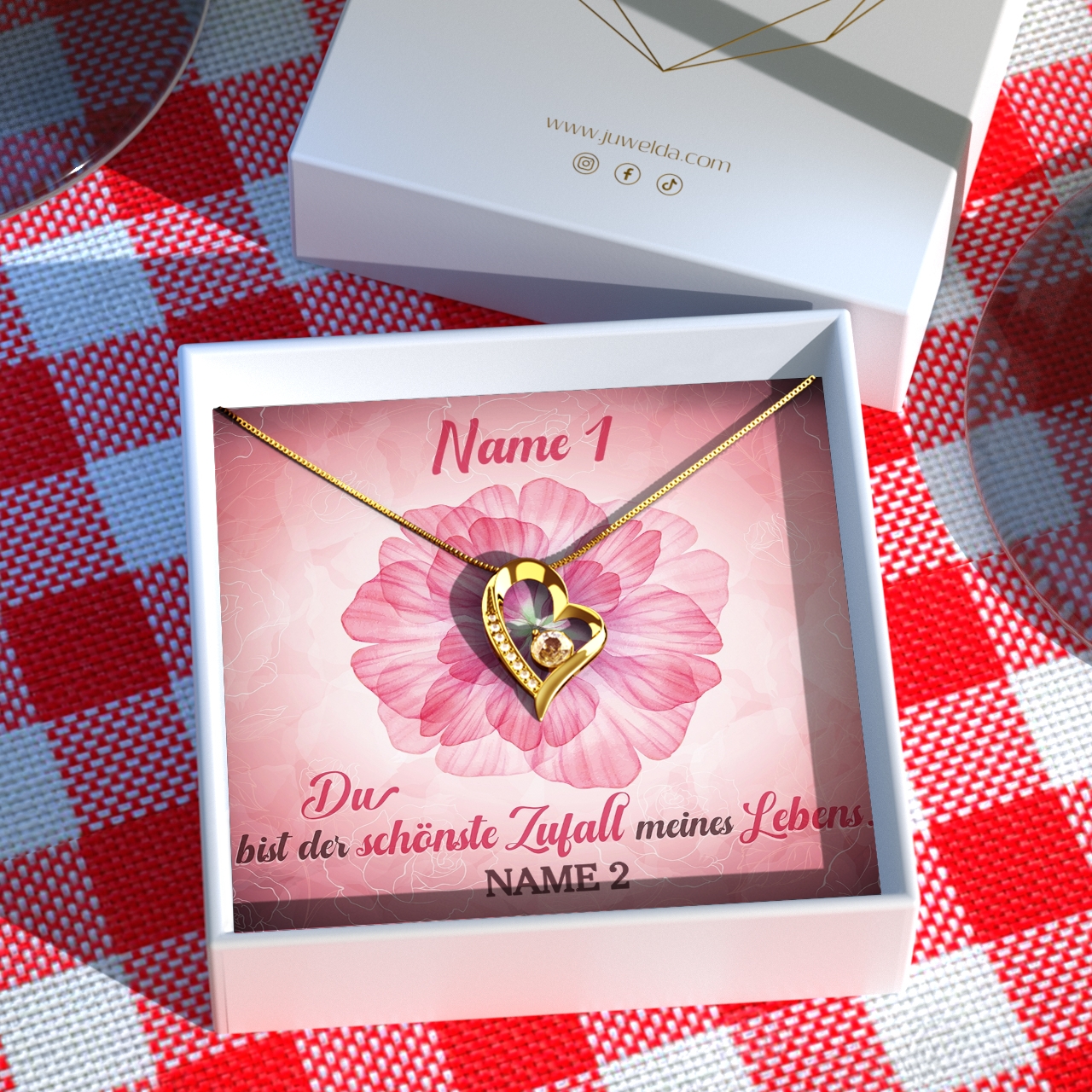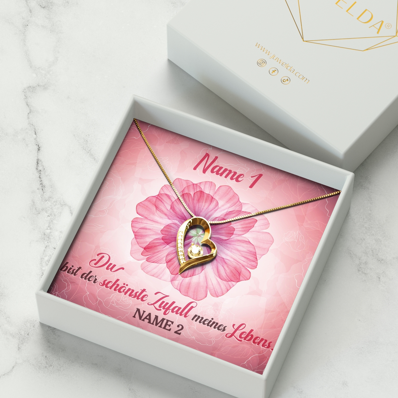 Wir drucken die personalisierte Grußkarte in brillanten Farben für Dich und legen sie zusammen mit dem schönen Schmuck in eine hochwertige Box. Dies ist aus schwarzem Kunstleder gefertigt und innen mit feinstem Samt ausgelegt. Sie eignet sich sehr gut als Dekoration auf einer Kommode oder in einem Regal. Außerdem legen wir Deiner Bestellung eine exklusive Tragetasche im eleganten Juwelda-Design bei. So kannst Du das persönliche Präsent direkt an Deine Herzdame überreichen.