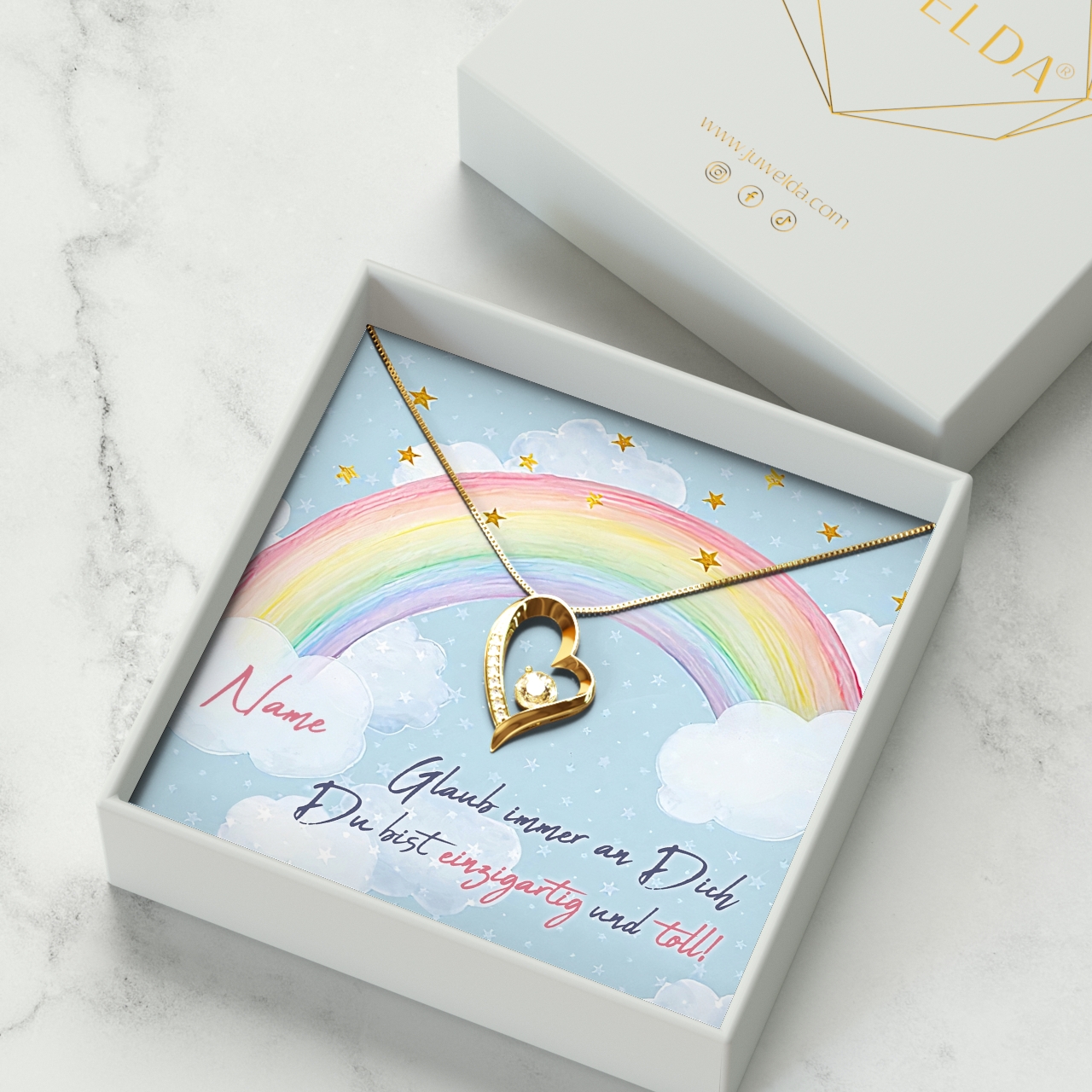 Möchtest Du Dein Geschenk sofort an Deinen Lieblingsmenschen überreichen? Dann solltest Du ein Blick auf die Variante mit der premium Geschenkverpackung werfen. Die Halskette Deiner Wahl und Deine personalisierte Karte werden liebevoll in eine hochwertige Schmuckbox mit Kunstlederüberzug und Samt-Innenbezug gelegt. Damit die Überraschung auch wirklich gut ankommt, wird alles behutsam in eine Geschenktasche gelegt, in Seidenpapier verpackt und mit einer Schleife zugebunden. Hier bekommst Du bereits einen kleinen Vorgeschmack: