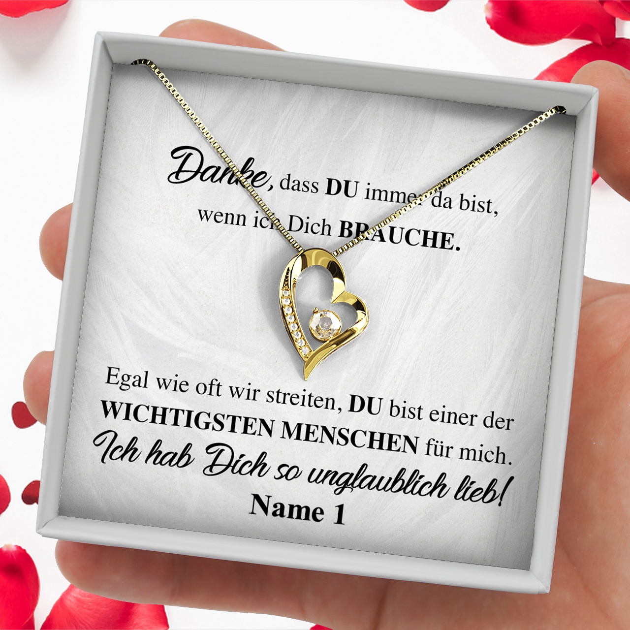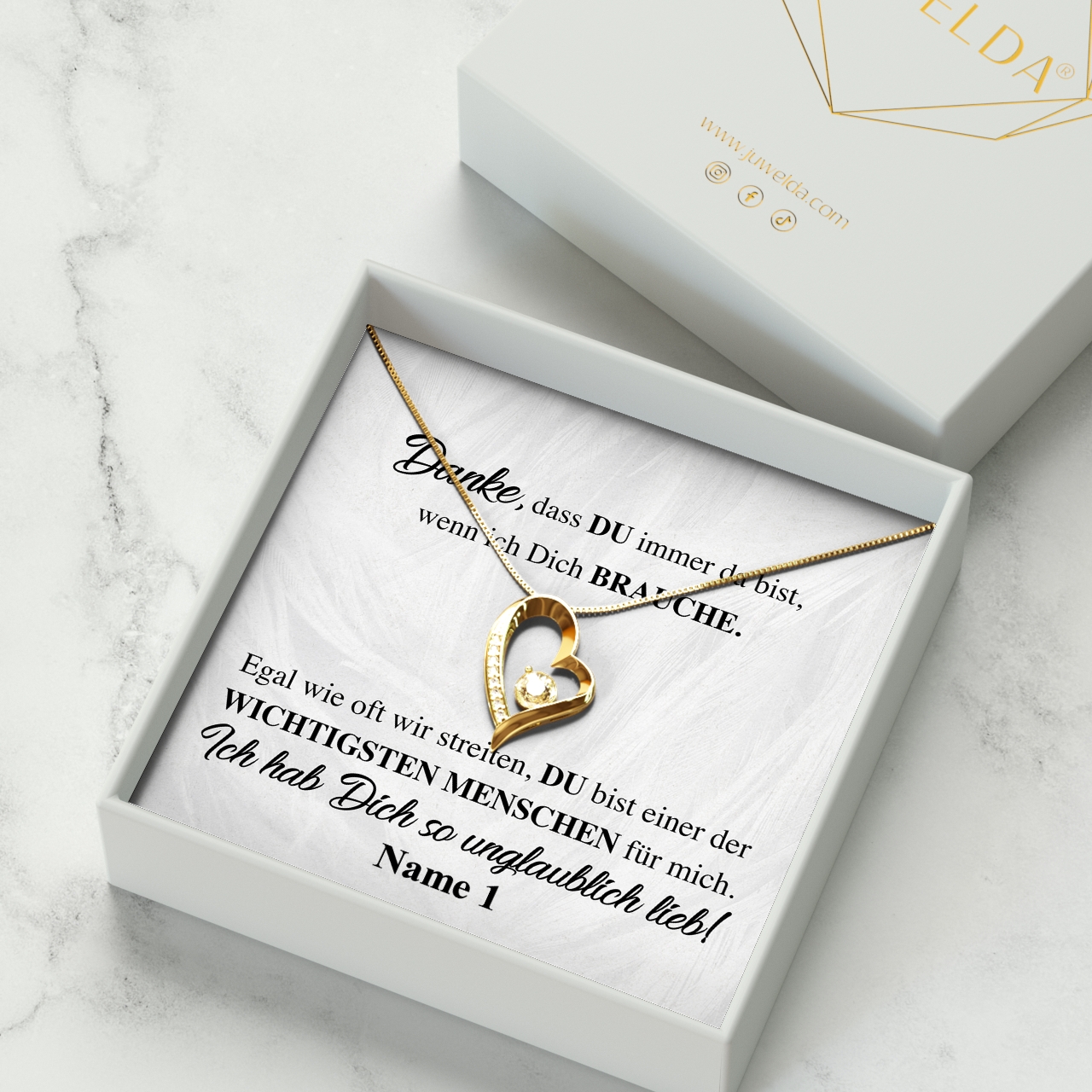 Möchtest Du Dein Geschenk sofort an Deinen Lieblingsmenschen überreichen? Dann solltest Du ein Blick auf die Variante mit der premium Geschenkverpackung werfen. Die Halskette Deiner Wahl und Deine personalisierte Karte werden liebevoll in eine hochwertige Schmuckbox mit Kunstlederüberzug und Samt-Innenbezug gelegt. Damit die Überraschung auch wirklich gut ankommt, wird alles behutsam in eine Geschenktasche gelegt, in Seidenpapier verpackt und mit einer Schleife zugebunden. Hier bekommst Du bereits einen kleinen Vorgeschmack: