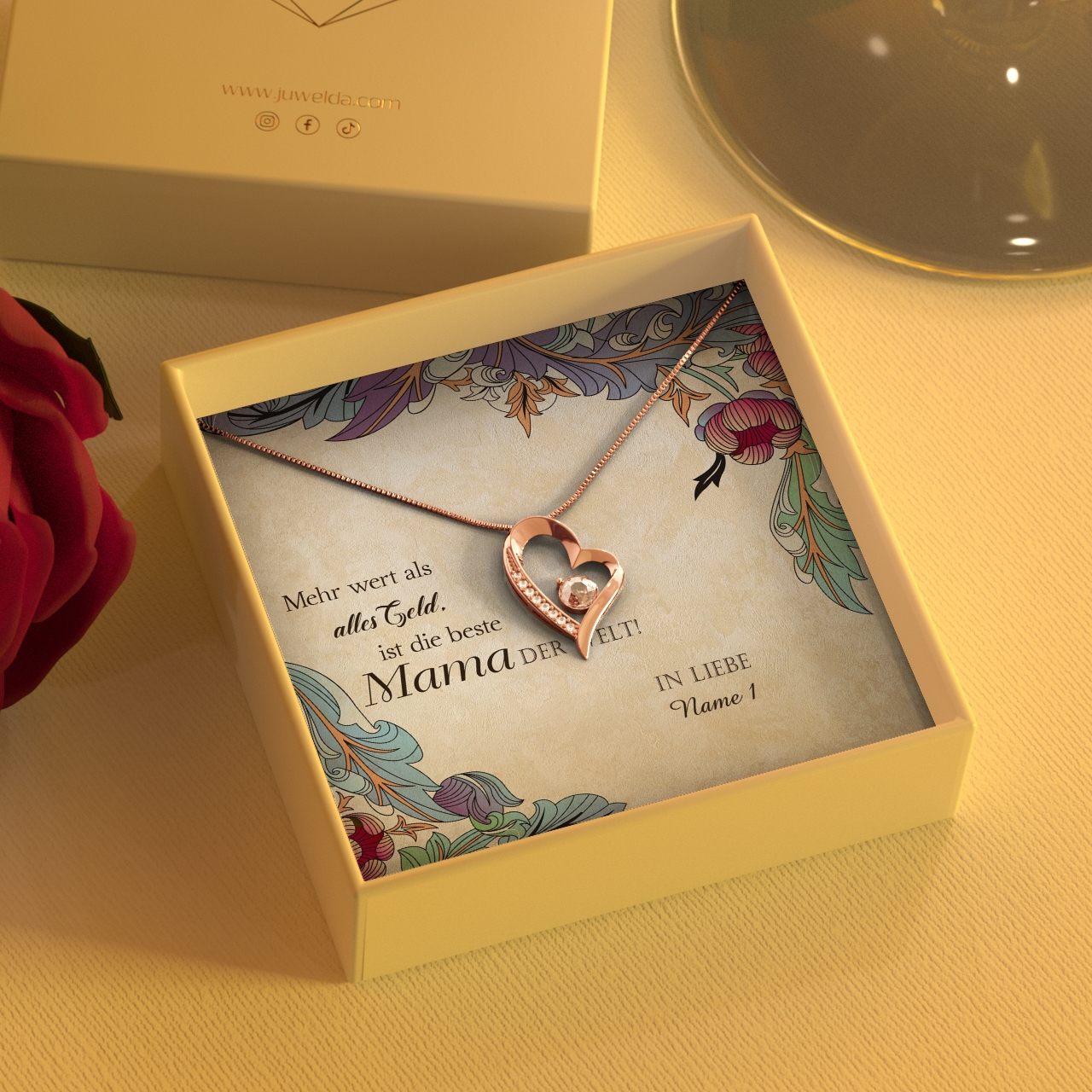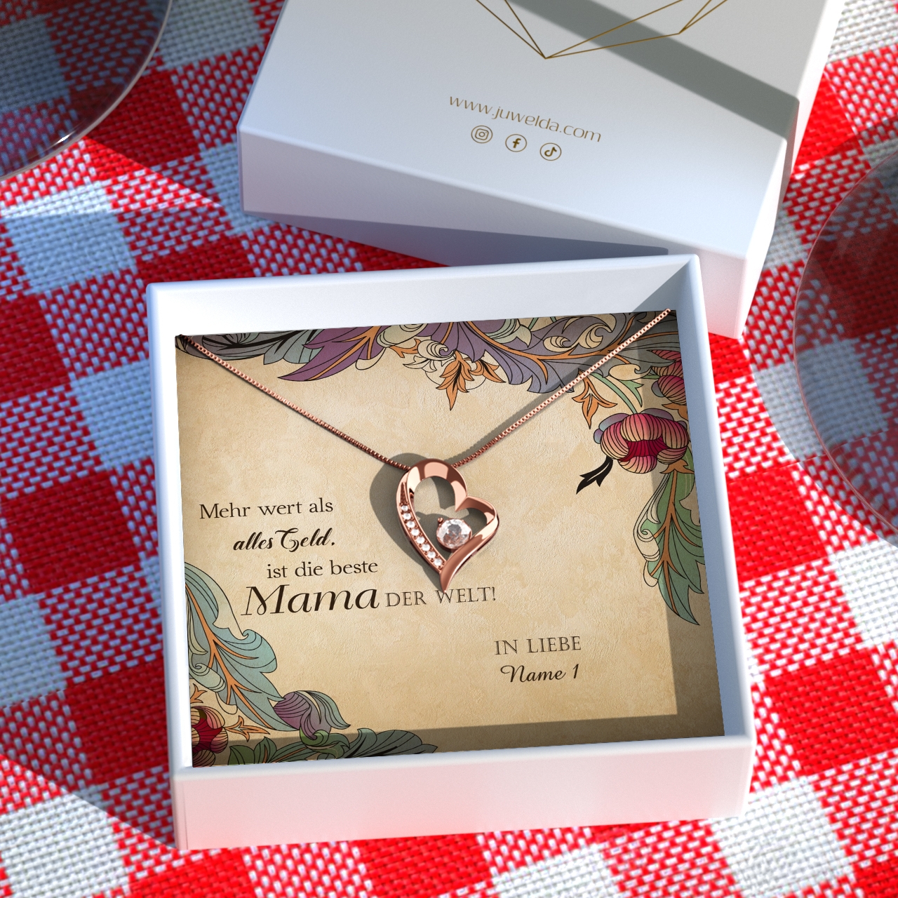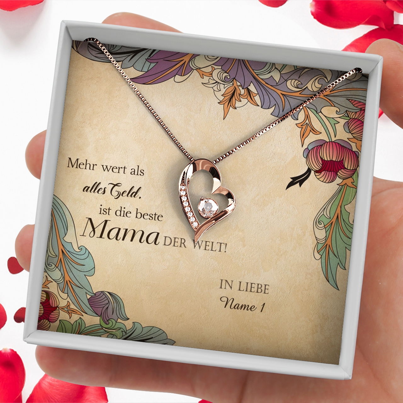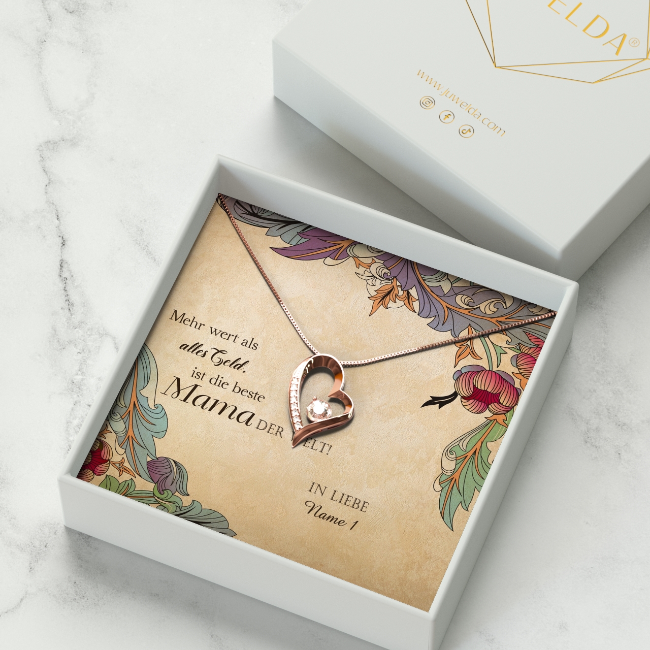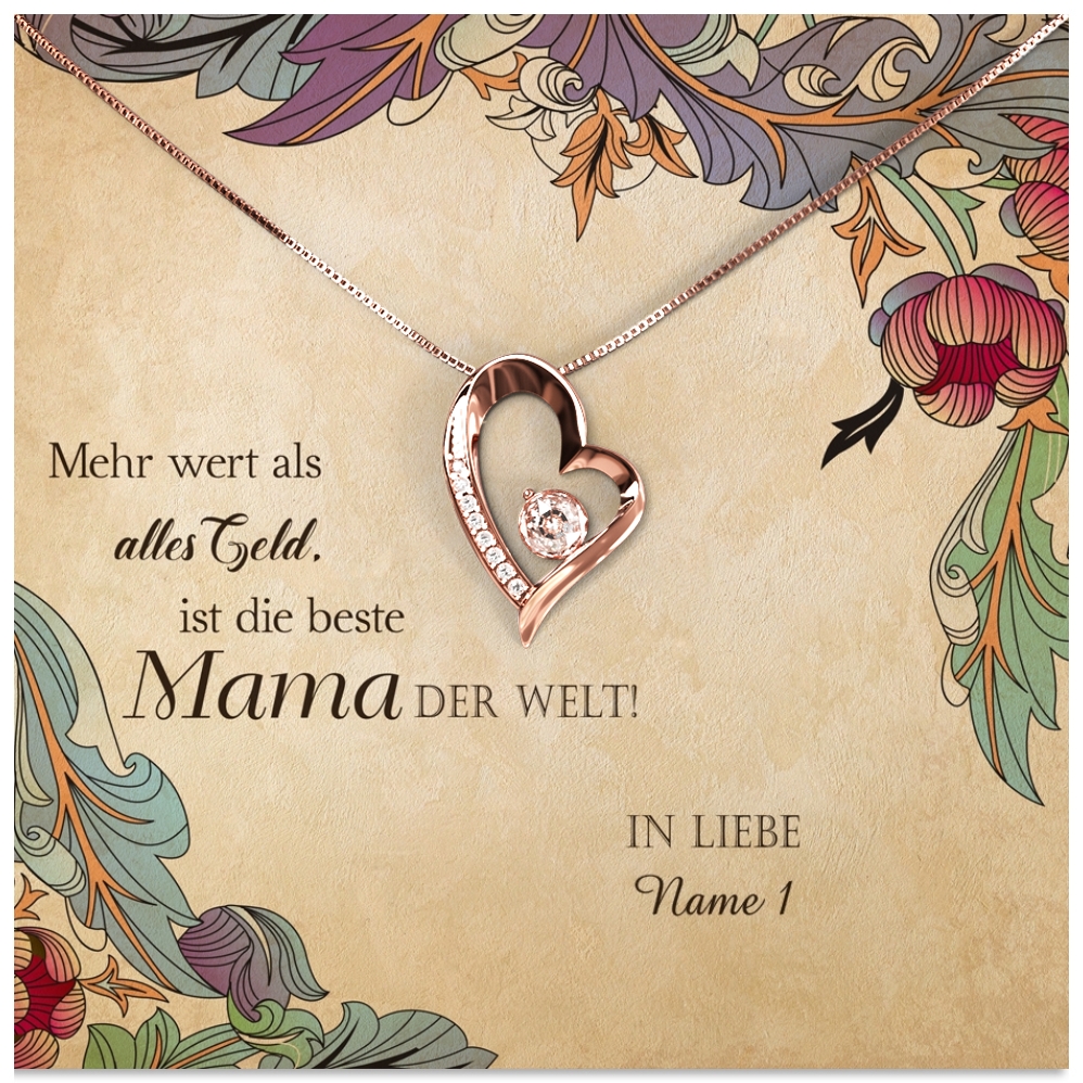 Ohne Mama wäre das Leben trist und langweilig? Sie bringt Dich zum Lachen, wenn Du traurig bist und würde mit Dir Pferde stehlen? Dann bringe sie mit einem ganz besonderen Präsent zum Staunen. Dafür kannst Du mir nur wenigen Klicks bei uns ein individuelles Geschenkpaket zusammenstellen. Die märchenhaft schönen Schmuckstücke sind in vielen Varianten im Angebot. So kannst Du ein Juwel wählen, das perfekt zu Mama passt. Das Vintage-Design dieser personalisierbaren Grußkarte ist elegant und detailliert gestaltet. Verewige Deinen Namen und auch die Namen weiterer Geschwister auf der Grußkarte.