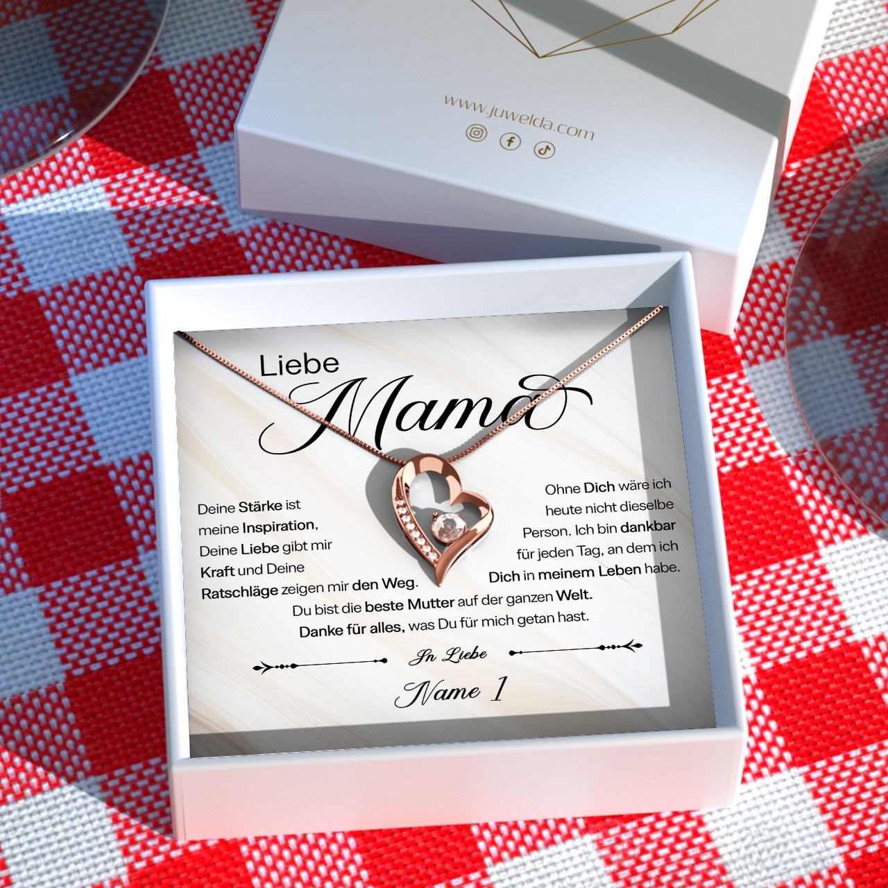Die personalisierte Karte mit Deinen Wunschnamen ist ein wahres Unikat, denn wir stellen die Karte genau nach Deinen Vorgaben und nur für Dich her. Somit erhältst Du ein Präsent, dass so besonders ist wie Deine Mutter. Damit das Geschenk auch wirklich gut ankommt, legen wir die funkelnde Halskette und die Karte in eine hochwertige Schmuckbox aus Kunstleder. Zusätzlich erhältst Du von uns eine Geschenktüte, damit Du das Geschenk sofort an Deine Mama überreichen kannst.