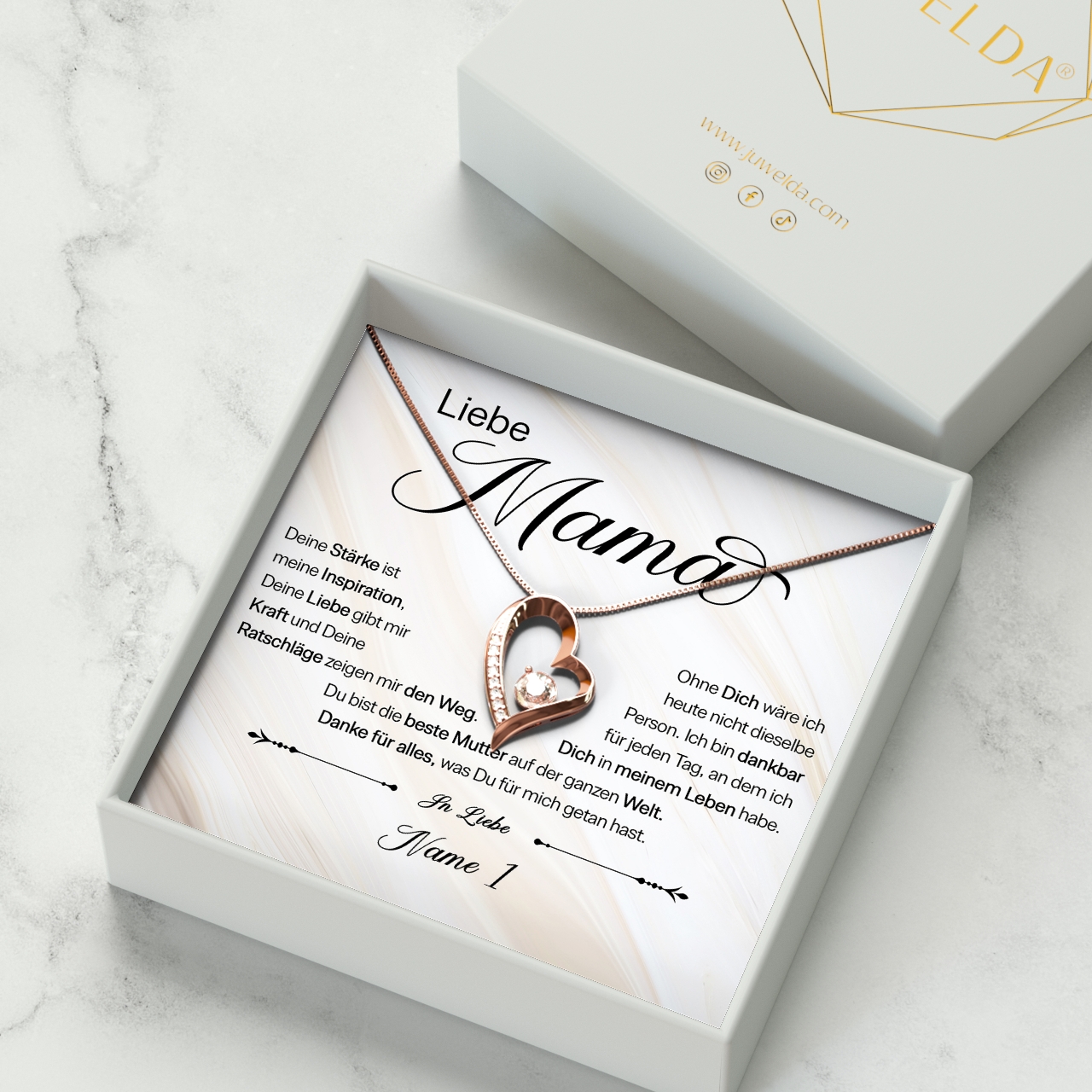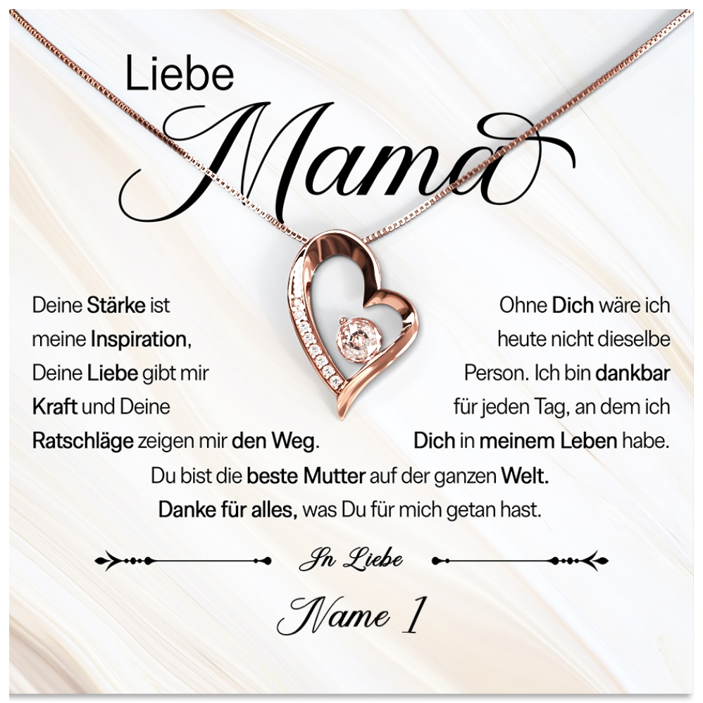 Jede Mutter ist auf ihre eigene Art und Weise einzigartig. In einem Punkt sind aber alle gleich: Sie lieben ihre Kinder, spenden Kraft und haben immer den richtigen Ratschlag. Mit unserer personalisierten Karte „Deine Stärke“ kannst Du Deiner Mama Deine Dankbarkeit zeigen. Du musst Dich nur für eine Halskette Deiner Wahl in den Farben Silber, Gold oder Roségold entscheiden und Deinen Namen in das Personalisierungsfeld eintragen. Anschließend siehst Du in der Live-Vorschau, wie Dein persönliches Geschenk aussehen wird.