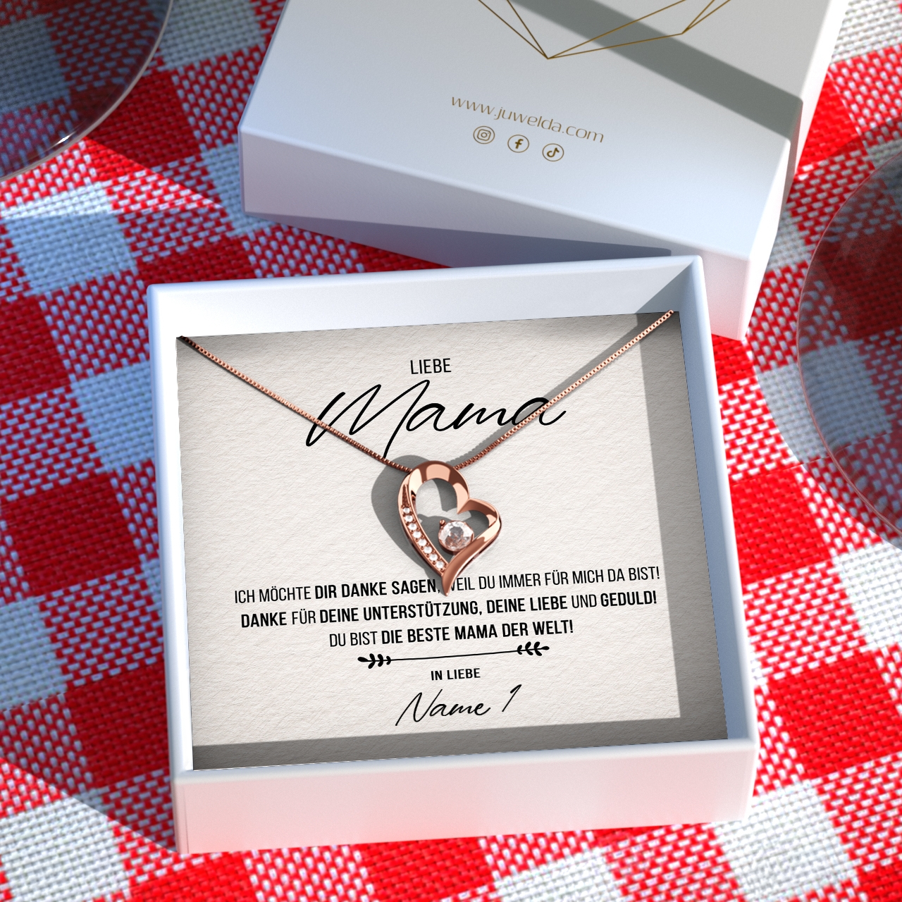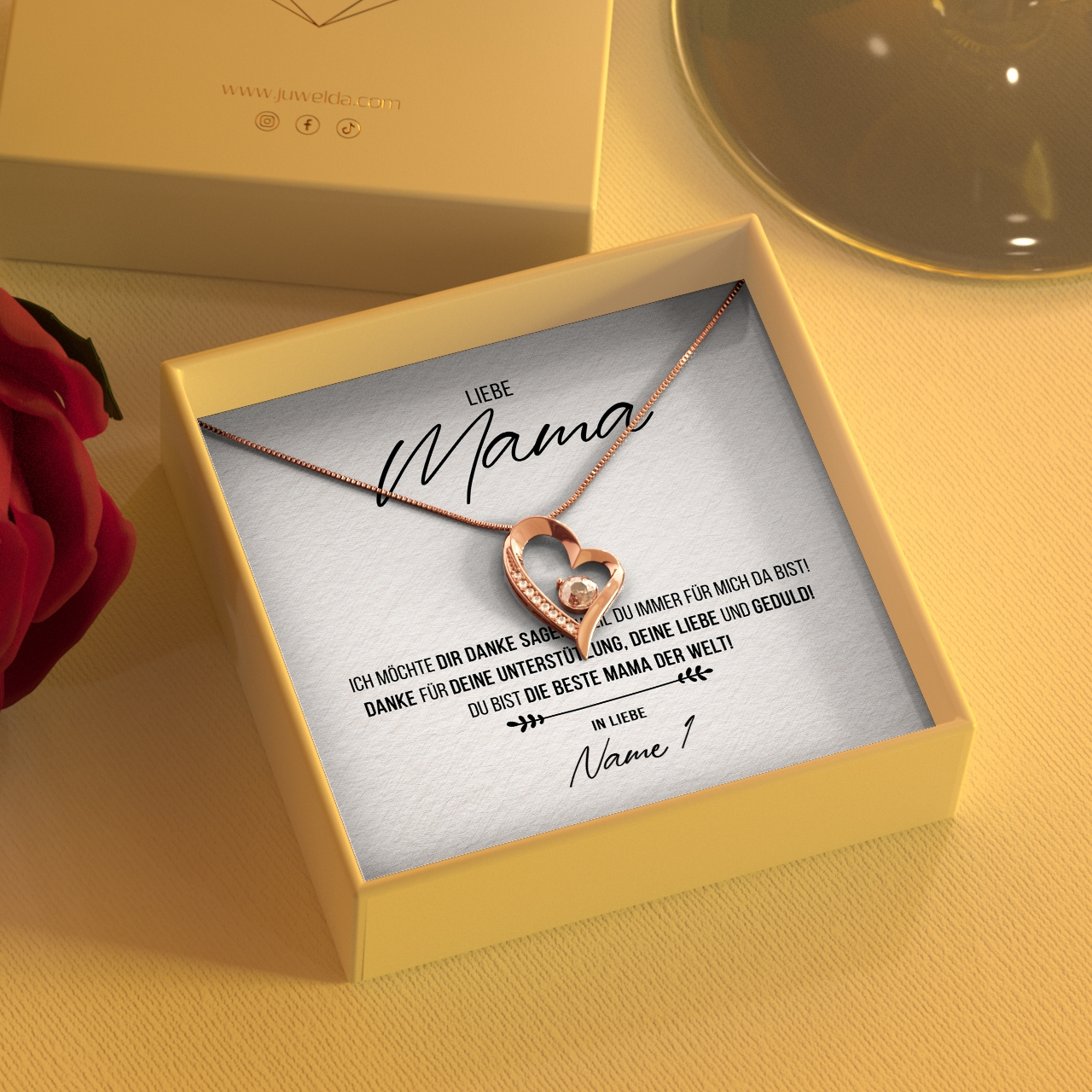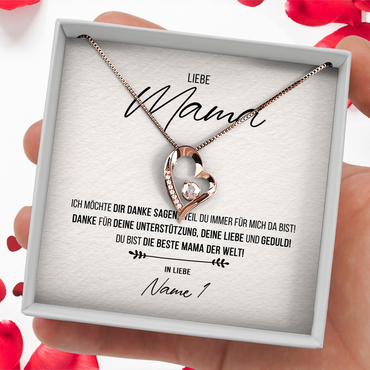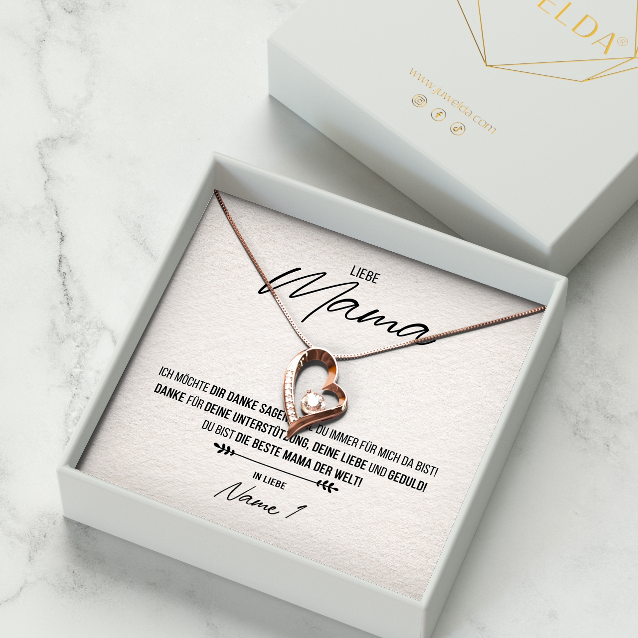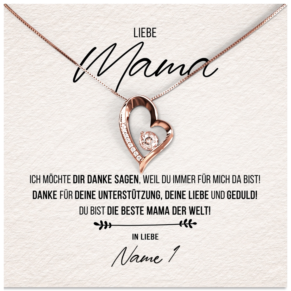 Wir liefern Dir eine hochwertige Halskette aus echtem 925 Sterling Silber in den Farben Silber, Gelbgold oder Rosegold. Außerdem legen wir Deine personalisierte Karte zusammen mit der Halskette in eine exklusive Schmuckbox aus Kunstleder. Um Deiner Mutter eine wirklich große Freude bereiten zu können, legen wir eine schöne Geschenktasche in Dein Paket. Damit hast Du die Möglichkeit, Dein sehr persönliches Geschenk sofort nach Erhalt Deiner Bestellung an Deine geliebte Mama zu übergeben.