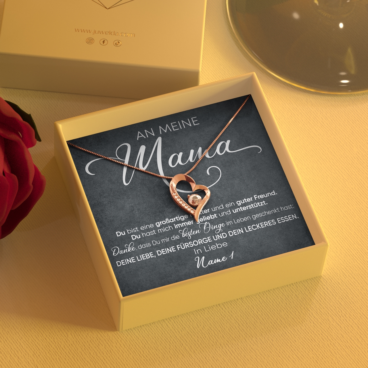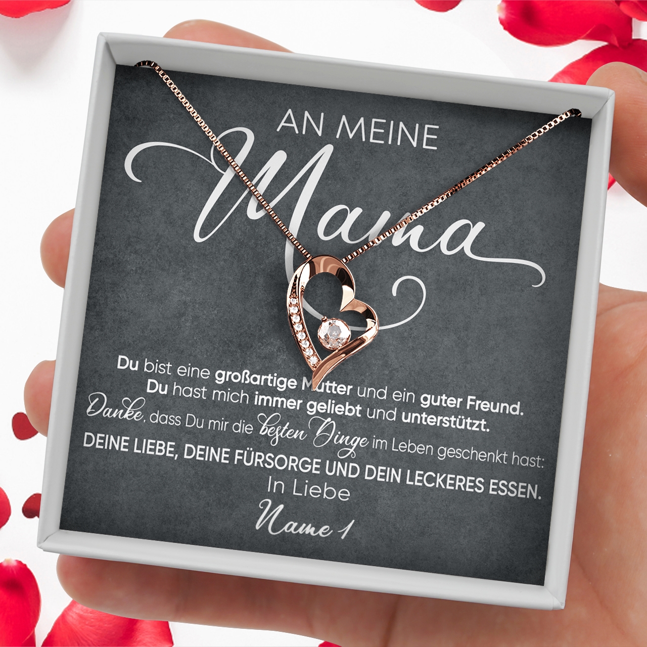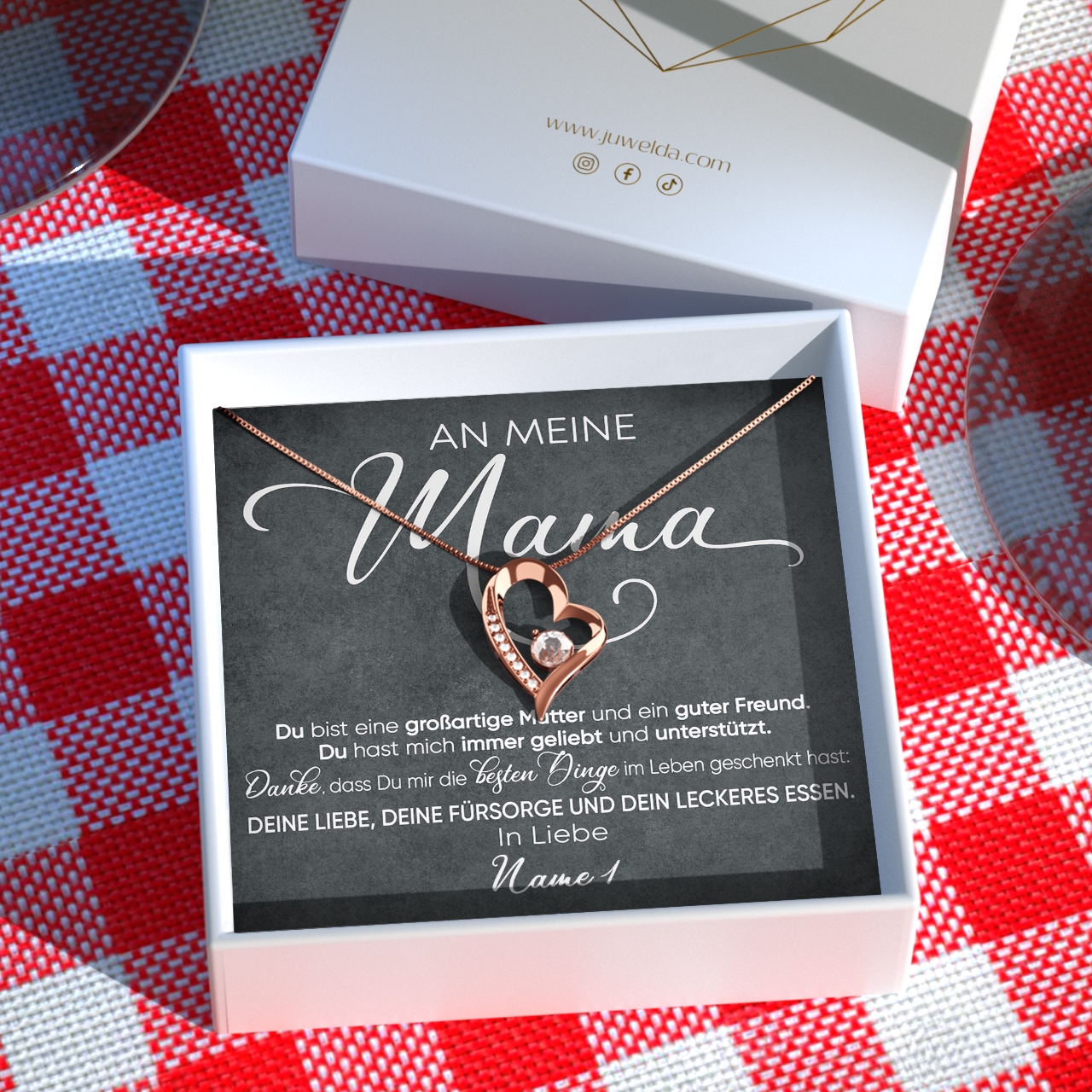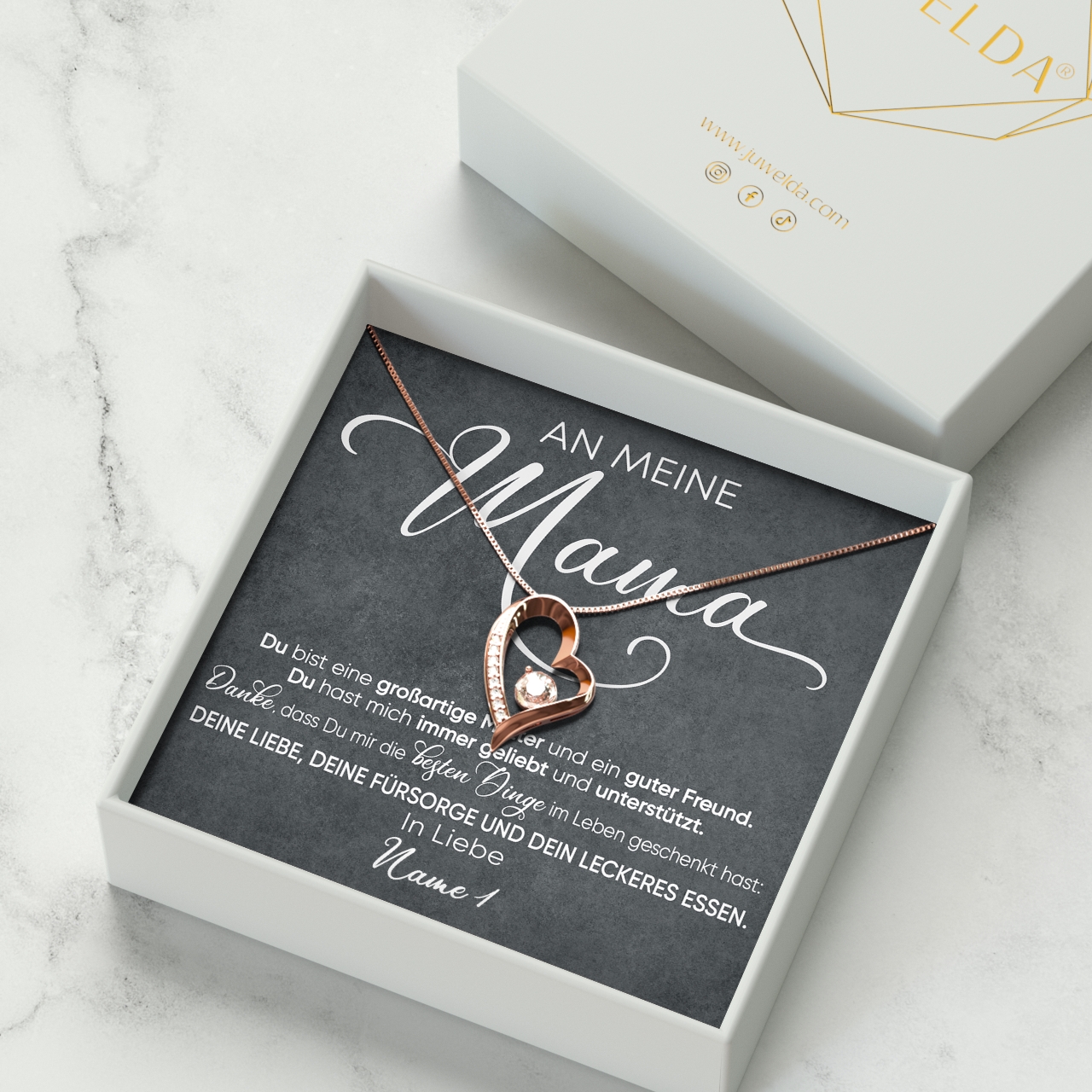 In unserer kleinen Schmuckmanufaktur im schönen Westerwald wird Dein individuelles Geschenk von Hand verpackt. Dabei legen wir die funkelnde Halskette und die personalisierte Karte in eine hochwertige Schmuckbox und platzieren diese in einer schönen Geschenktüte. Somit kannst Du Dein Geschenk sofort an Deine Mama übergeben und Dir Ihre Reaktion anschauen.