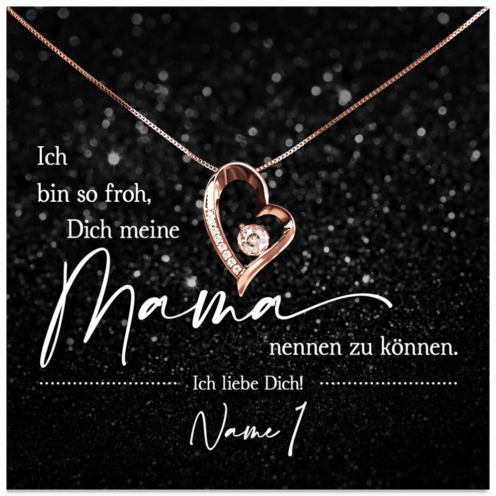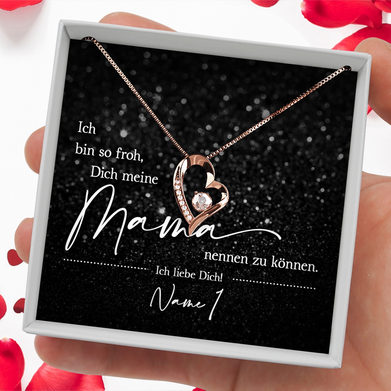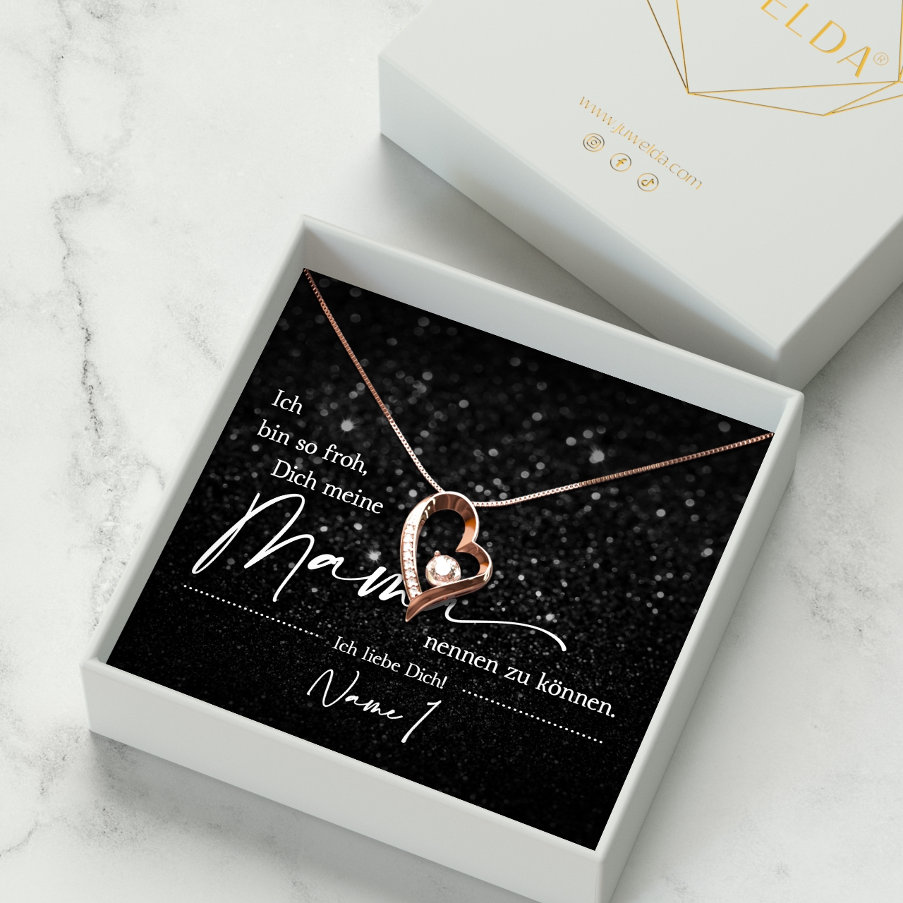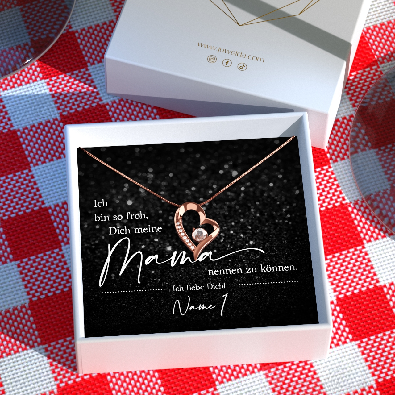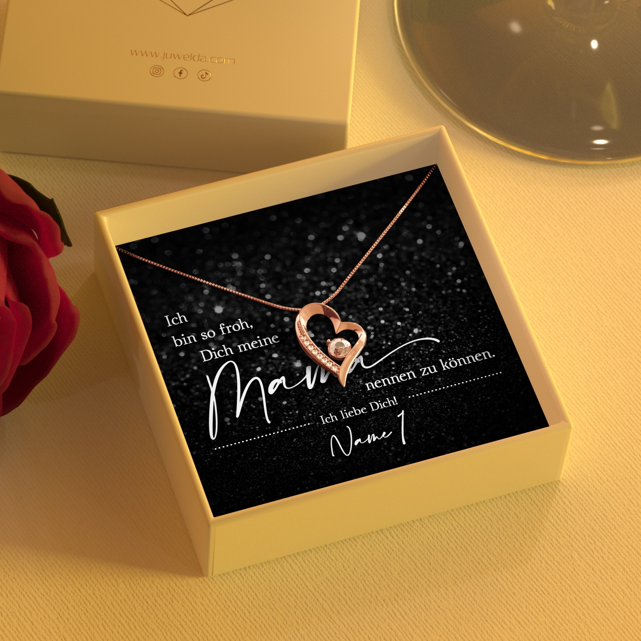 In dem Geschenkset ist eine Halskette aus 925 Sterling Silber, Deine personalisierte Karte und eine hochwertige Schmuckbox aus Kunstleder enthalten. Zusätzlich erhältst Du eine edle Geschenktasche, damit Du Dein Geschenk sofort an Deine Mama verschenken kannst. Wir verpacken Dein persönliches Geschenk von Hand in unserer kleinen Schmuckmanufaktur im schönen Westerwald.