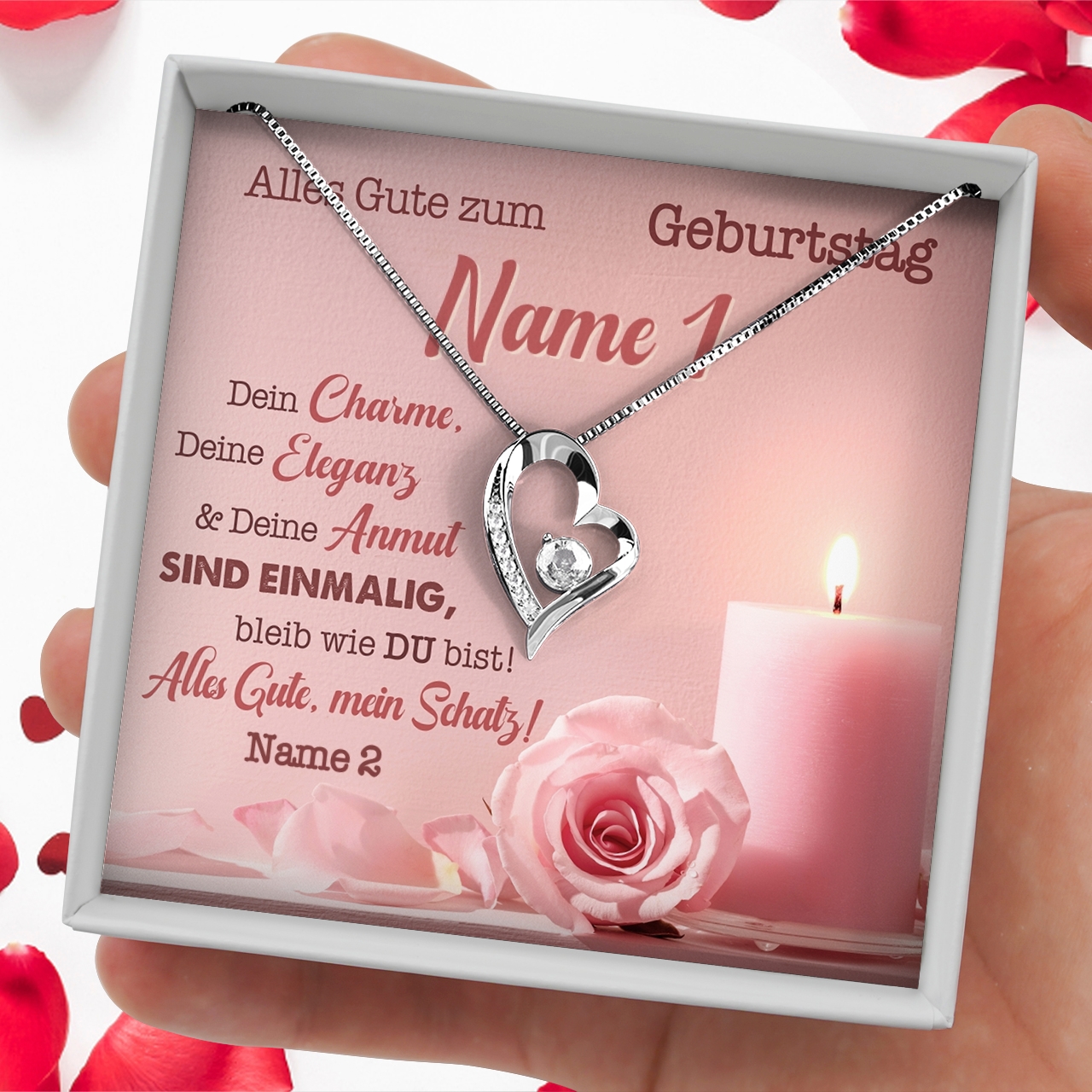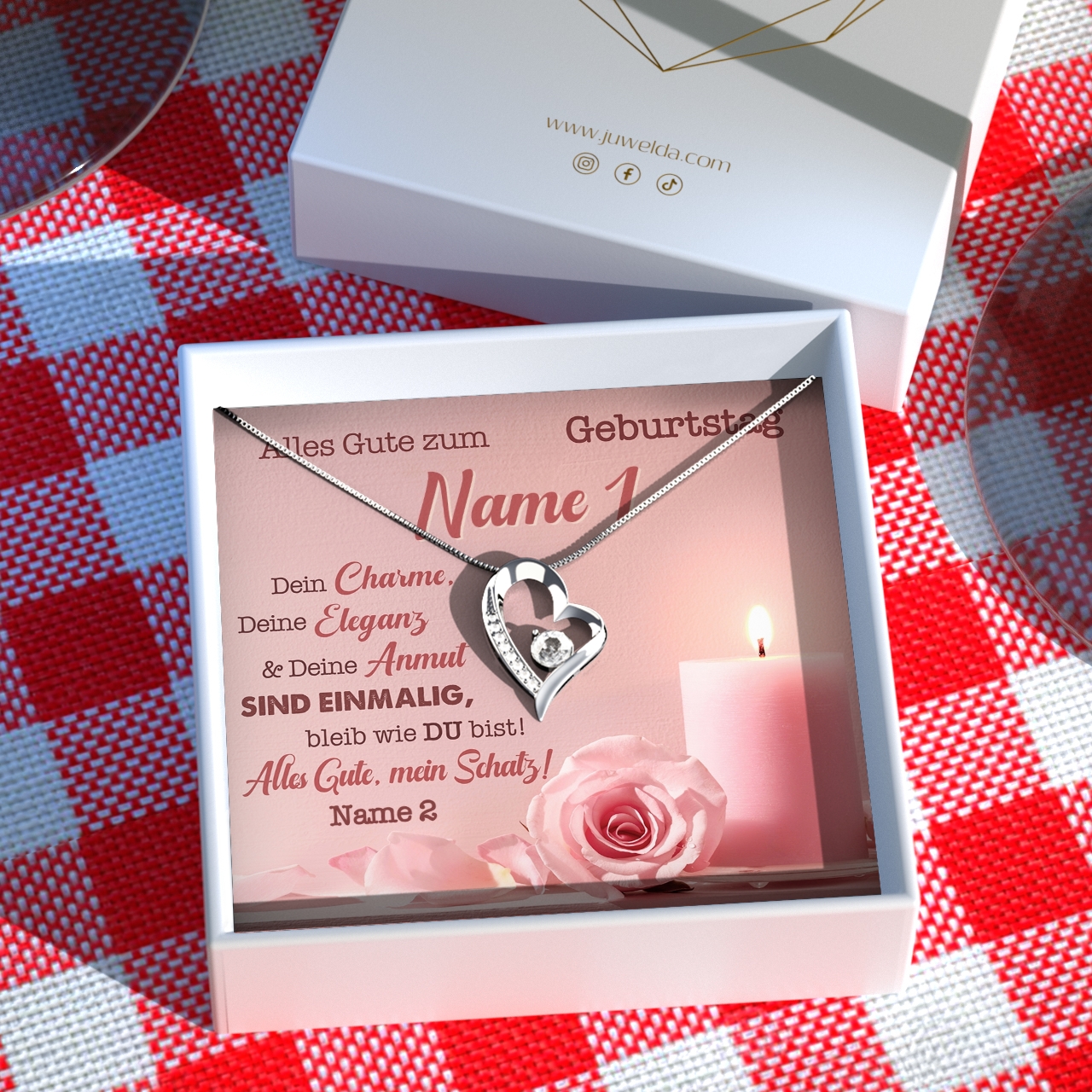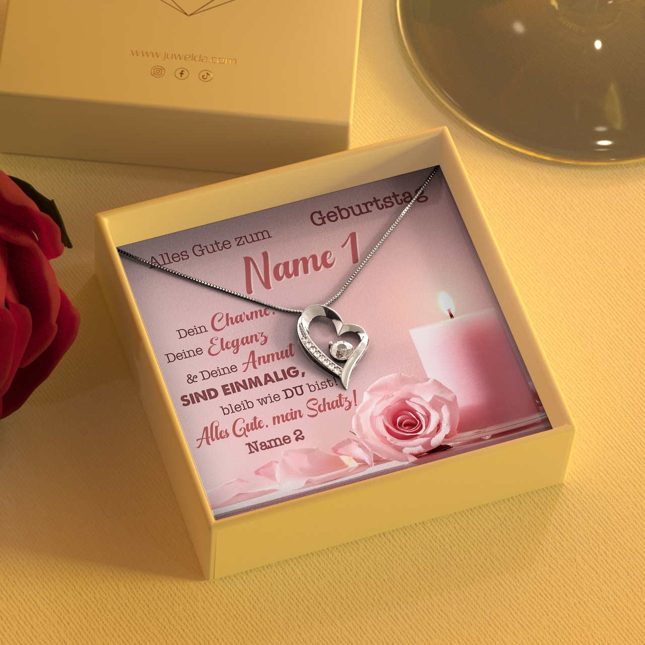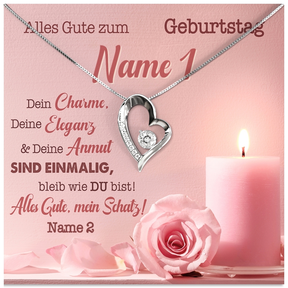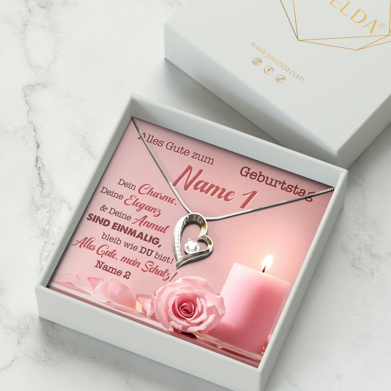 Deine Freundin hat Geburtstag und in diesem Jahr möchtest Du sie mit einem sehr besonderen Geschenk beglücken? Überreiche ihr ein Schmuckstück unserer Kollektion mit einer personalisierten Grußkarte. Auf der Geburtstagskarte „Bleib wie Du bist“ kannst Du nicht nur Eure Namen verewigen, sondern auch das Alter. So wird aus dem Geschenkset eine wunderbare Erinnerung, die lange Freude bereitet. Das Design ist in elegantem Rosa gehalten. Die Kerze steht für das Lebenslicht und die Rose symbolisiert Eure Liebe füreinander.