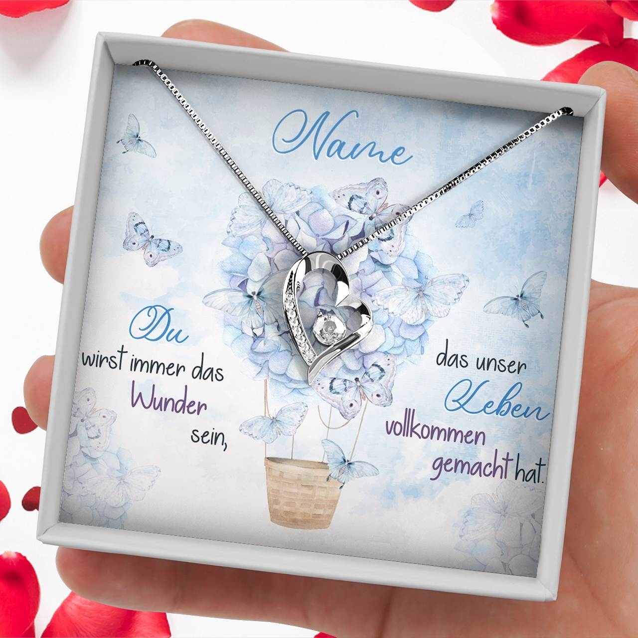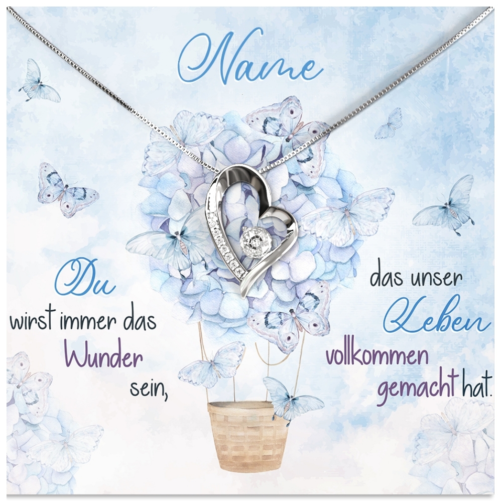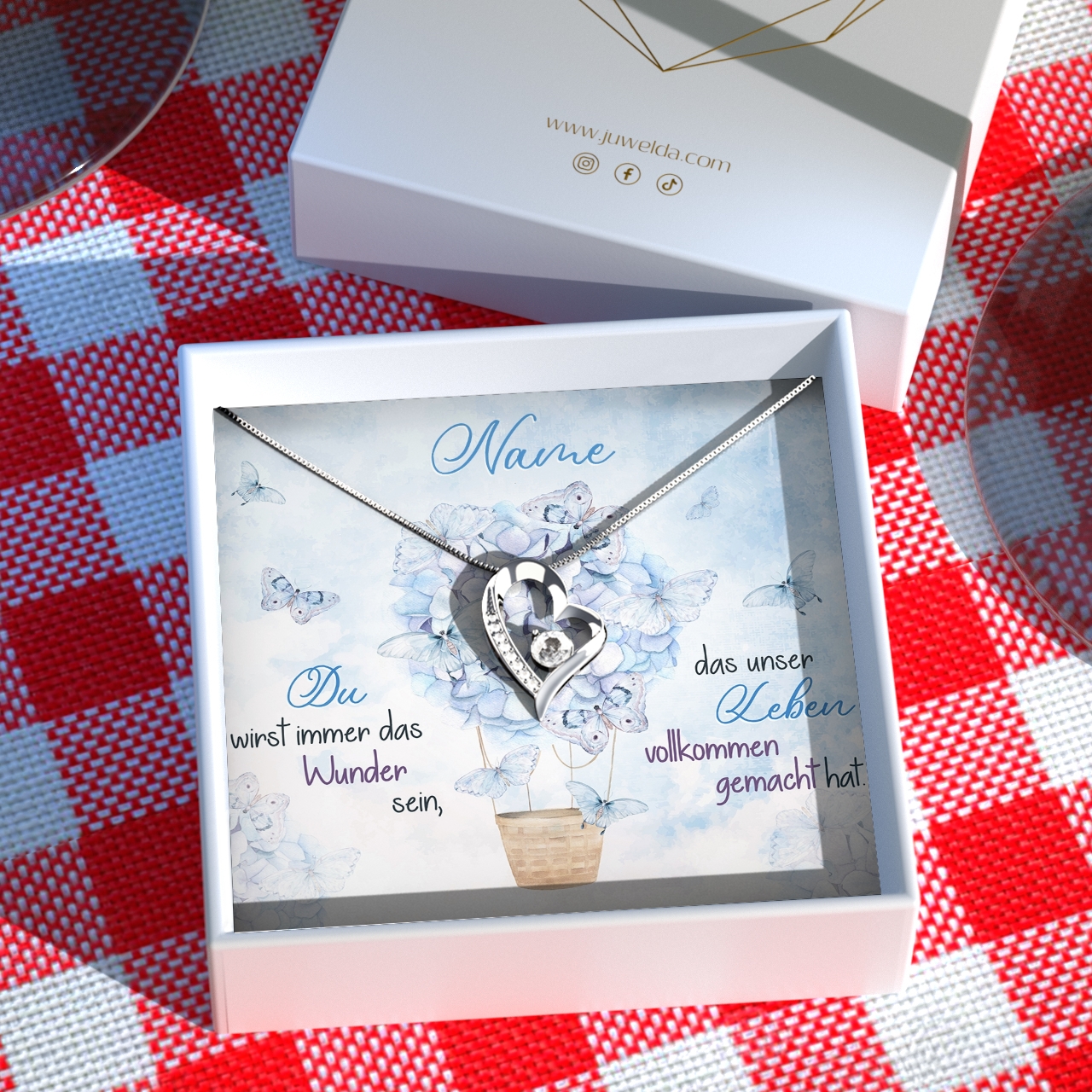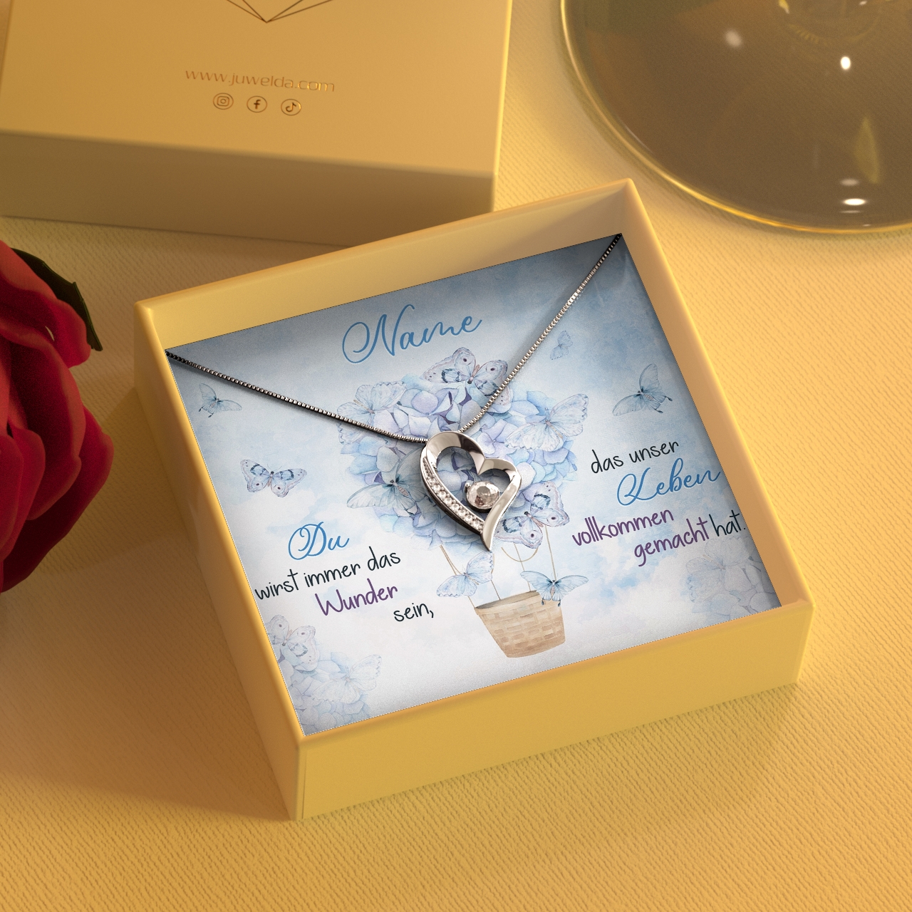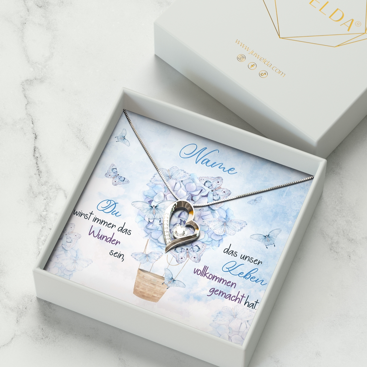 Möchtest Du Dein Geschenk sofort an Deinen Lieblingsmenschen überreichen? Dann solltest Du ein Blick auf die Variante mit der premium Geschenkverpackung werfen. Die Halskette Deiner Wahl und Deine personalisierte Karte werden liebevoll in eine hochwertige Schmuckbox mit Kunstlederüberzug und Samt-Innenbezug gelegt. Damit die Überraschung auch wirklich gut ankommt, wird alles behutsam in eine Geschenktasche gelegt, in Seidenpapier verpackt und mit einer Schleife zugebunden. Hier bekommst Du bereits einen kleinen Vorgeschmack: