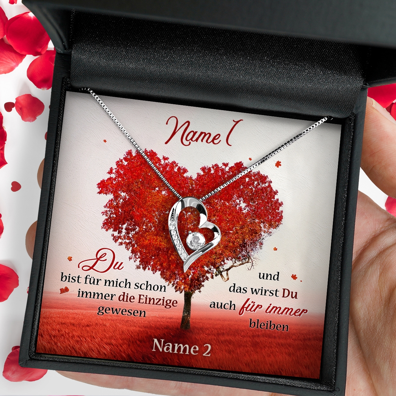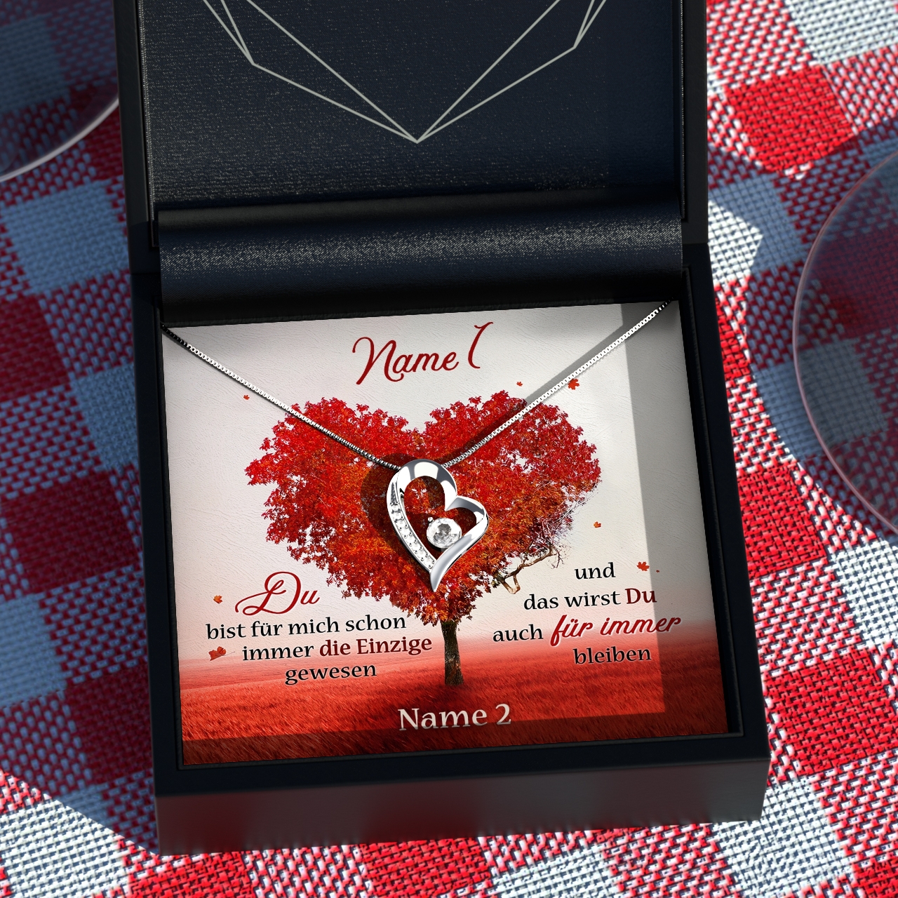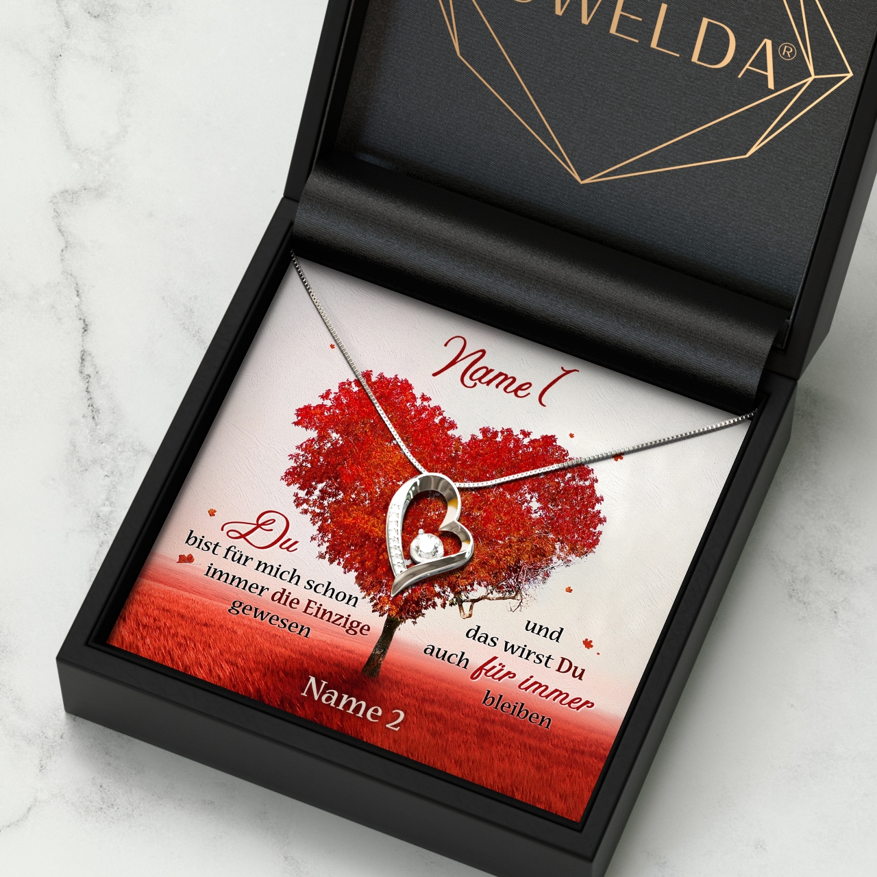 Möchtest Du Dein Geschenk sofort an Deinen Lieblingsmenschen überreichen? Dann solltest Du ein Blick auf die Variante mit der premium Geschenkverpackung werfen. Die Halskette Deiner Wahl und Deine personalisierte Karte werden liebevoll in eine hochwertige Schmuckbox mit Kunstlederüberzug und Samt-Innenbezug gelegt. Damit die Überraschung auch wirklich gut ankommt, wird alles behutsam in eine Geschenktasche gelegt, in Seidenpapier verpackt und mit einer Schleife zugebunden. Hier bekommst Du bereits einen kleinen Vorgeschmack: