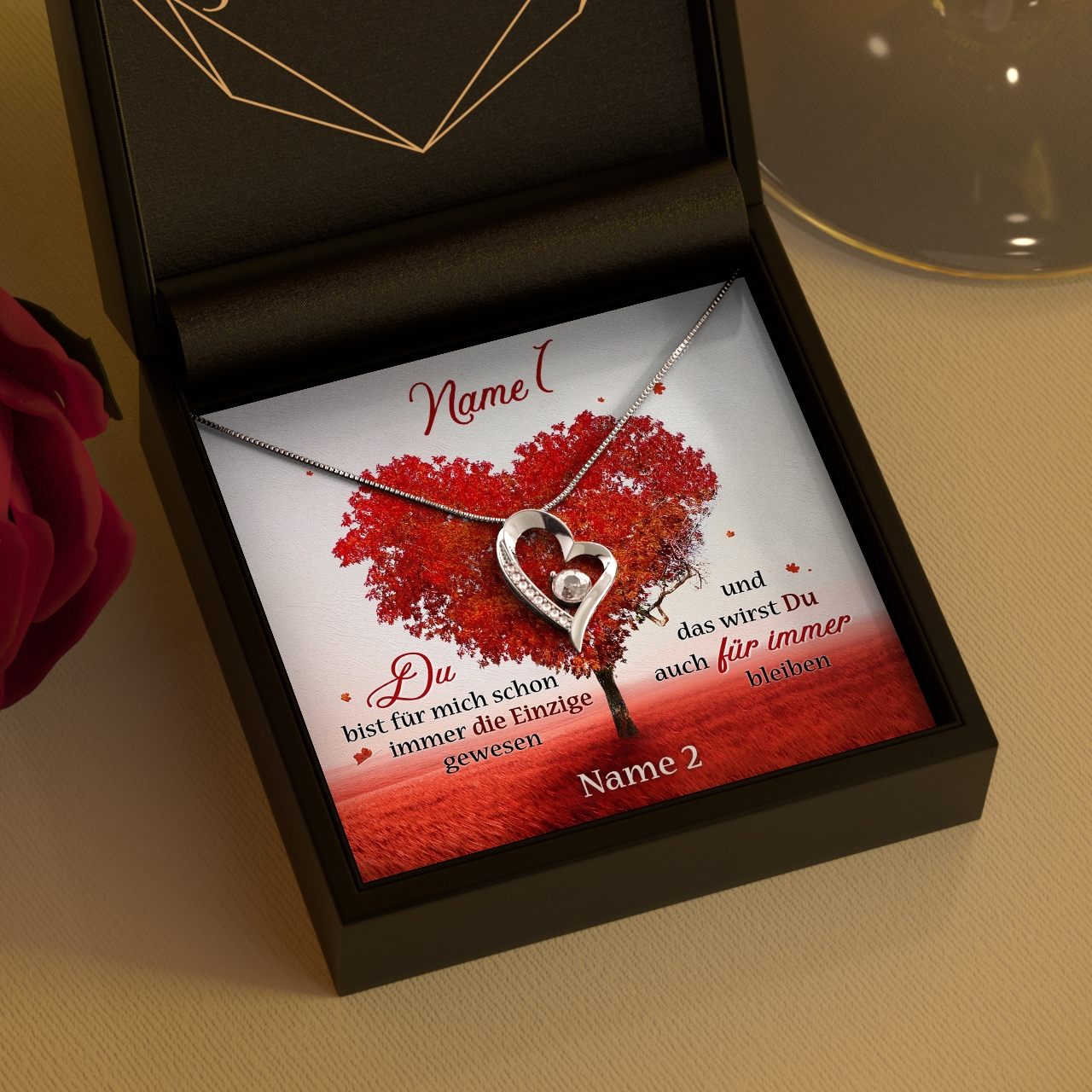 Damit Dein Präsent absolut individuell ist, kannst Du den Namen Deines Schatzes und Deinen Namen auf der Karte verewigen lassen. Nutze die Vorschau, um die fertige Karte schon vor der Bestellung zu sehen. Wenn Du Dich für Dein einzigartiges Geschenk entschieden hast, liefern wir Dir dieses in einer hochwertigen Geschenktasche. Überreiche Dein Präsent und mach die wichtigste Frau in Deinem Leben glücklich.