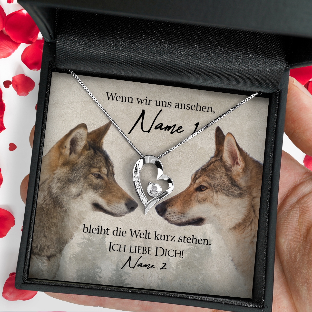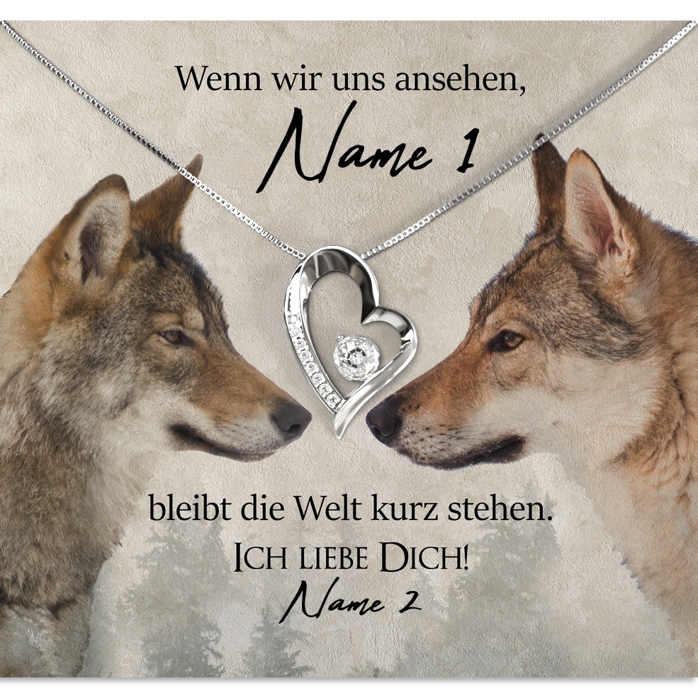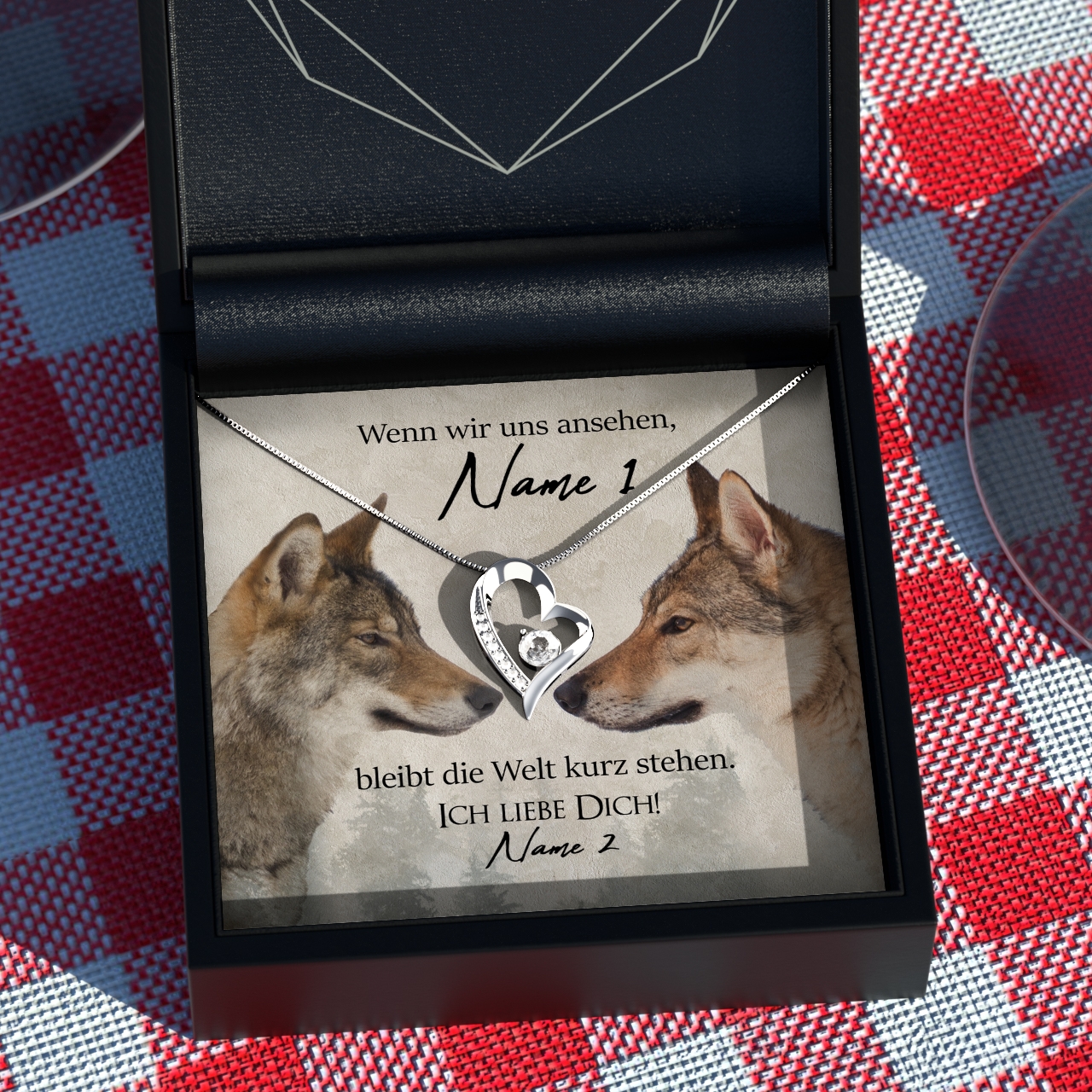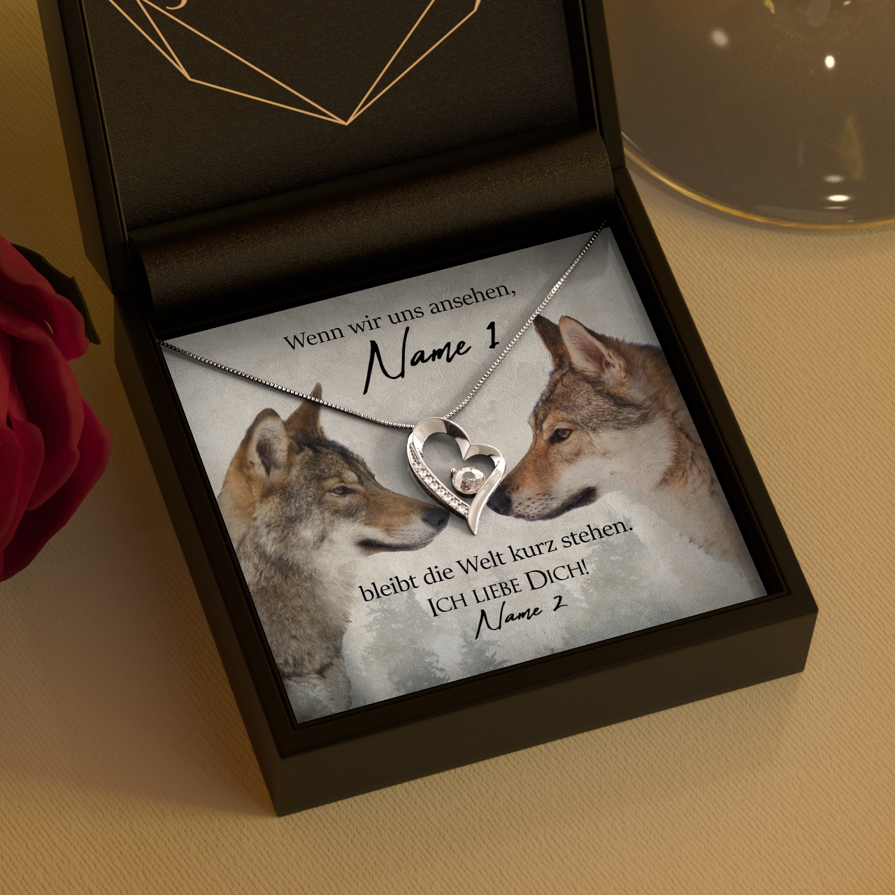 Gib bei der Bestellung einfach den Namen Deiner Herzdame an und wir kümmern uns um den Rest. Innerhalb weniger Tage ist das exklusive Geschenkset bei Dir. Der Schmuck und die personalisierte Grußkarte werden sorgfältig in eine hochwertige Schmuckbox verpackt. Die Box ist aus Kunstleder gefertigt und mit luxuriösem Samt ausgelegt. Überreiche die Überraschung in unserer hübschen Geschenktüte, die bei der Lieferung gratis beiliegt. Lass Eure Liebe mit unserer Geschenk-Box weiter wachsen und noch stärker werden.