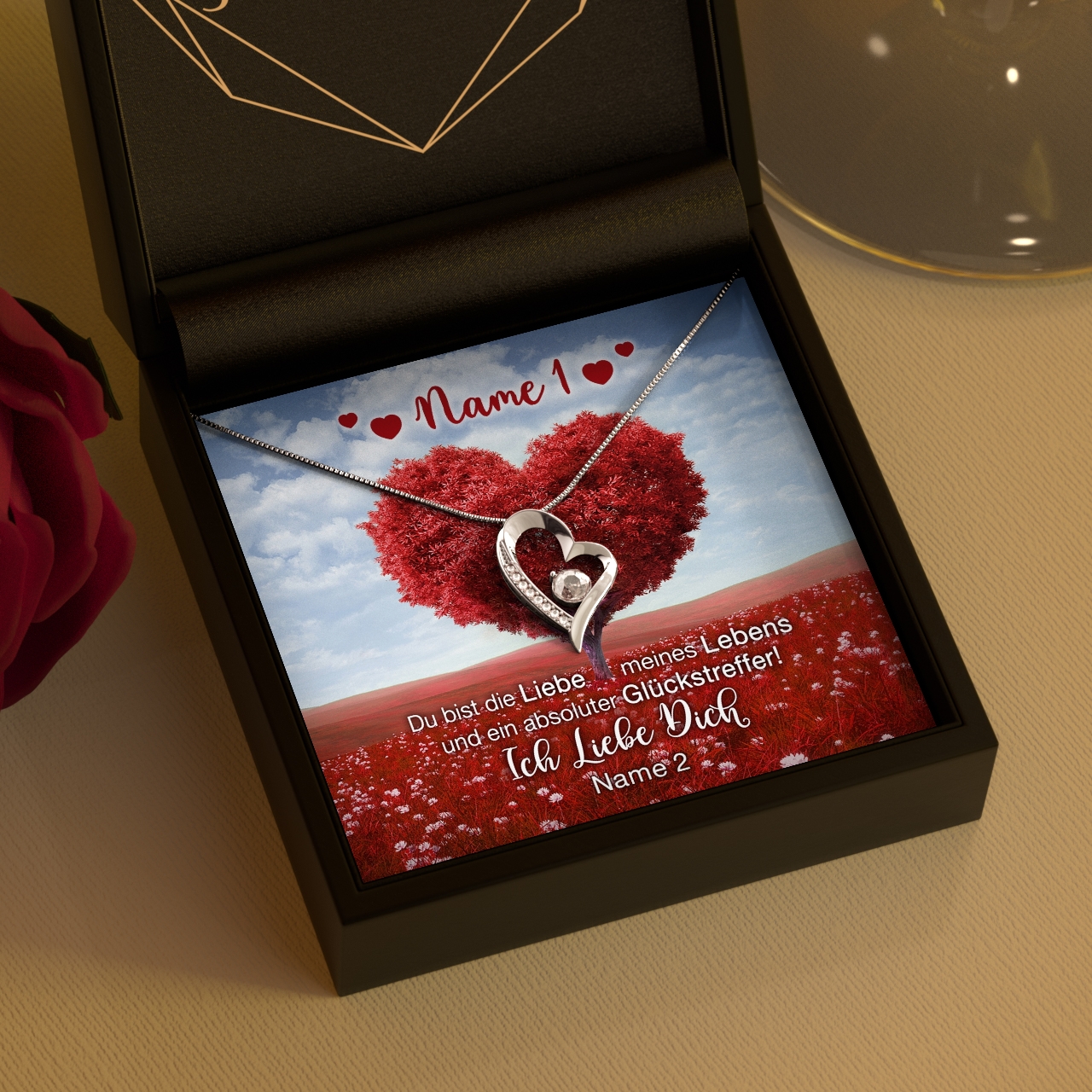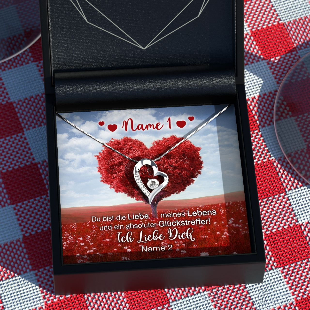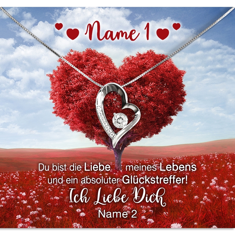 Du kannst Dein individuelles Geschenk personalisieren, indem Du Eure Namen aufdrucken lässt. In der Live-Vorschau siehst Du Deine personalisierte Karte. Mit Deiner Bestellung erhältst Du ein Schmuckstück Deiner Wahl aus unserer Kollektion, Deine personalisierte Karte, eine hochwertige Schmuckbox und eine Premium Geschenktüte.