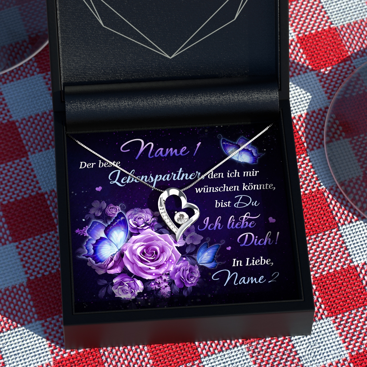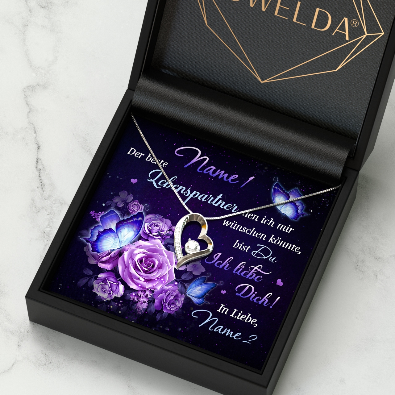 Auf der personalisierten Karte befinden sich neben dem romantischen Spruch und den wundervollen Rosen in leuchtendem Lila auch Eure Namen. Das macht Dein Geschenk individuell und wird Deiner Freundin so garantiert in Erinnerung bleiben. Um das beste Geschenkerlebnis zu sichern, liefern wir Dir alles in einer hochwertigen Schmuckbox aus Kunstleder und platzieren Dein Präsent in einer Premium Geschenktasche.