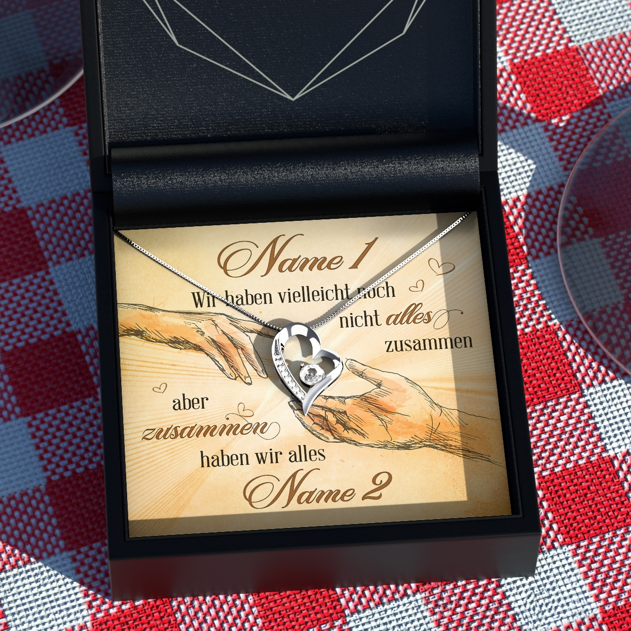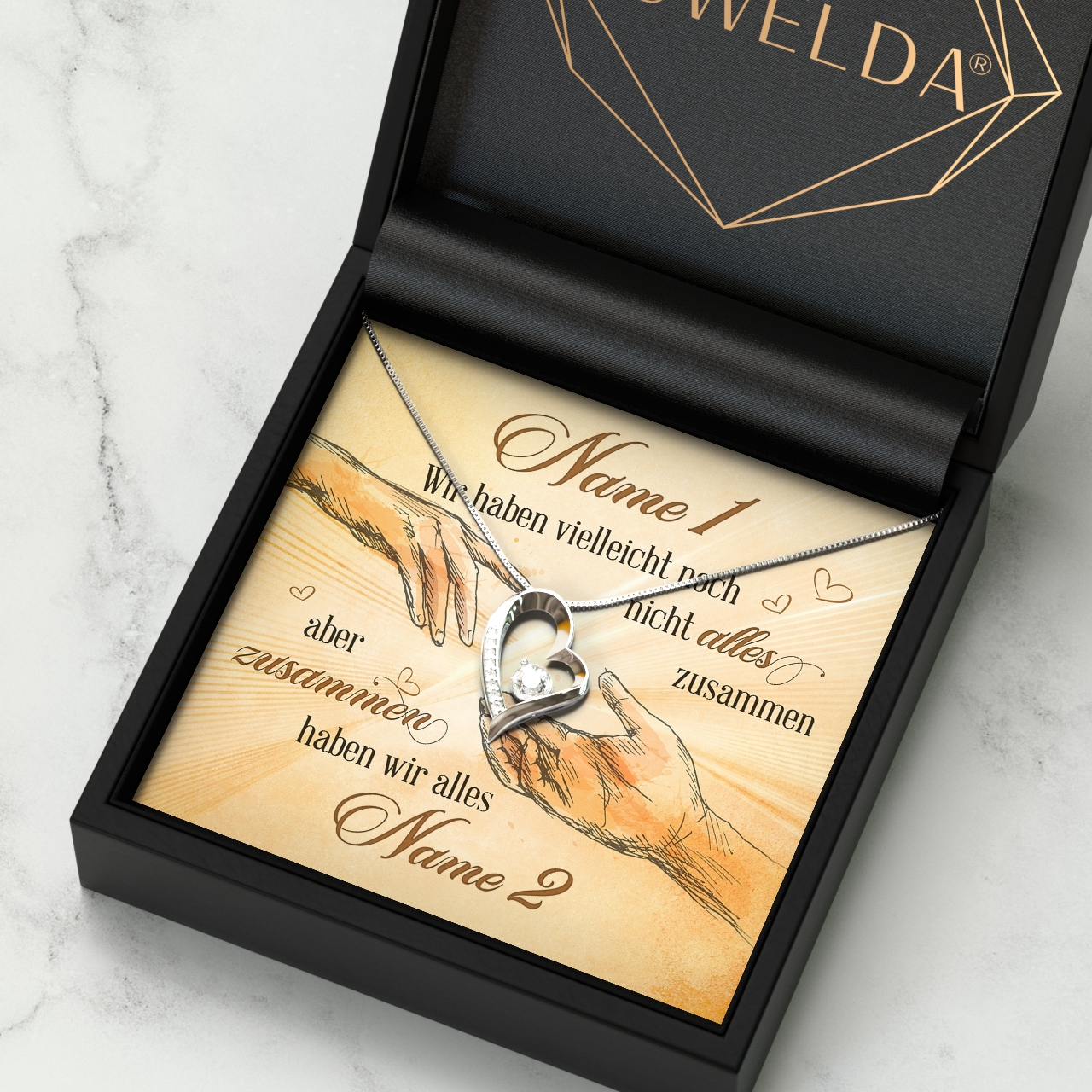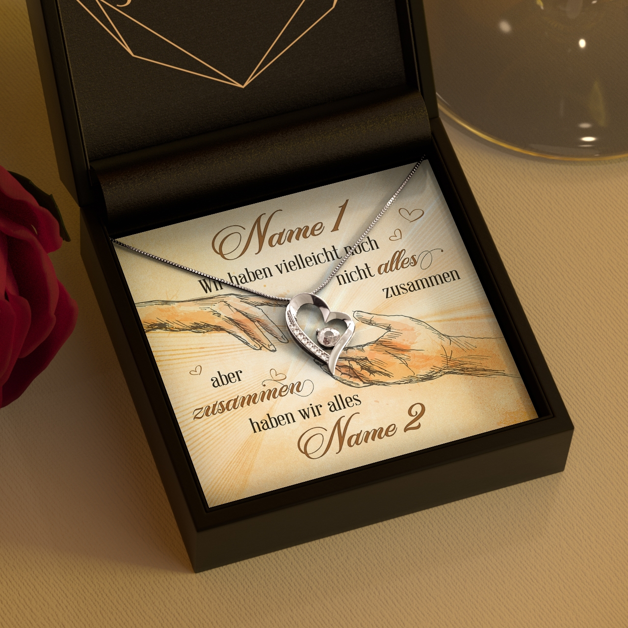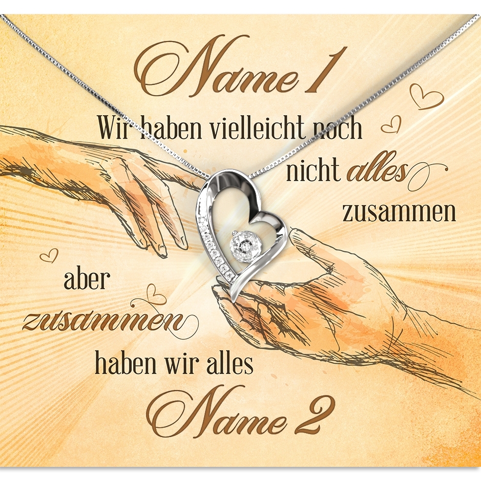 Gib bei der Bestellung Eure Namen an, die aus einer schönen Grußkarte ein ganz persönliches Geschenk machen. In der Live-Vorschau kannst Du das Ergebnis einsehen. Wir fertigen die personalisierte Karte genau nach Deinen Wünschen an und in wenigen Tagen hältst Du Dein Paket in den Händen. Der Schmuck und die Karte sind in einer hochwertigen Schmuckbox aus Kunstleder verpackt und werden in einer Premium-Geschenktasche geliefert.