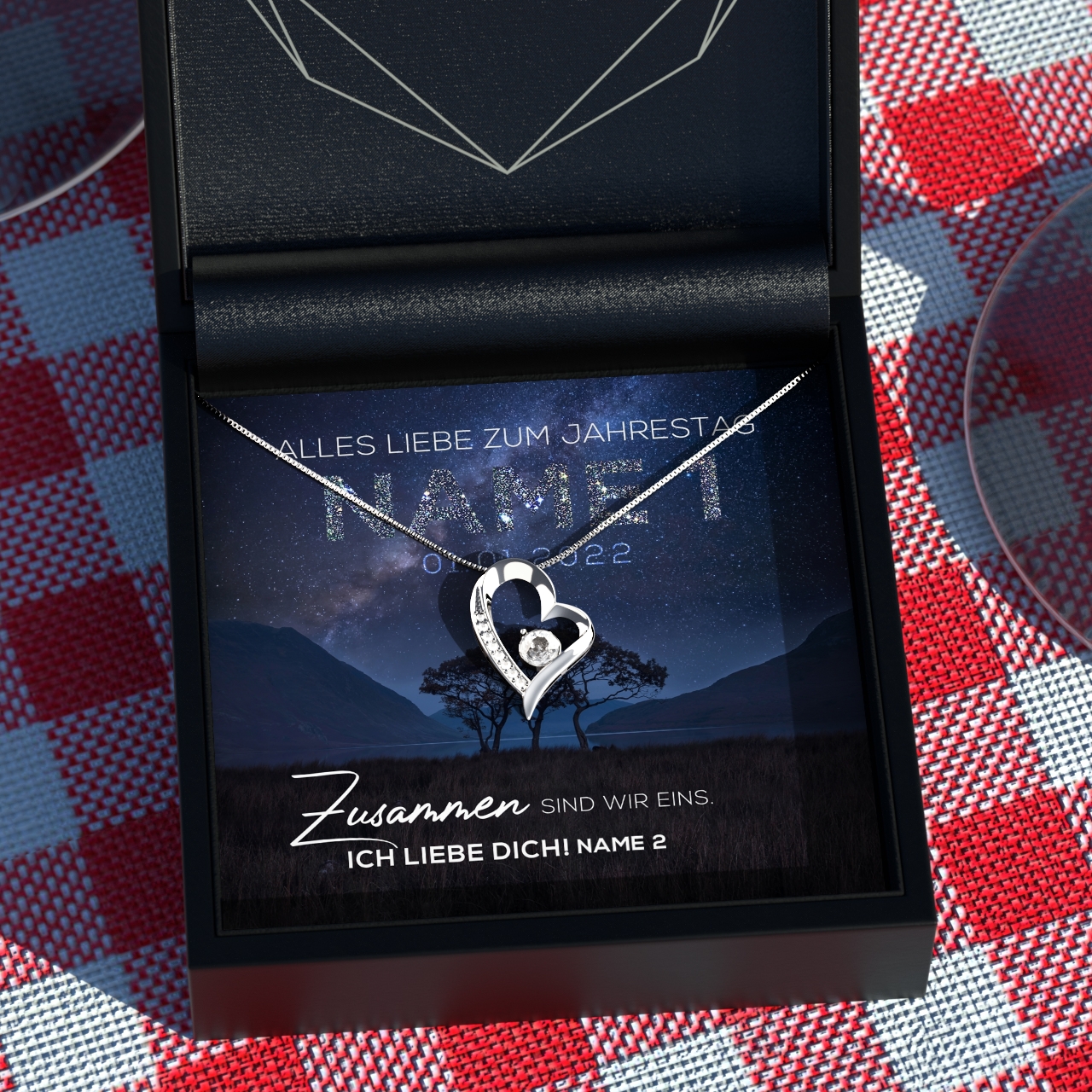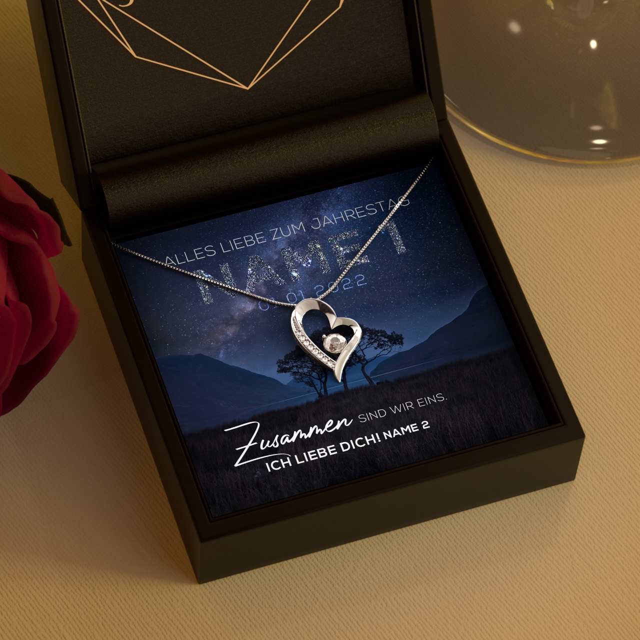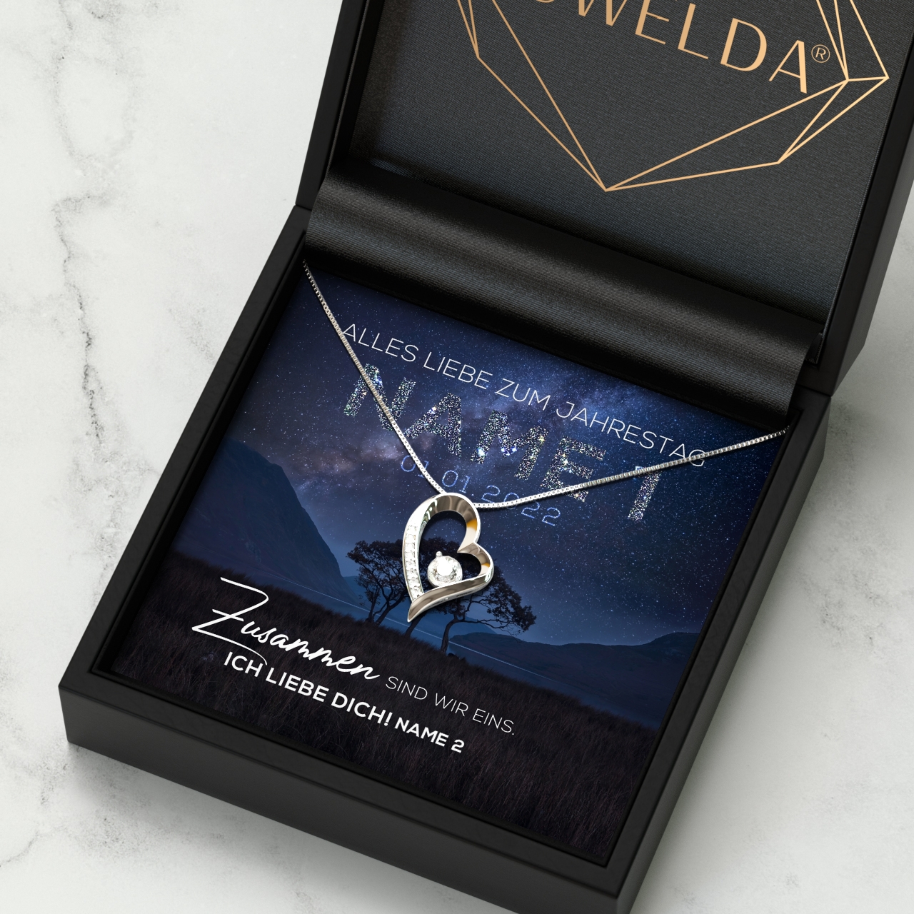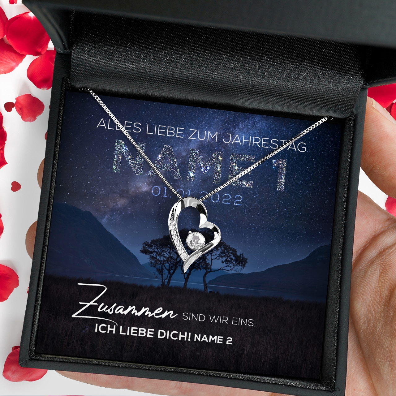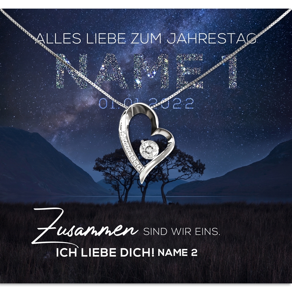 Du möchtest Deiner Partnerin zu Eurem Jahrestag ein ganz besonderes Geschenk überreichen? Mit einem wunderschönen Schmuckstück und einer personalisierbaren Grußkarte kannst Du Deine Liebe unter Beweis stellen. Denn hier überreichst Du ein Geschenk, das Deine tiefen Gefühle für diesen ganz besonderen Menschen in Deinem Leben ausdrückt. Die schöne Grußkarte mit dem Motiv „Zusammen sind wir Eins“ zeigt einen spektakulären Sternenhimmel über einer wunderschönen Landschaft. Der einfache, aber kraftvolle Spruch vermittelt eine Botschaft, die von Herzen kommt.