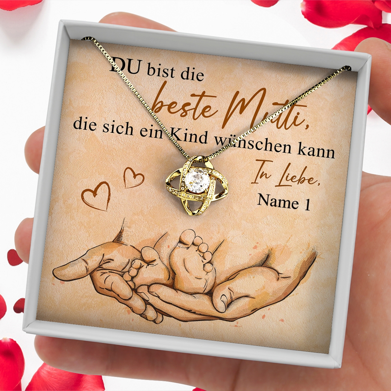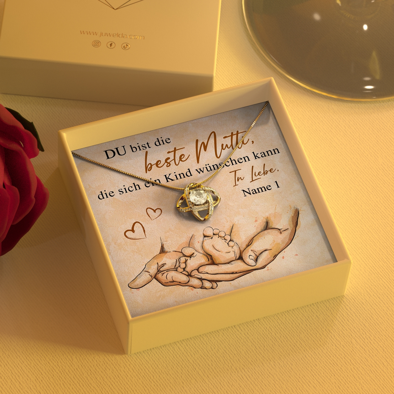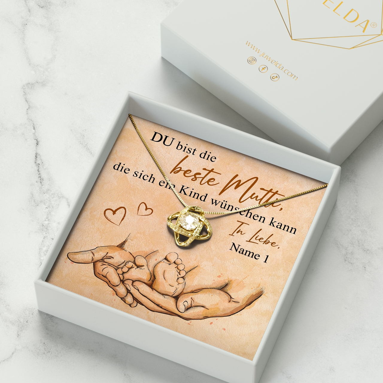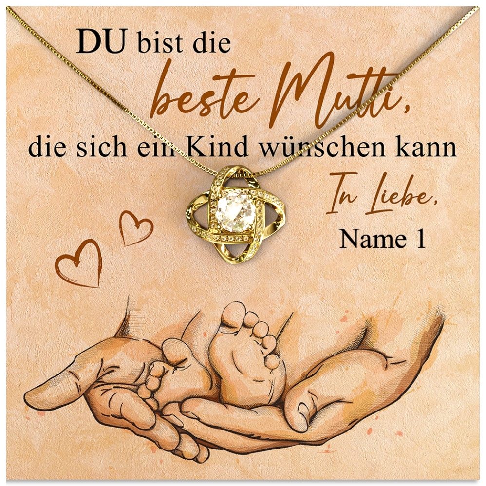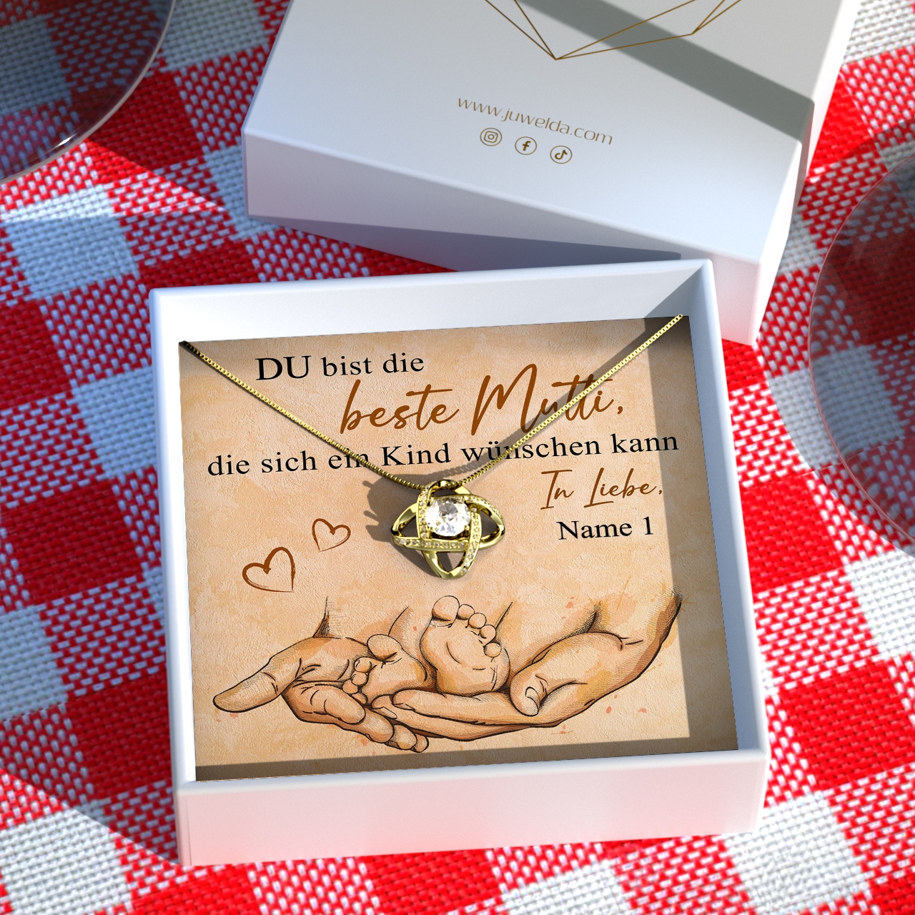 Ob Du Deine Mama überraschen möchtest oder Du der Mama Deines Kindes zum ersten Muttertag ein Geschenk überreichen willst, die Schmuckbox mit der „Beste Mutti der Welt“-Grußkarte ist ein absolutes Highlight. Das schöne Design zeigt eine hübsche Zeichnung und findet genau die richtigen Worte für die Mama. Auf der Karte können ein oder mehrere Namen personalisiert werden. So ist das Schmuckgeschenk garantiert einzigartig.