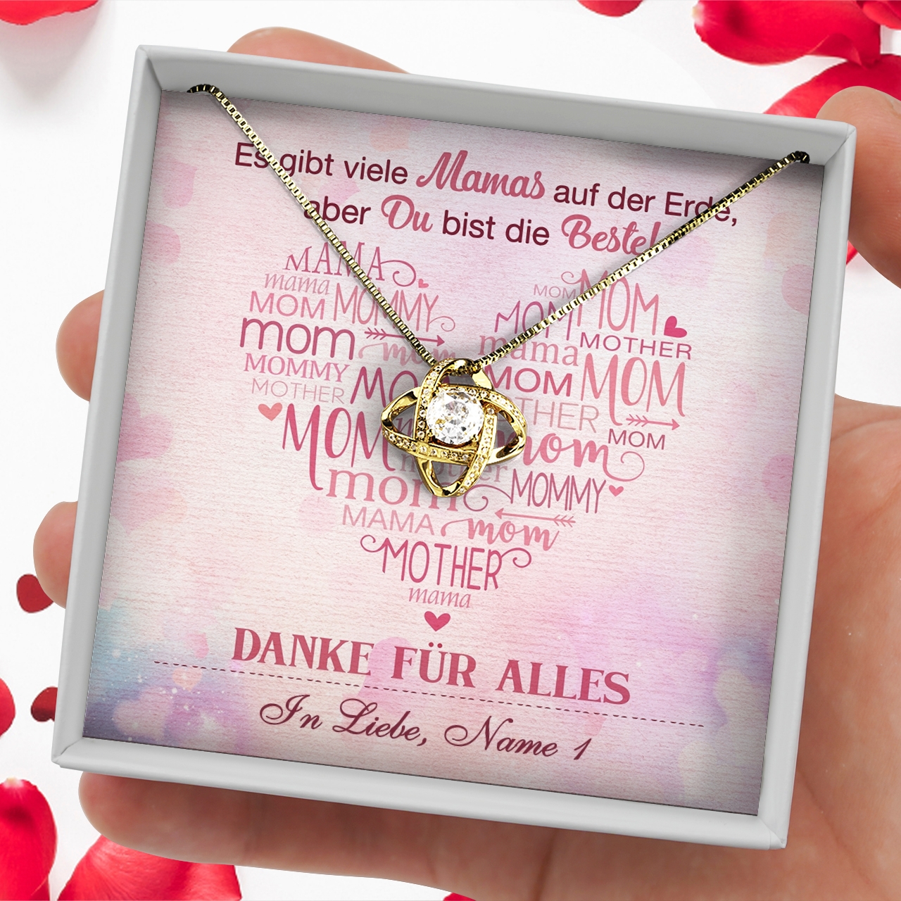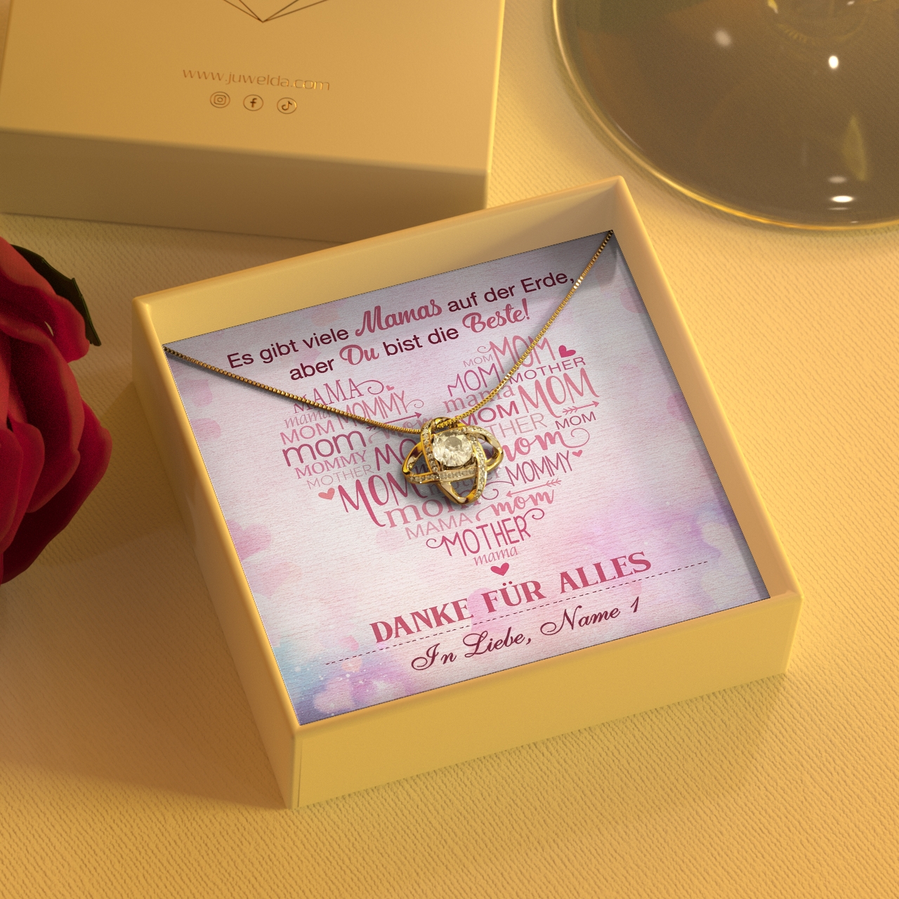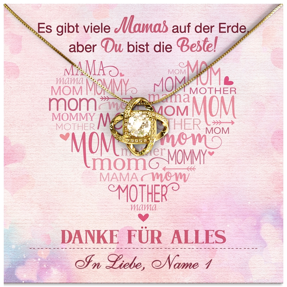 Deine Mama mag es bunt und verspielt? Dann ist die „Danke für Alles“ Grußkarte genau passend für das Muttertagsgeschenk. Sie ist in leuchtendem Pink mit vielen Herzen gestaltet. Auf die personalisierbare Karte kannst Du Deinen Namen aufdrucken lassen, um ein individuelles Geschenk zu überreichen. Deine Mama wird bestimmt sprachlos sein. Wähle ein tolles Schmuckstück aus unserer Kollektion dazu und schon hast Du ein Präsent, das persönlicher und individueller nicht sein könnte.
