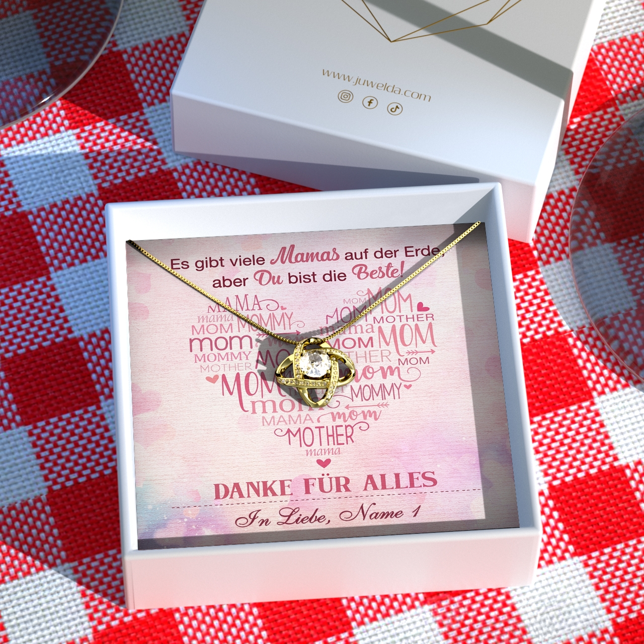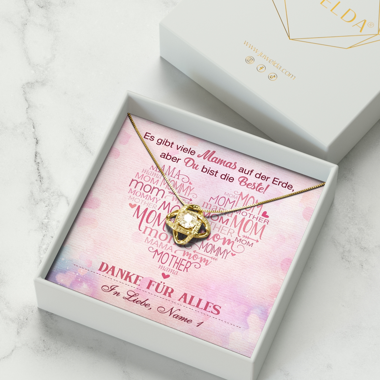 Wir verpacken unsere Boxen sorgsam und schlagen die Karten und den Schmuck in elegantes Seidenpapier ein. Die Box selbst ist aus hochwertigem Kunstleder und Samt gefertigt. Die schlichte Schatulle ist auch als Dekoration ein echter Hingucker. Deiner Bestellung legen wir eine passende Tragetasche im Juwelda-Design bei. Du kannst das Geschenk dann überreichen und Dich an den strahlenden Augen Deiner Mama erfreuen.