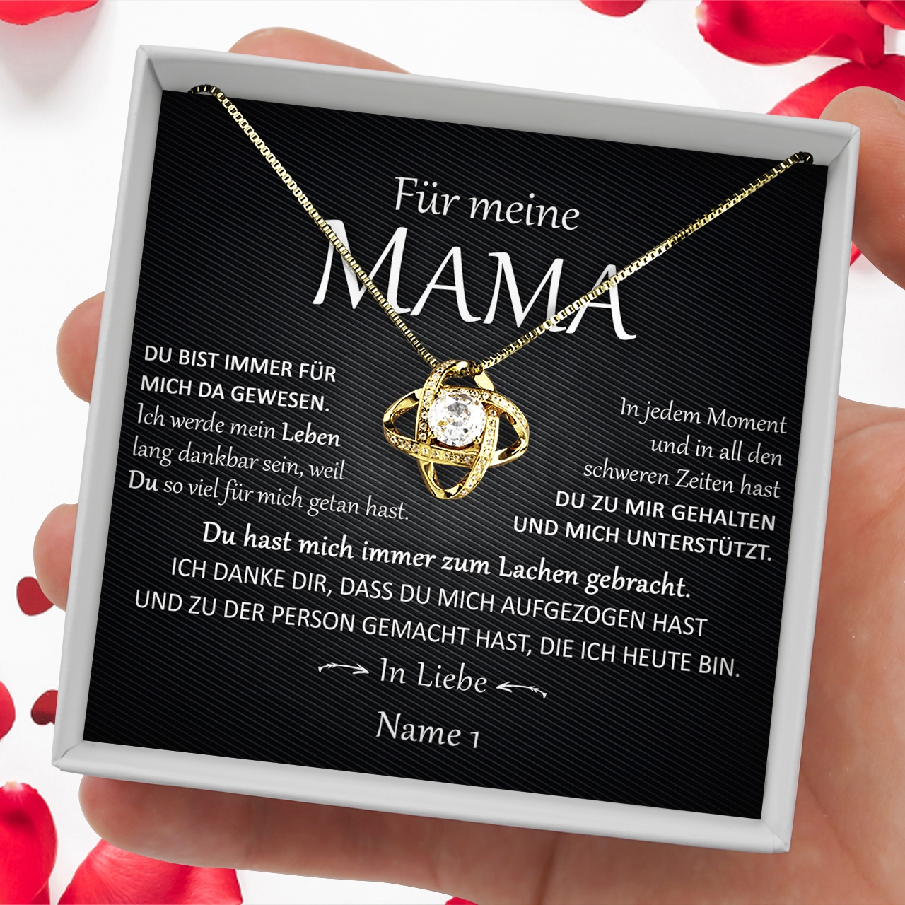 Wenn Du Hilfe gebraucht hast, war Deine Mutter für Dich da. Sie hat immer alles für Dich getan und war in schweren Zeiten immer erreichbar. Um Dich für diese Unterstützung zu bedanken, kannst Du Deiner lieben Mama eine wunderschöne Halskette mit der personalisierbaren Karte „Ein Leben lang dankbar“ schenken. Damit drückst Du die Liebe zu Deiner Mutter aus und kannst ihr genau das mitteilen, wofür Dir die Worte fehlen. Um die Karte zu personalisieren, musst Du Deine Namen eingeben und kannst Dir das Ergebnis in der Live-Vorschau ansehen.