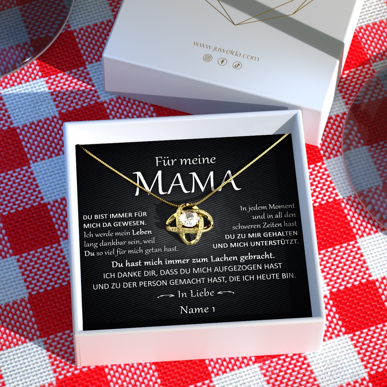 Wir liefern innerhalb von 2-3 Tagen Dein einzigartiges Geschenk. Die Halskette wird zusammen mit der personalisierten Karte in eine schöne Schmuckbox gelegt und inklusive einer hochwertigen Geschenktasche an Dich übergeben. So kannst Du das Präsent sofort an Deine Mutter verschenken. Du sorgst für einen unvergesslichen Moment der Freude und Glück mit einem ganz persönlichen Geschenk von Juwelda.