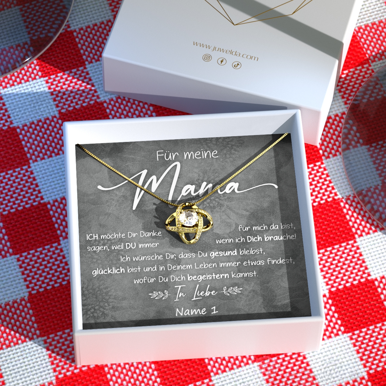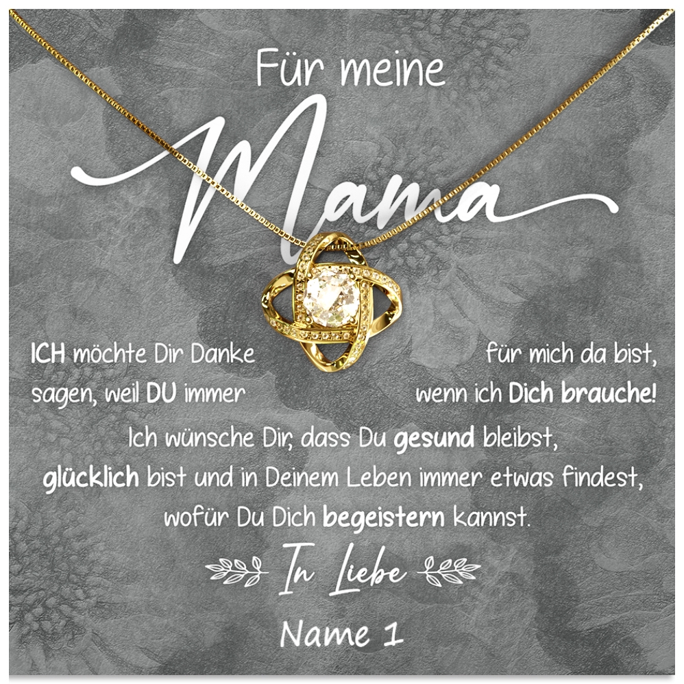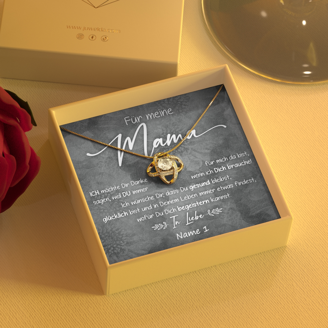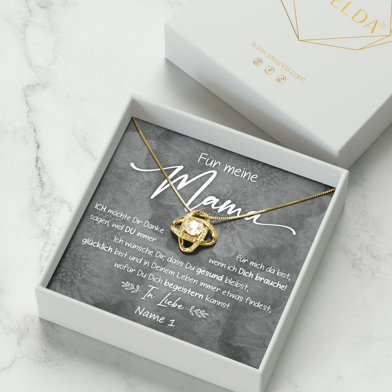 Wir liefern Dir eine bezaubernde Halskette aus 925 Sterling Silber in den Farben Silber, Gelbgold oder Roségold und Deine individualisierte Karte mit Deinen Wunschnamen in einer stilvollen Schmuckbox aus Kunstleder mit Samt-Innenbezug. Damit Dein Präsent sofort verschenkt werden kann, packen wir Dir alles in eine charmante Geschenktasche. So erhältst Du in nur wenigen Tagen ein Paket mit Deinem einzigartigen Geschenk, welches Deine Mama zu Tränen rühren wird.