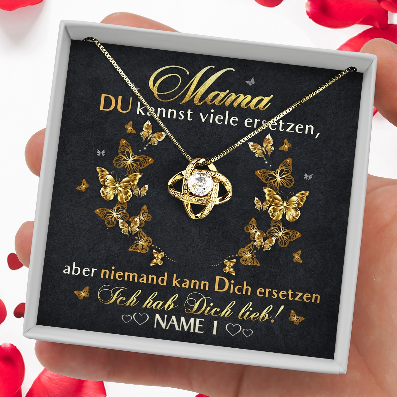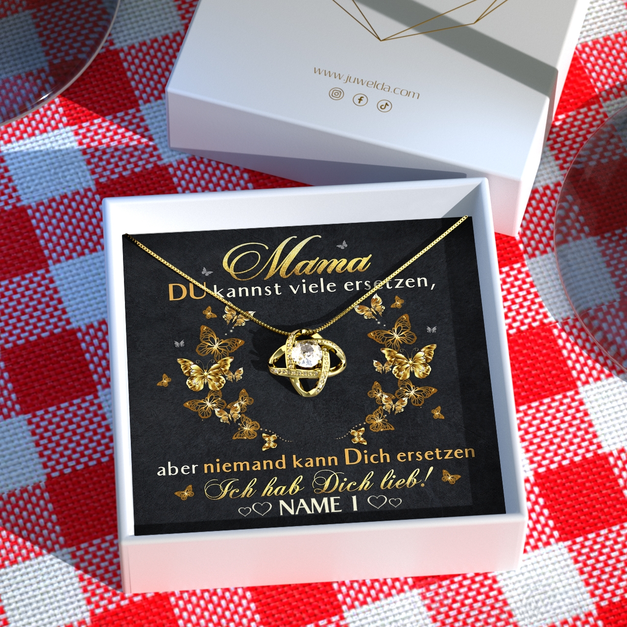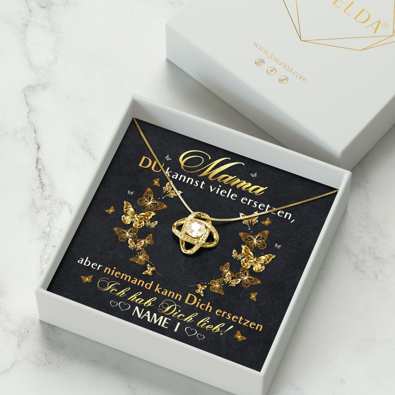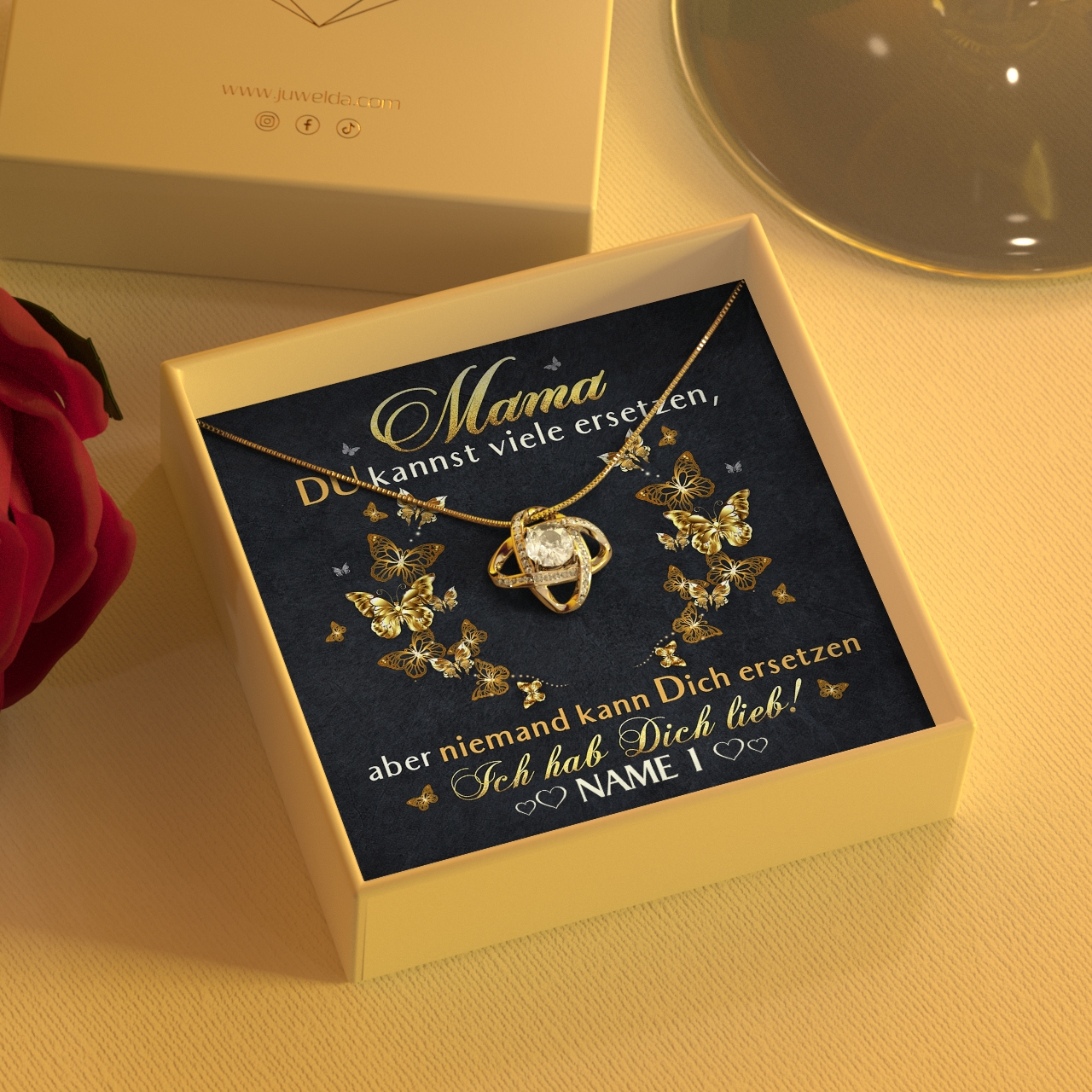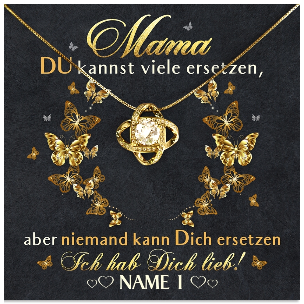 Der Muttertag steht vor der Tür und in diesem Jahr möchtest Du Deine Mama mit einem sehr besonderen Geschenk überraschen? Die schönen Geschenkboxen mit personalisierbarer Grußkarte und einem eleganten Schmuckstück aus unserer Kollektion sind da genau passend. Denn Du kannst Deiner Mama ganz einfach sagen, wie wichtig sie für Dich ist. Die Karte ist in Schwarz und Gold gehalten und mit hübschen Schmetterlingen verziert. Der herzliche Spruch wird Mama ein Lächeln ins Gesicht zaubern.
