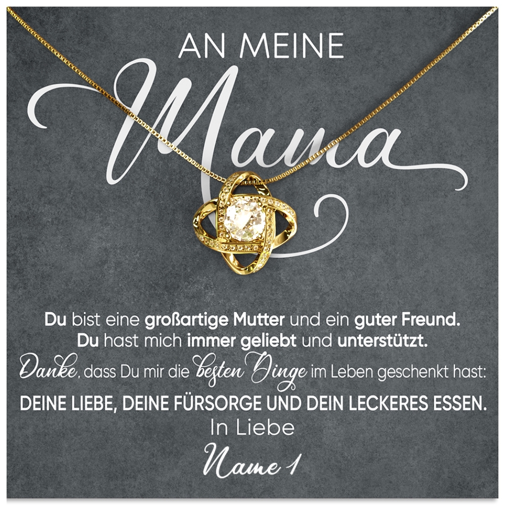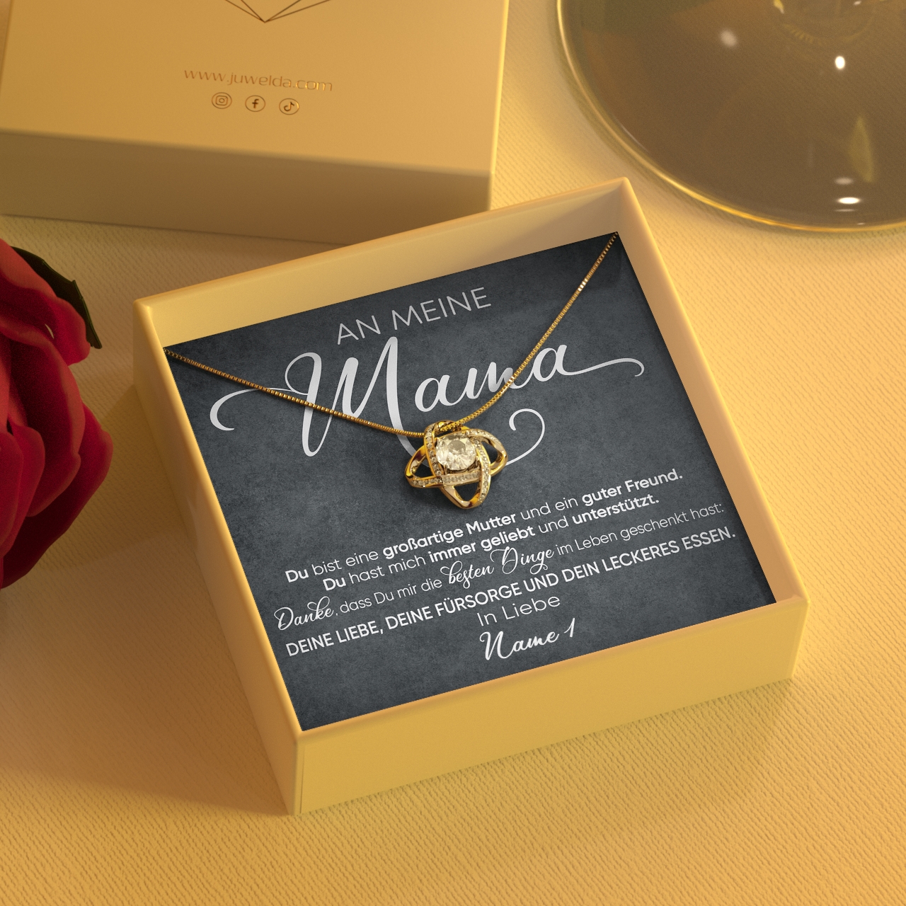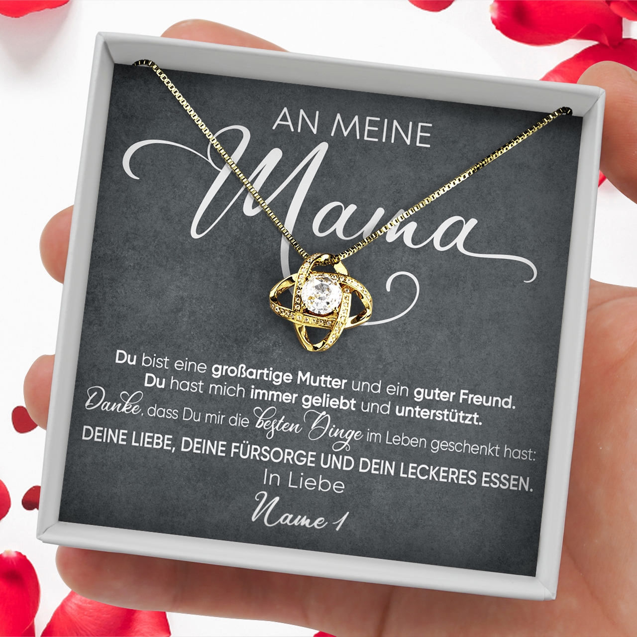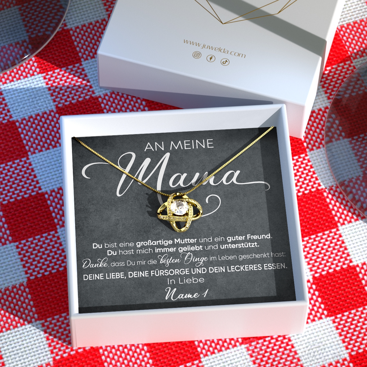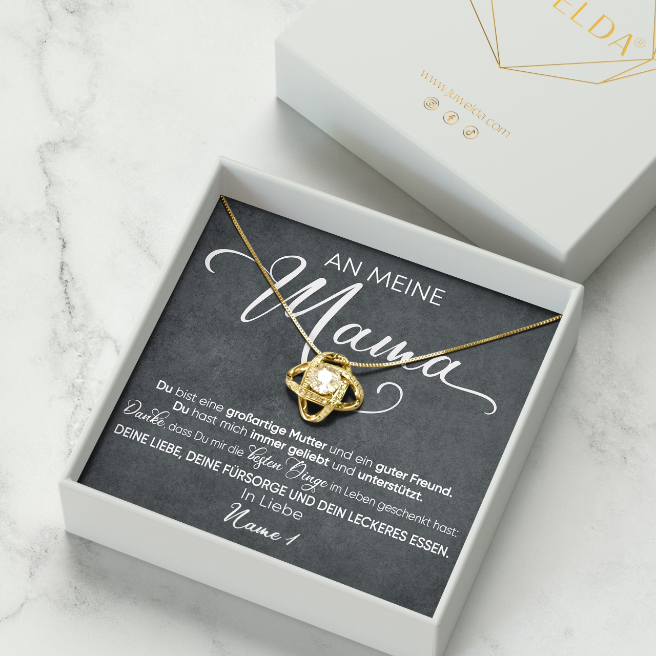 In unserer kleinen Schmuckmanufaktur im schönen Westerwald wird Dein individuelles Geschenk von Hand verpackt. Dabei legen wir die funkelnde Halskette und die personalisierte Karte in eine hochwertige Schmuckbox und platzieren diese in einer schönen Geschenktüte. Somit kannst Du Dein Geschenk sofort an Deine Mama übergeben und Dir Ihre Reaktion anschauen.
