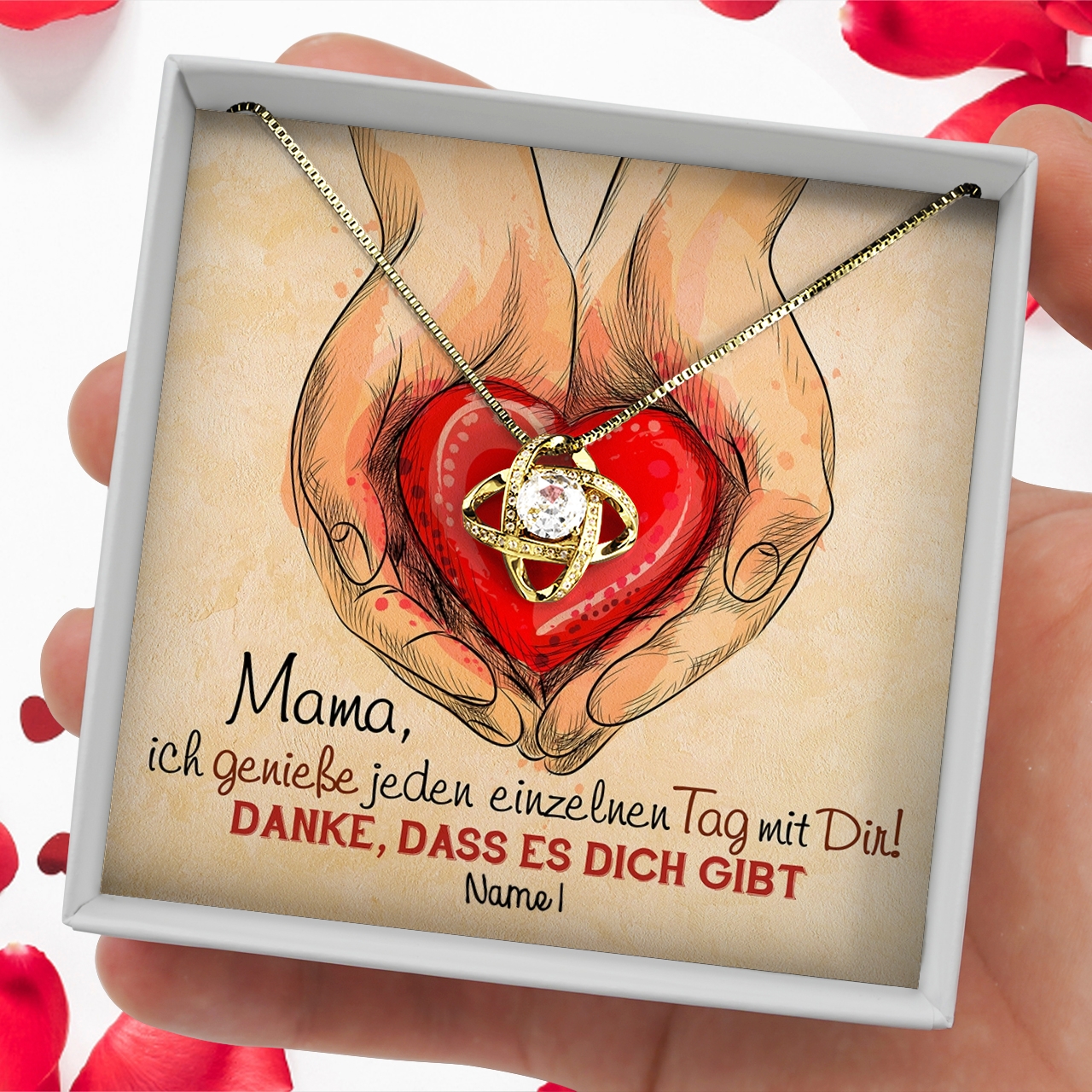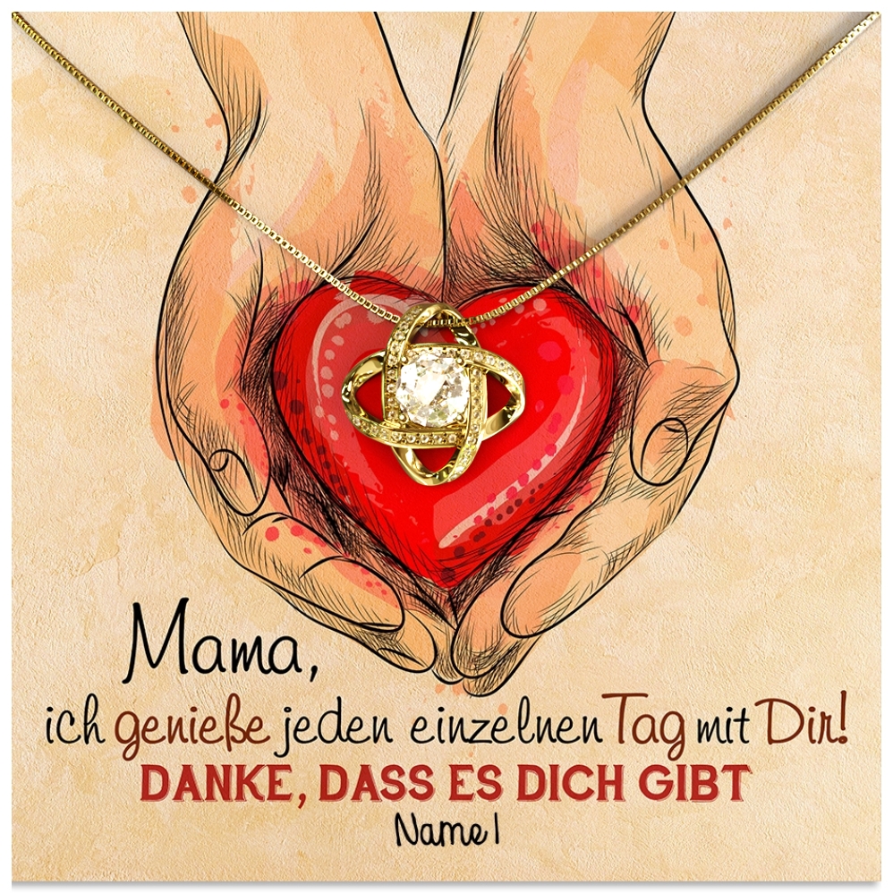 Mama ist immer für Dich da und geht mir Dir durch dick und dünn? Dann ist es an der Zeit, sie in diesem Jahr zum Muttertag mit mehr als nur einem Strauß Blumen zu überraschen. Unsere personalisierbare Karte zum Muttertag kann mit einem oder mehreren Namen gestaltet werden. Sie zeigt ein gezeichnetes Herz, das in zwei Händen gehalten wird. Sie symbolisiert, wie wichtig Deine Mama in Deinem Leben ist. Zu der Karte suchst Du aus unserer exklusiven Kollektion ein Schmuckstück aus, das sie für immer genießen kann.