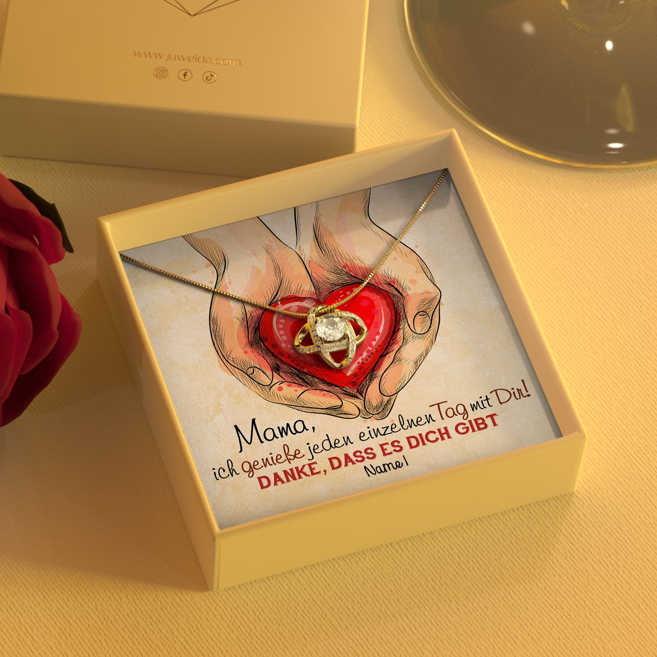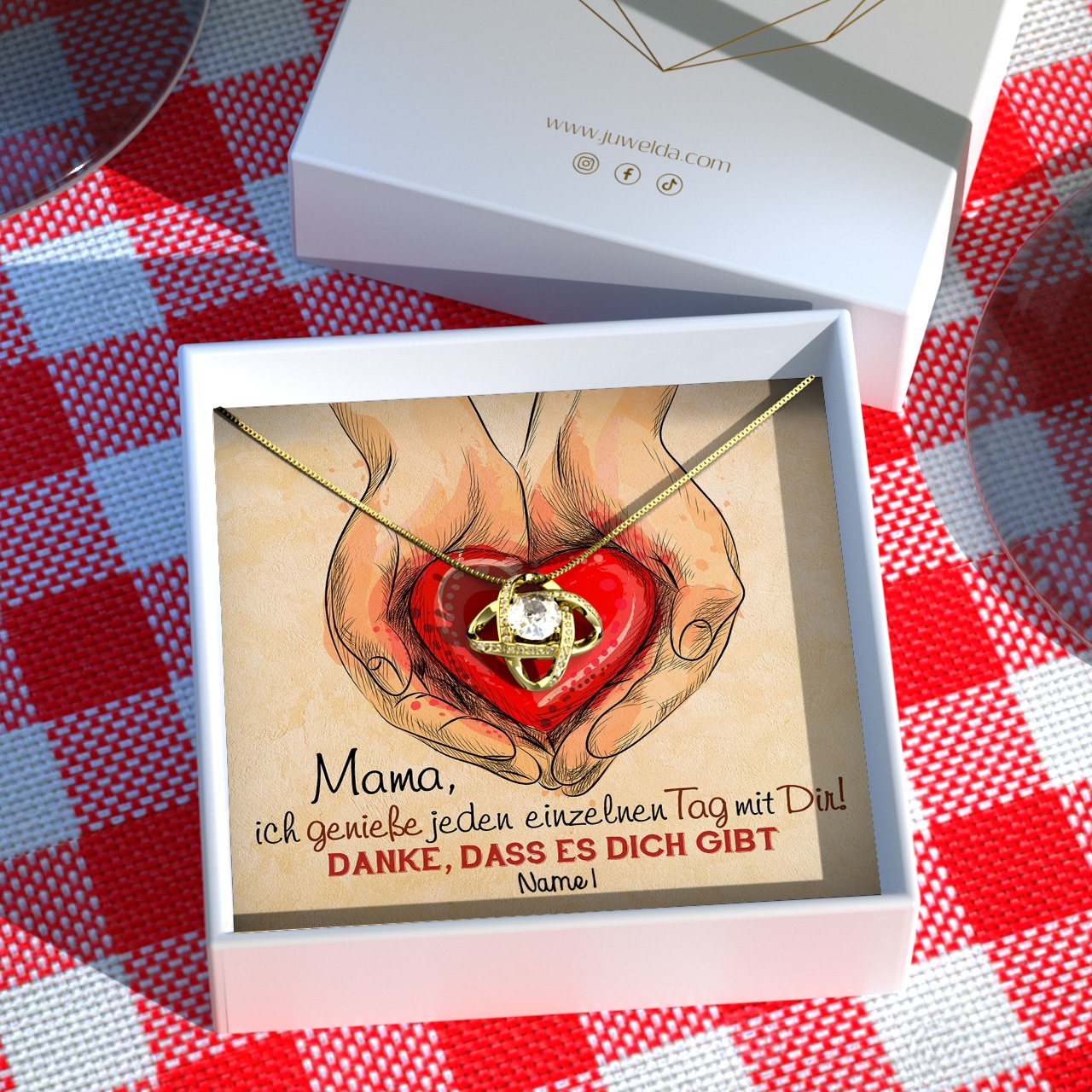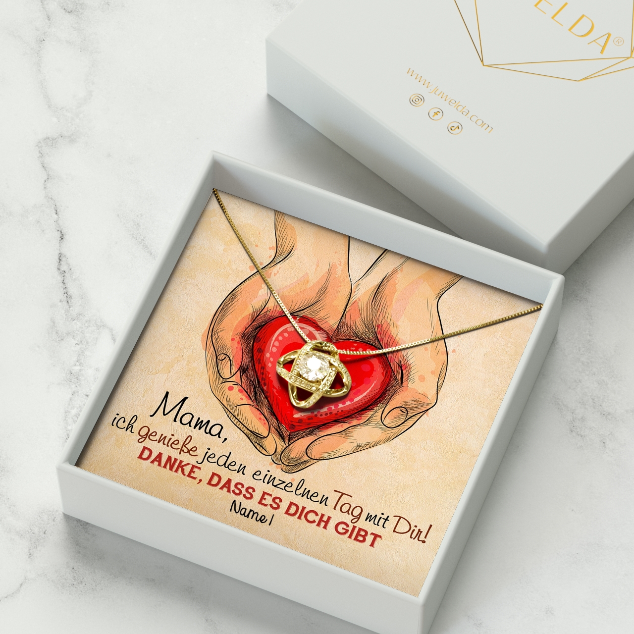 Ist Deine Bestellung abgeschlossen, beginnen wir sofort damit, Deine personalisierte Grußkarte herzustellen und das Geschenk-Set zu verpacken. Wir verpacken alle Bestellungen sorgfältig per Hand. Das Set umfasst eine schöne Geschenkbox aus Kunstleder, die mit weichem Samt ausgelegt ist. Zusätzlich erhältst Du die Juwelda-Geschenktasche gratis zu Deiner Lieferung.