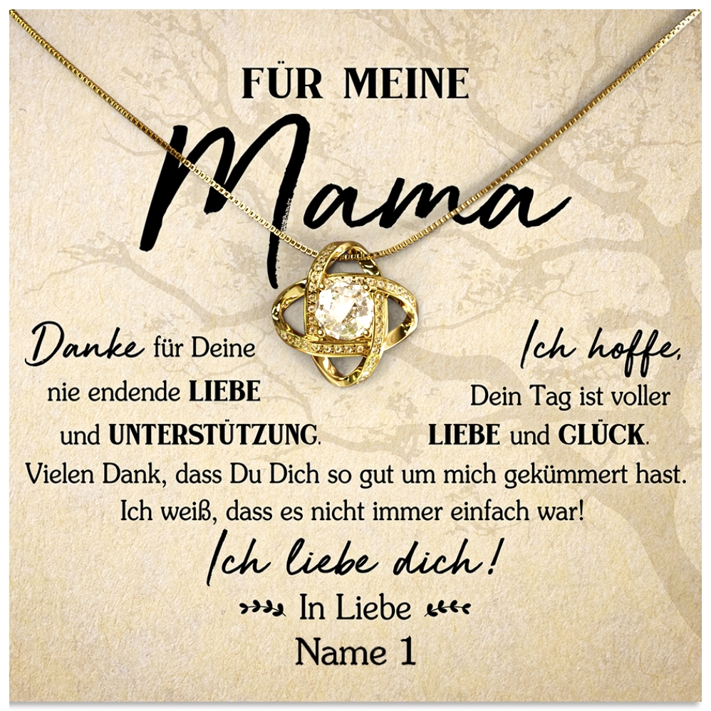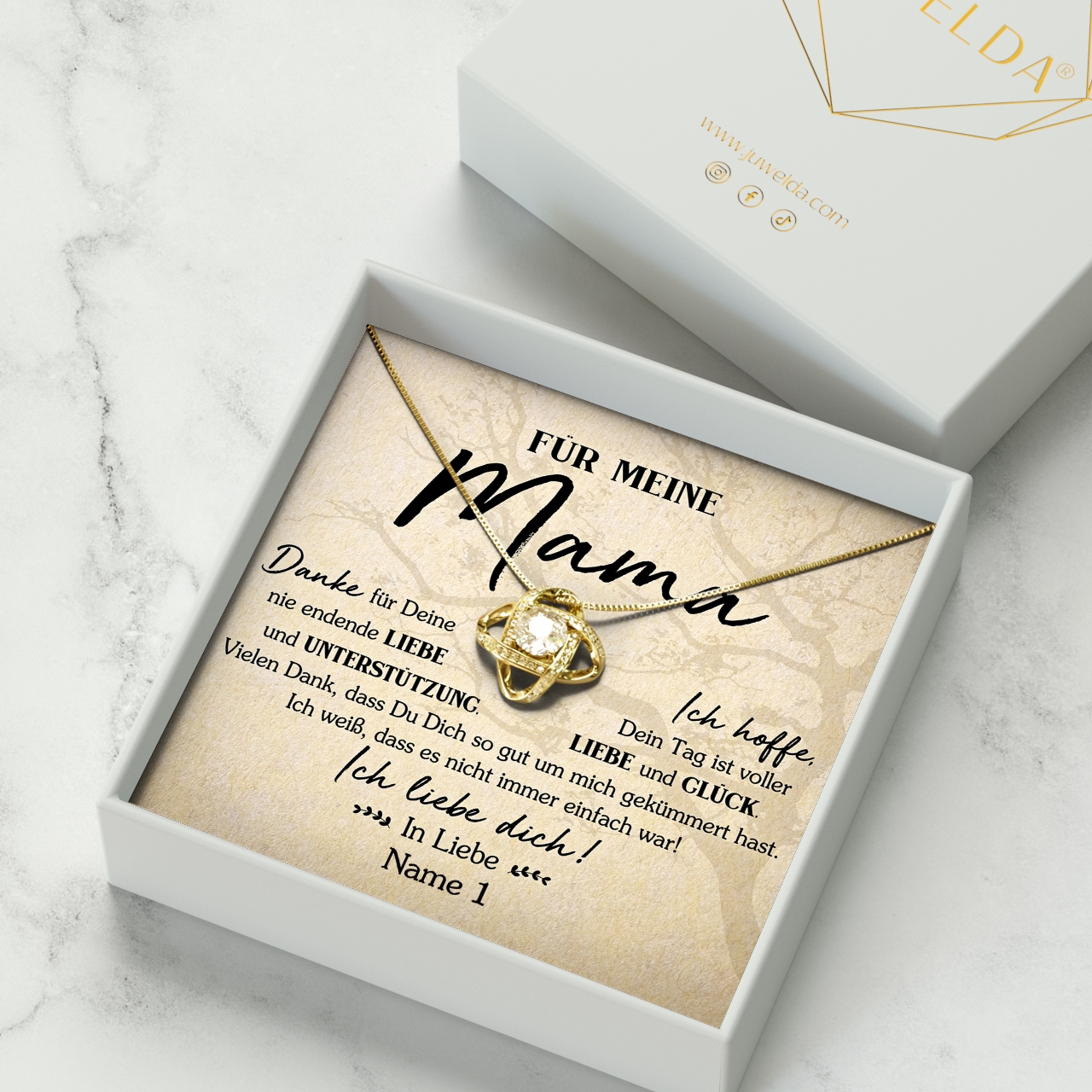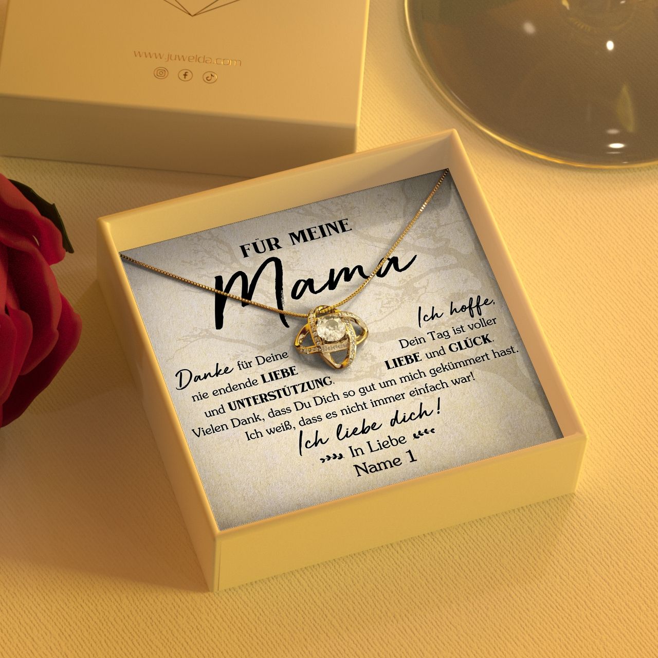 Mama ist das Herz einer jeden Familie. Sie kümmert sich um alles und unterstützt mit ihrer nie endenden Liebe. Möchtest Du Dich gerne bei Deiner Mutter bedanken? In wenigen Schritten kannst Du Dein individuelles Geschenk kreieren. Wähle eine funkelnde Halskette Deiner Wahl, trage Deine Namen in das dafür vorgesehene Feld ein und suche einen passenden Spruch aus. Nachdem Du auf den „Vorschau anzeigen“ Button geklickt hast, kannst Du Dein ganz persönliches Geschenk betrachten.
