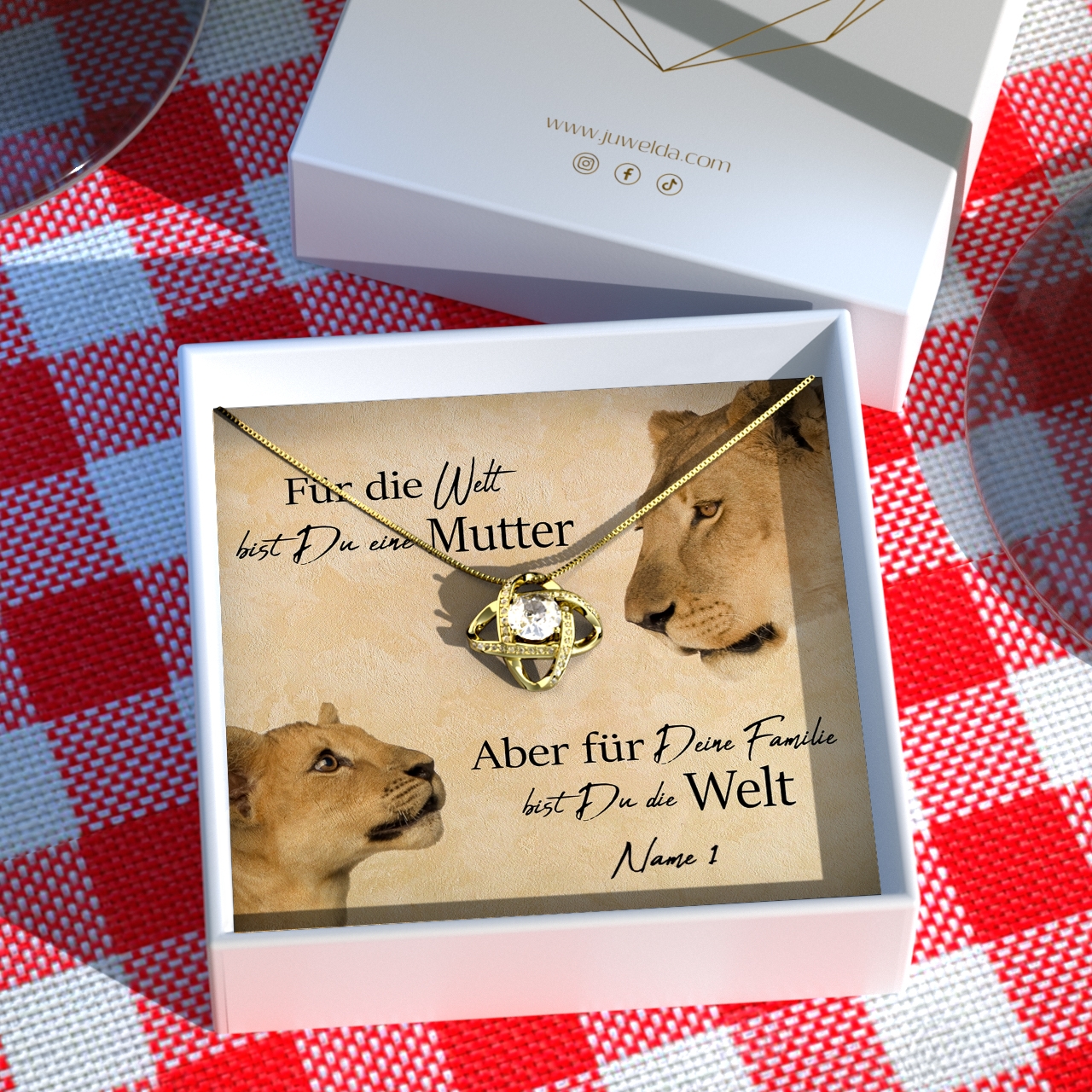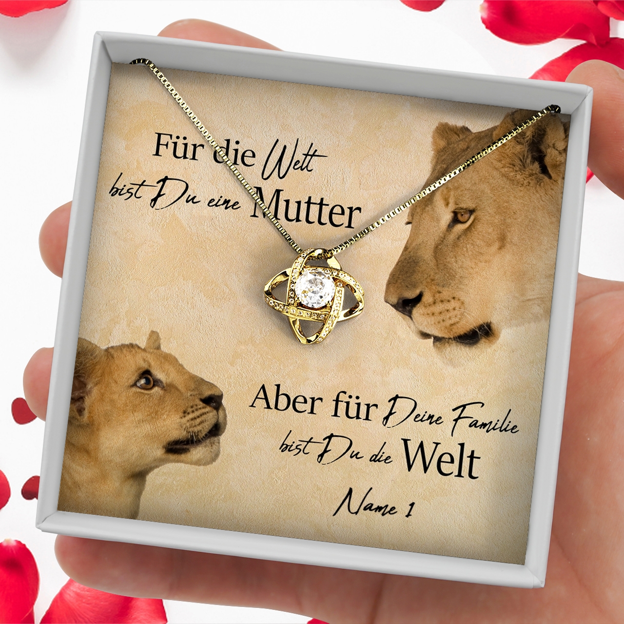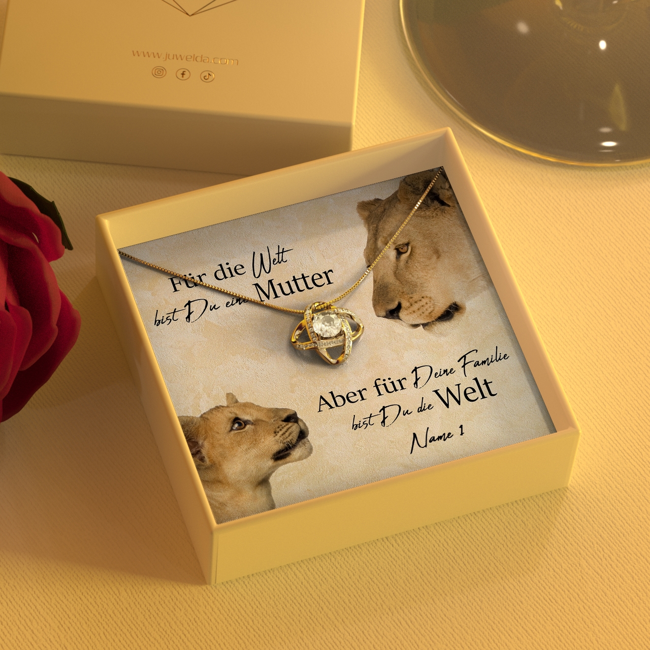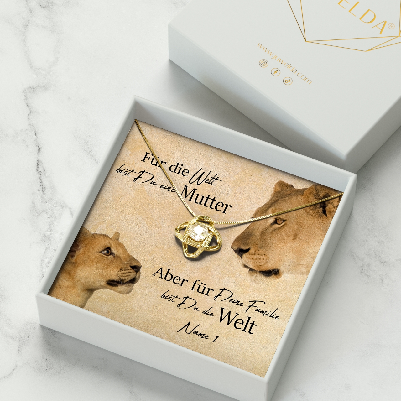 Deine Mutter ist immer an Deiner Seite? Sie ist Deine beste Freundin, Beschützerin und größte Unterstützerin zugleich? Mit unserer personalisierbaren Karte „Löwenmutter“ kannst Du dafür Danke sagen. Als Teil eines einmaligen Geschenksets ist die Karte der perfekte Weg, um Deinen Gefühlen Ausdruck zu verleihen – denn wir sagen unseren Müttern viel zu selten, wie wichtig sie für uns sind. Wähle ein Schmuckstück, das zu Deiner Mama passt und präsentiere es mit der Karte, die Deinen Namen zeigt.