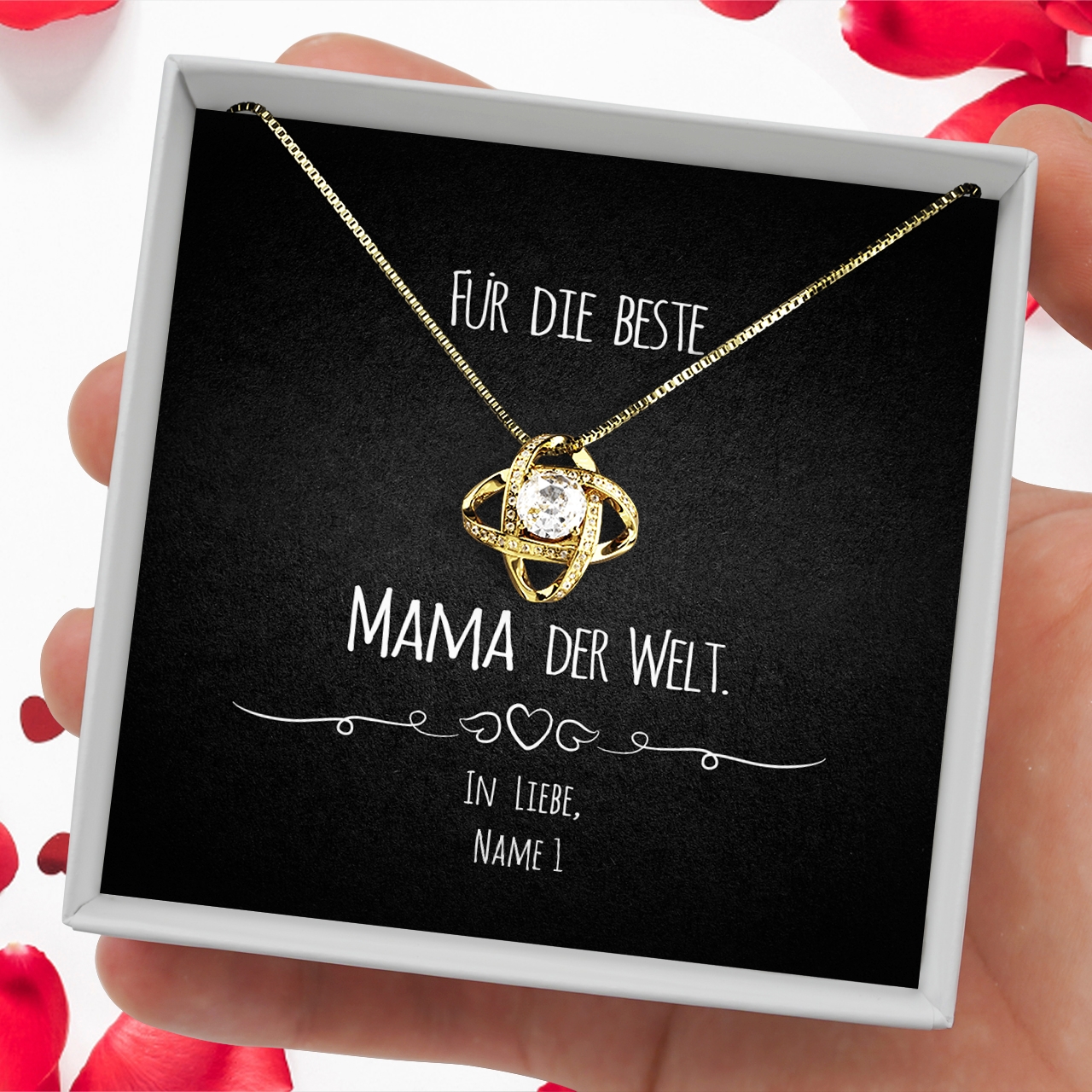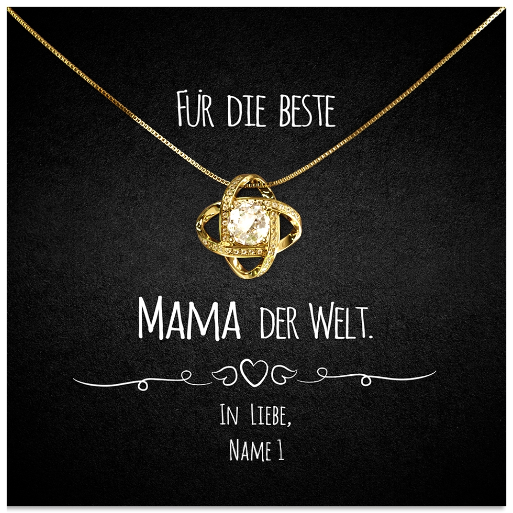 An besonders schweren Tagen weißt Du, dass Du Dich auf Deine Mama verlassen kannst. Sie steht Dir immer mit Rat und Tat zur Seite und hilft in jeder Lebenslage. Viel zu selten bedankst Du Dich für die ständigen Mühen Deiner Mutter und würdest einmal gerne Deine herzliche Anerkennung zeigen? Dann ist unsere personalisierte Karte „Mama im Herzen“ genau Deine Wahl! Ein schlichtes Design mit einem treffenden Spruch und Deinem Namen verziert, wird dieses Geschenk etwas ganz Besonderes. Du musst Dich nur für eine unserer wunderschönen Halsketten entscheiden und Deine Wunschnamen eintragen. In der Live-Vorschau kannst Du begutachten, wie Dein persönliches Geschenk aussehen wird.