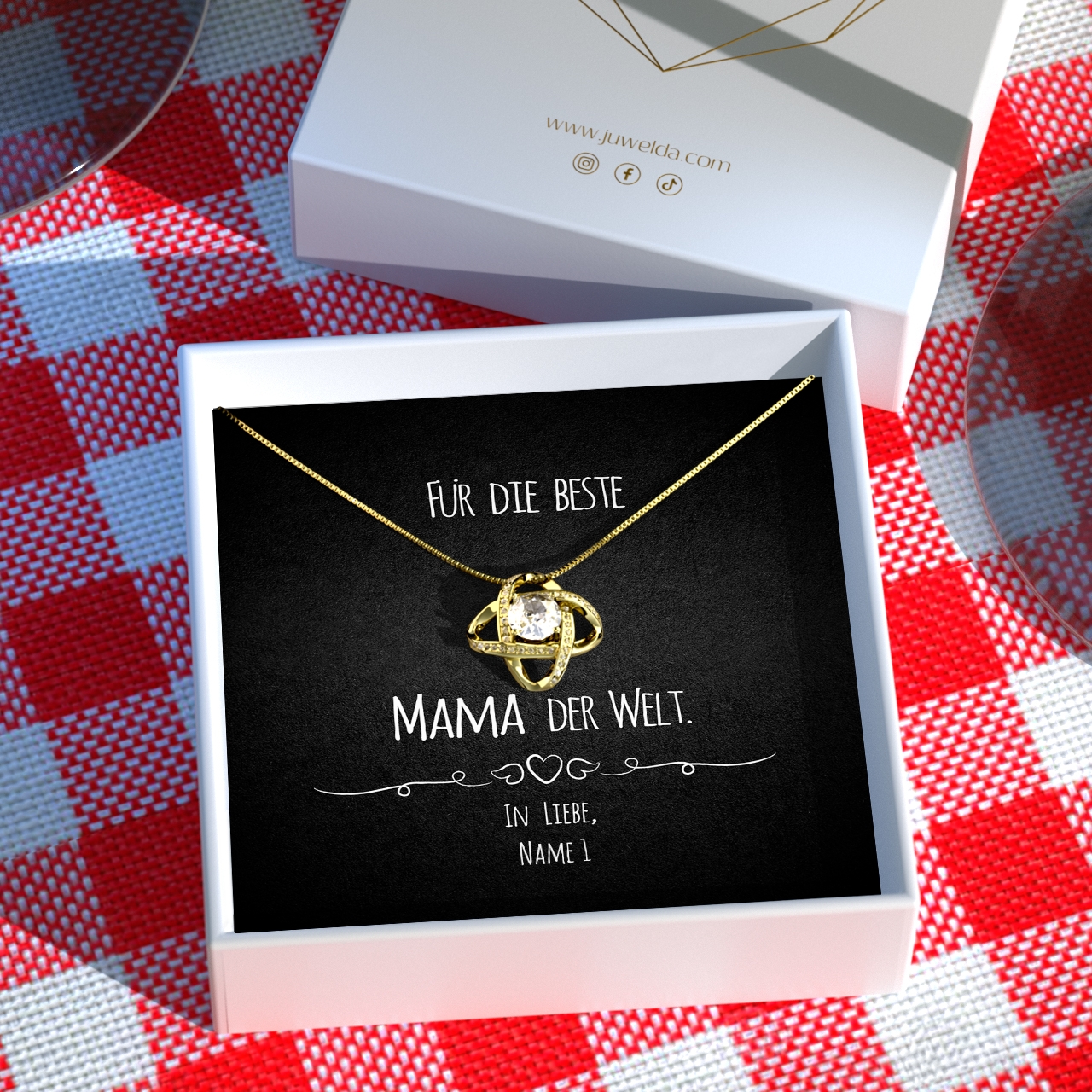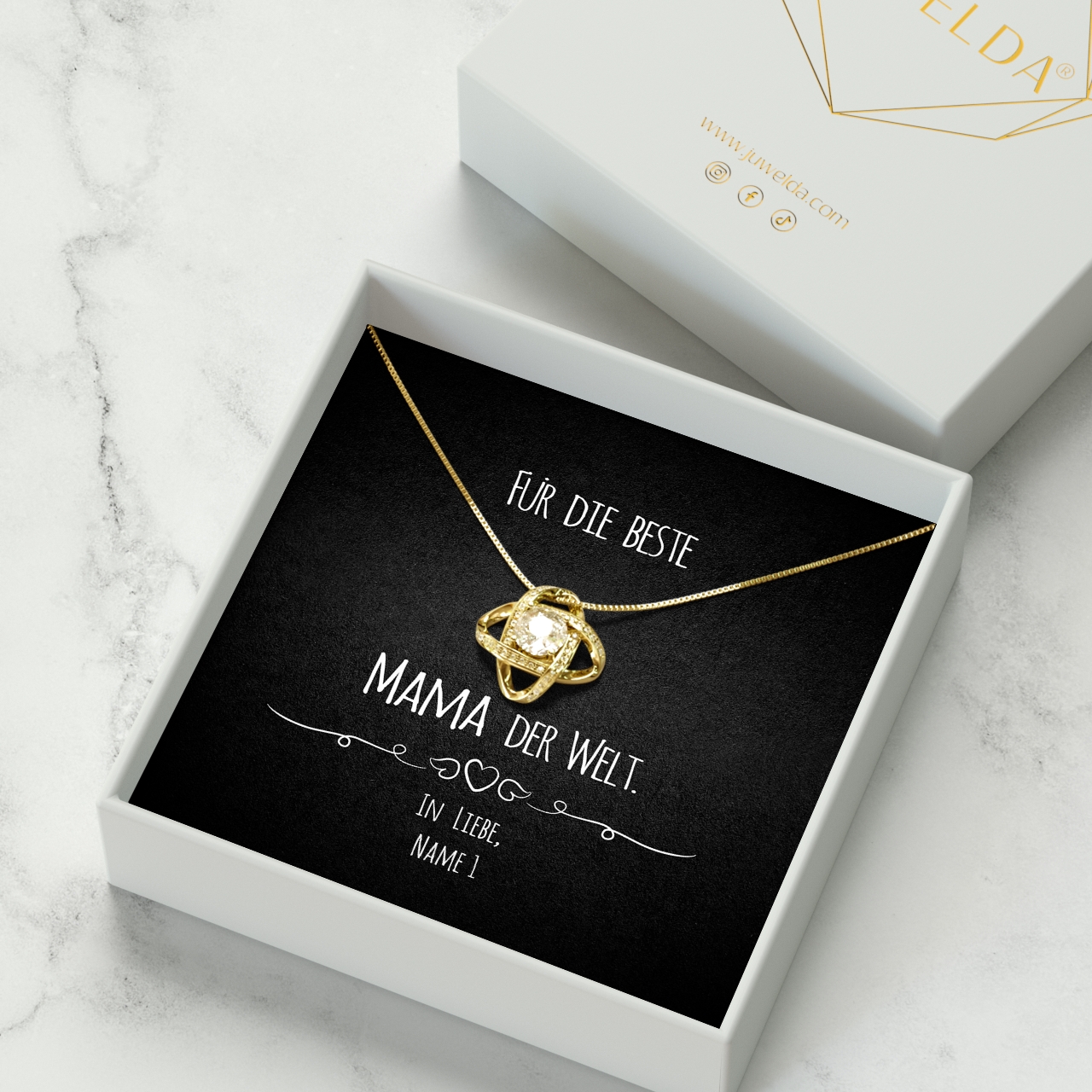 Die von Dir gewählte Halskette wird mit Deiner personalisierten Karte in eine hochwertige Schmuckbox gelegt. Damit Du Dein Geschenk sofort verschenken kannst, verpacken wir alles in einer schönen Geschenktasche von Hand und mit ganz viel Liebe. Innerhalb von 2-3 Werktagen hältst Du Dein ganz individuelles Geschenk in den Händen, mit dem Du Deiner Mama eine große Freude bereiten wirst.