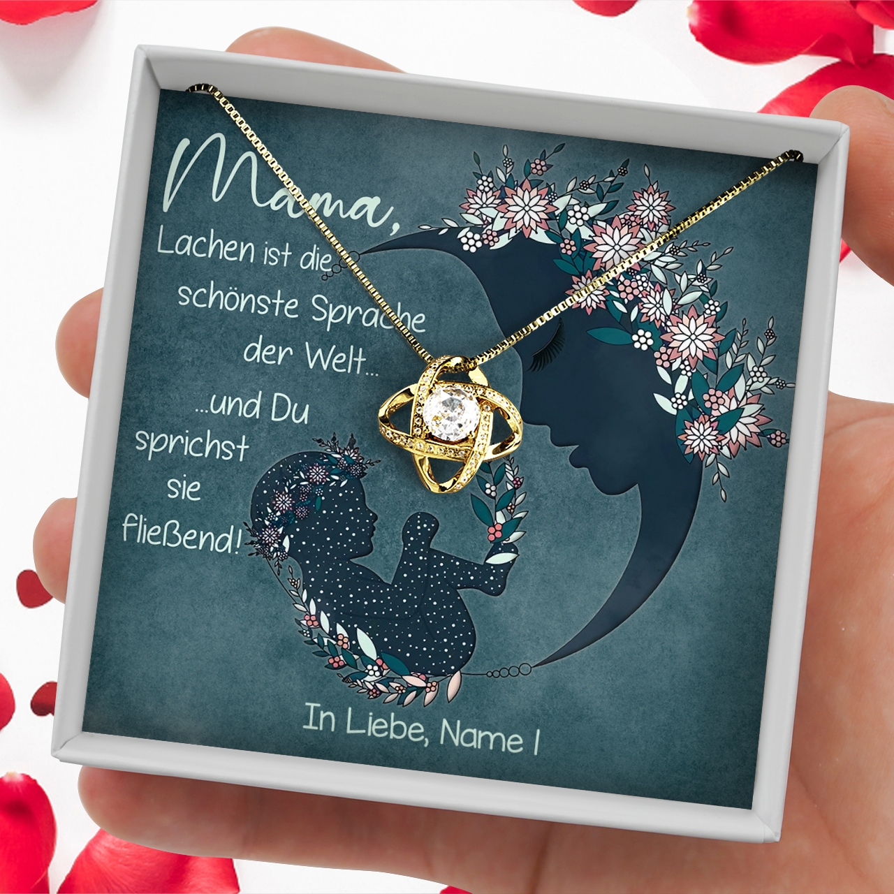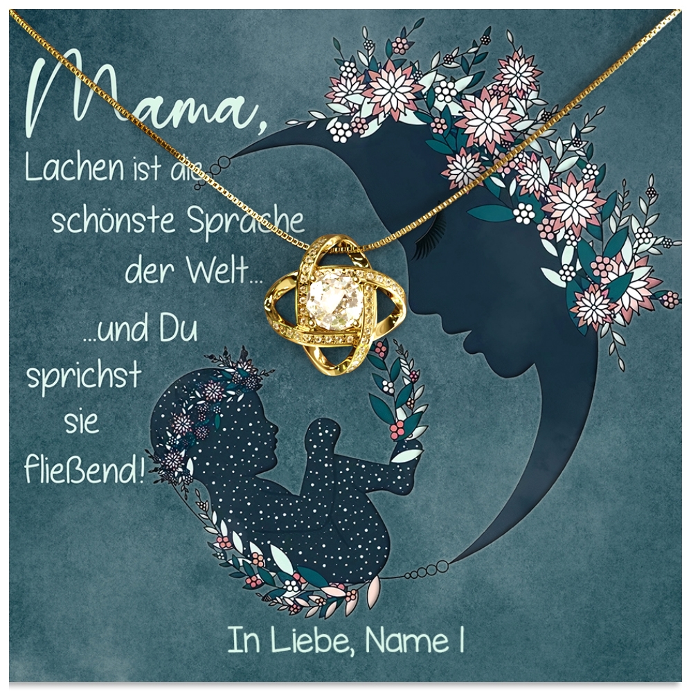 Deine Mama ist einfach der wunderbarste Mensch? Du möchtest Dich endlich dafür bedanken, dass sie immer an Deiner Seite ist und sich in guten wie schlechten Zeiten um Dich kümmert? Finde in unserem Schmucksortiment ein Juwel, welches ein Leuchten in die Augen Deiner Mama zaubern wird. Anschließend kannst Du die Karte „Schönste Sprache der Welt“ mit Deinem Namen personalisieren und das Set voller Freude überreichen. Wenn Ihr mehrere Geschwister seid, ist auch Platz für weitere Namen auf der Karte. In der Live-Vorschau kannst Du sehen, wie das finale Produkt aussehen wird.
