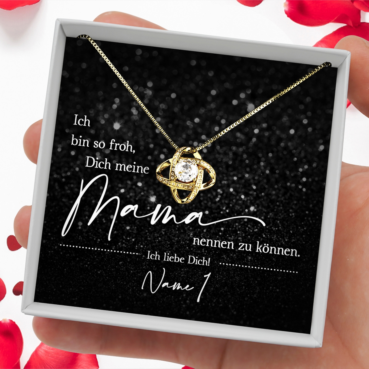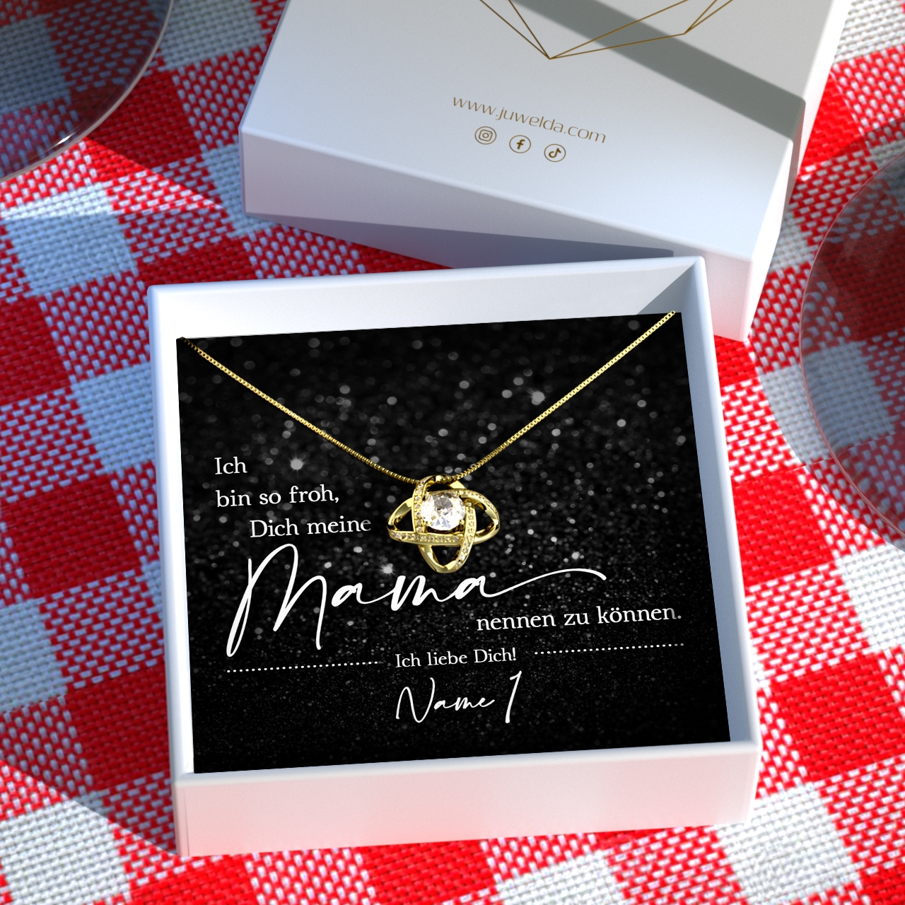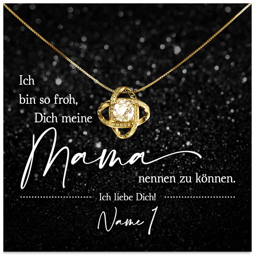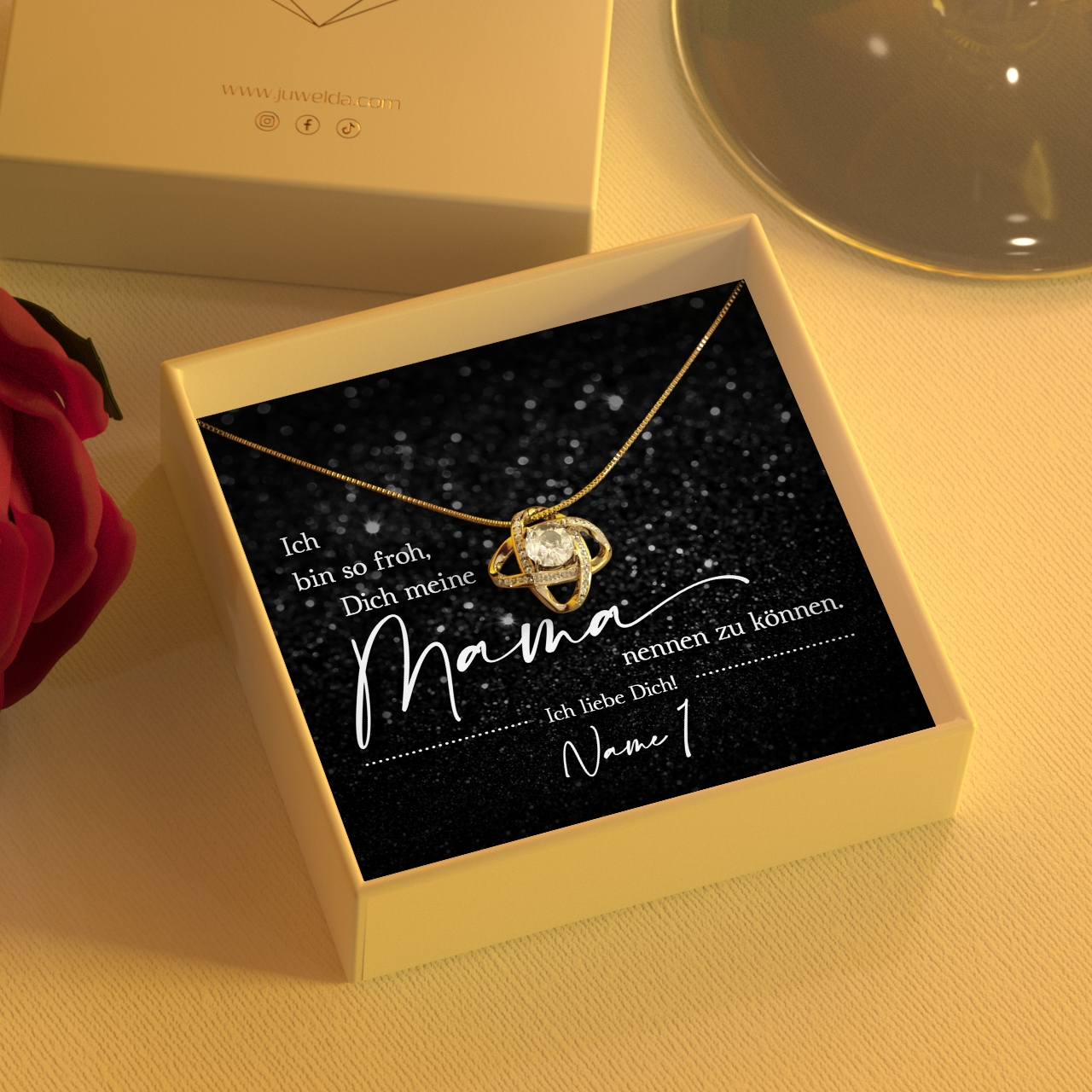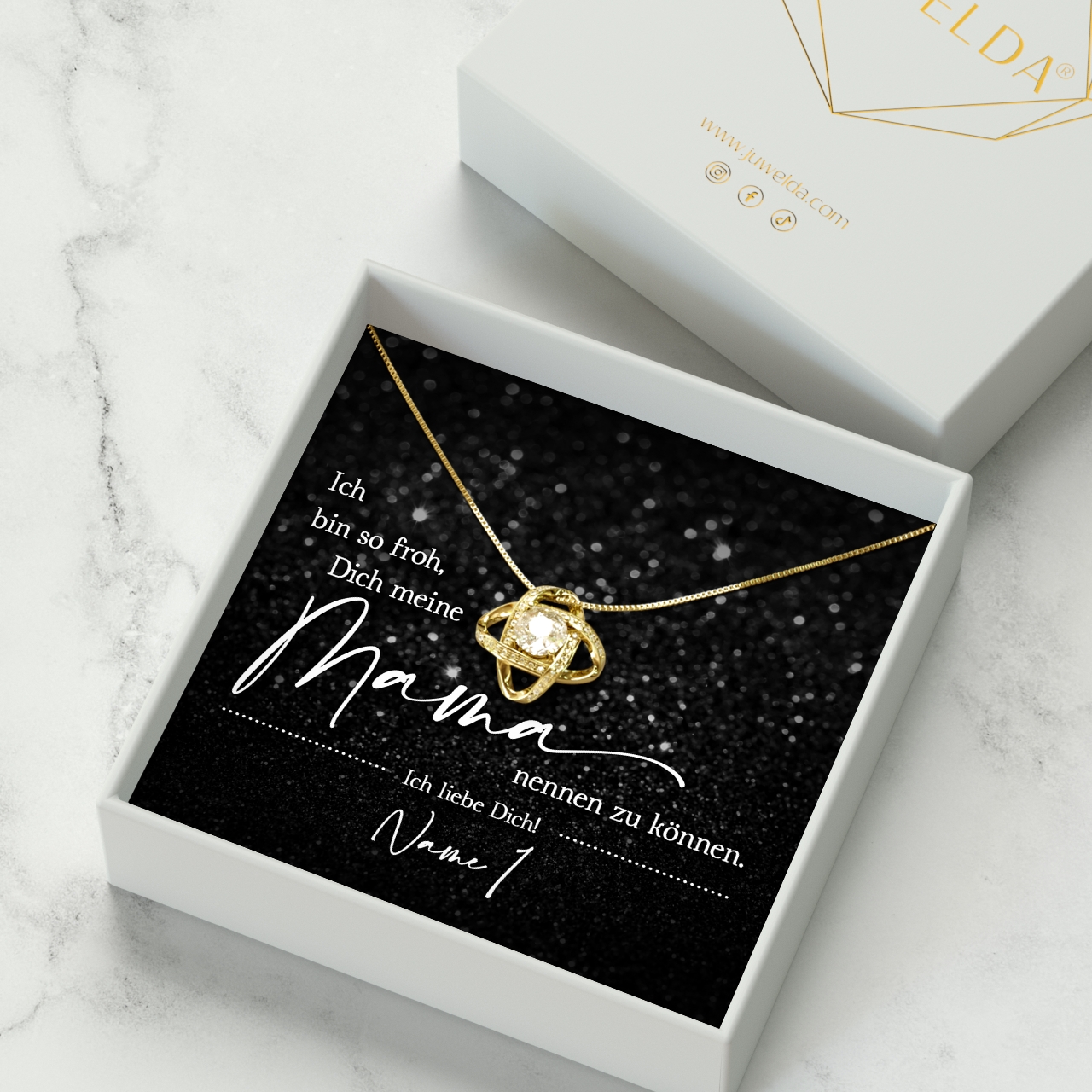 In dem Geschenkset ist eine Halskette aus 925 Sterling Silber, Deine personalisierte Karte und eine hochwertige Schmuckbox aus Kunstleder enthalten. Zusätzlich erhältst Du eine edle Geschenktasche, damit Du Dein Geschenk sofort an Deine Mama verschenken kannst. Wir verpacken Dein persönliches Geschenk von Hand in unserer kleinen Schmuckmanufaktur im schönen Westerwald.