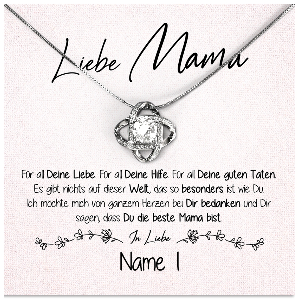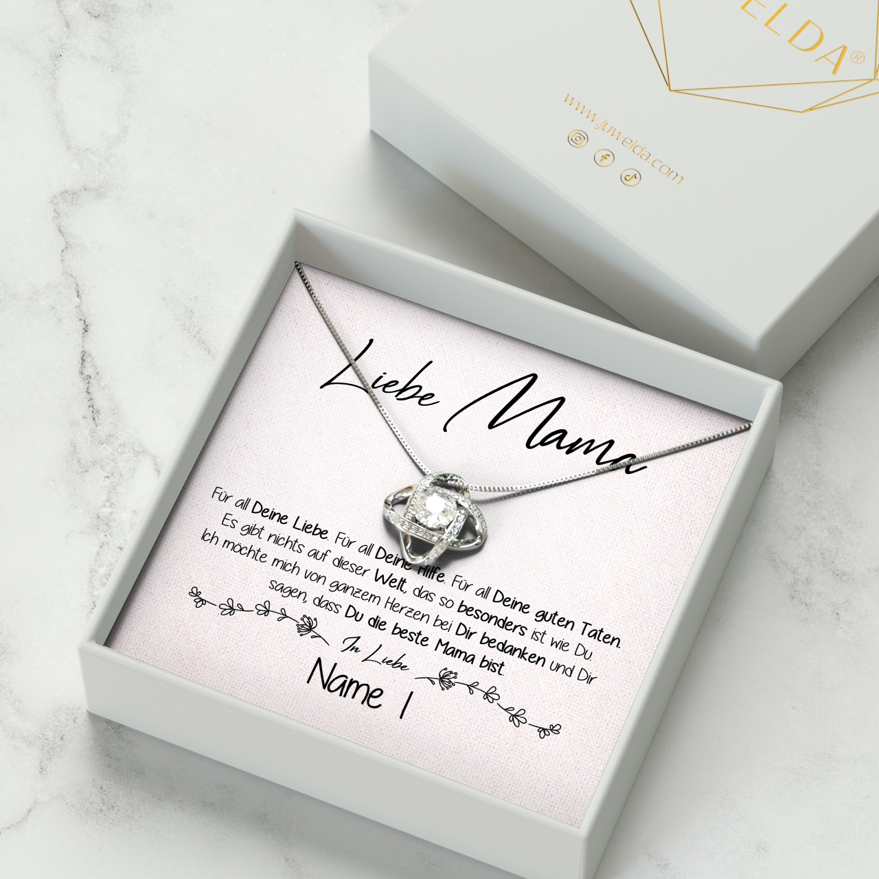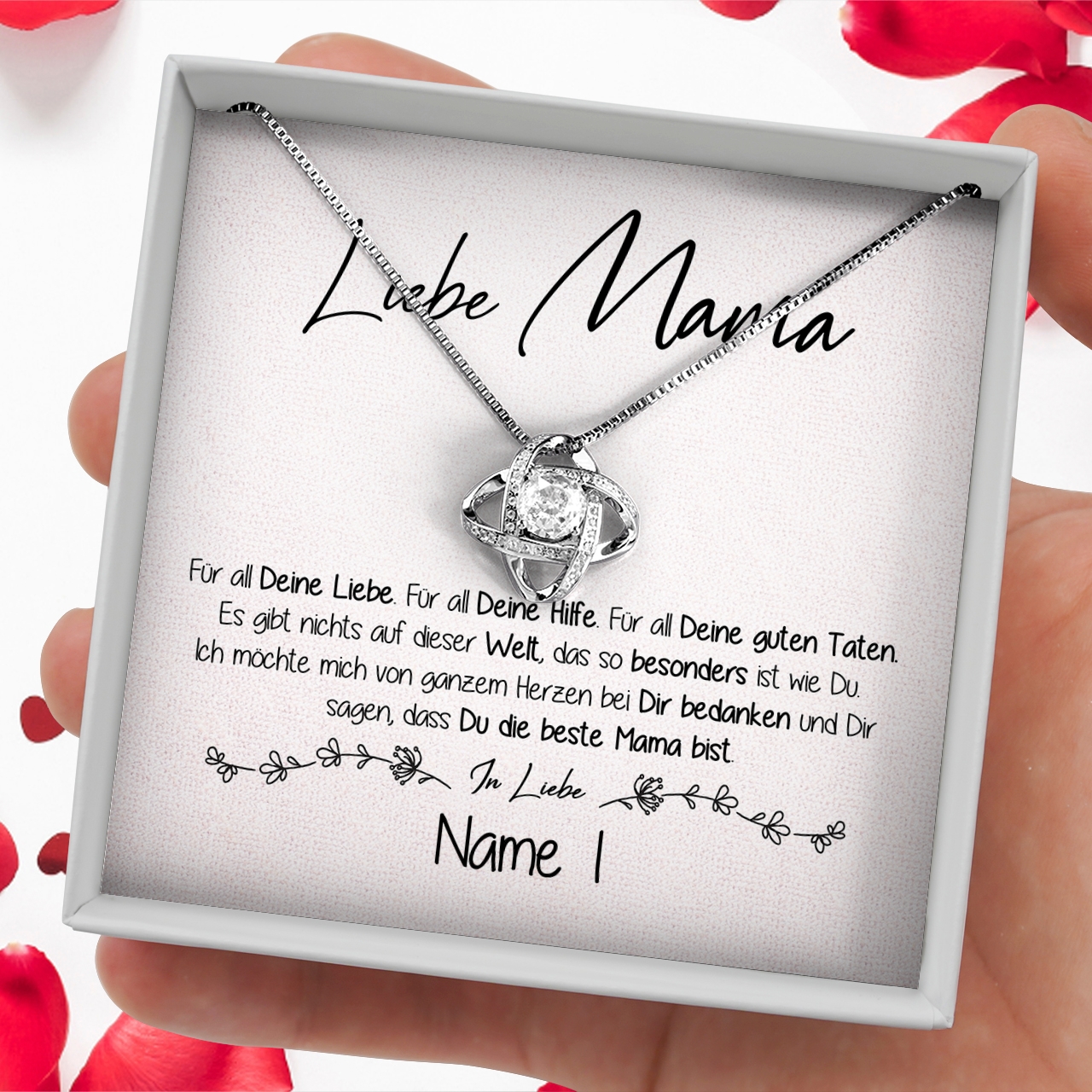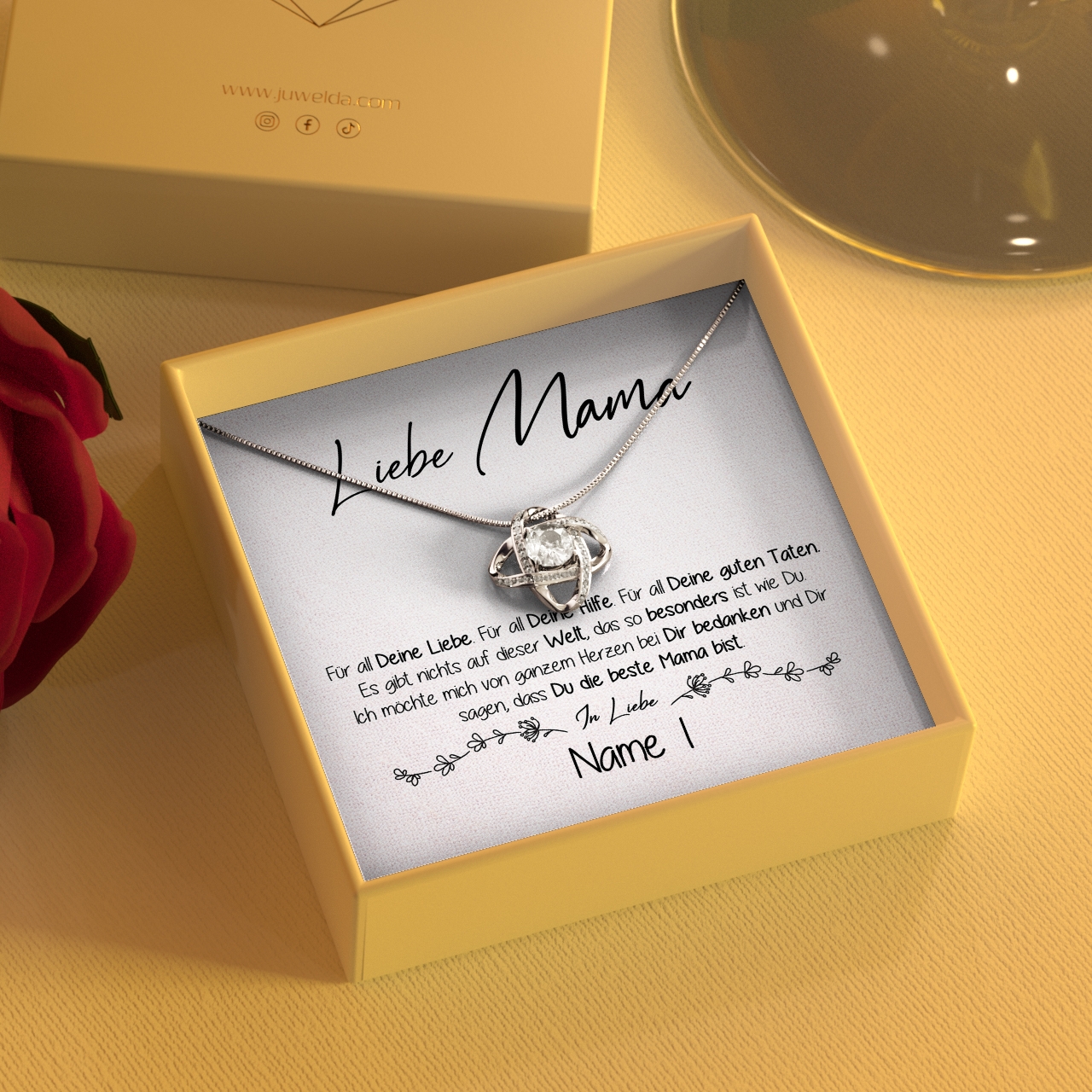 Dein ganz persönliches Geschenk besteht aus einer wunderschönen Halskette, die zusammen mit der personalisierten Karte in einer exklusiven Schmuckbox geliefert wird. Zusätzlich legen wir eine hochwertige Geschenktasche in Dein Paket, damit Du das Präsent sofort an Deine Mutter übergeben kannst.