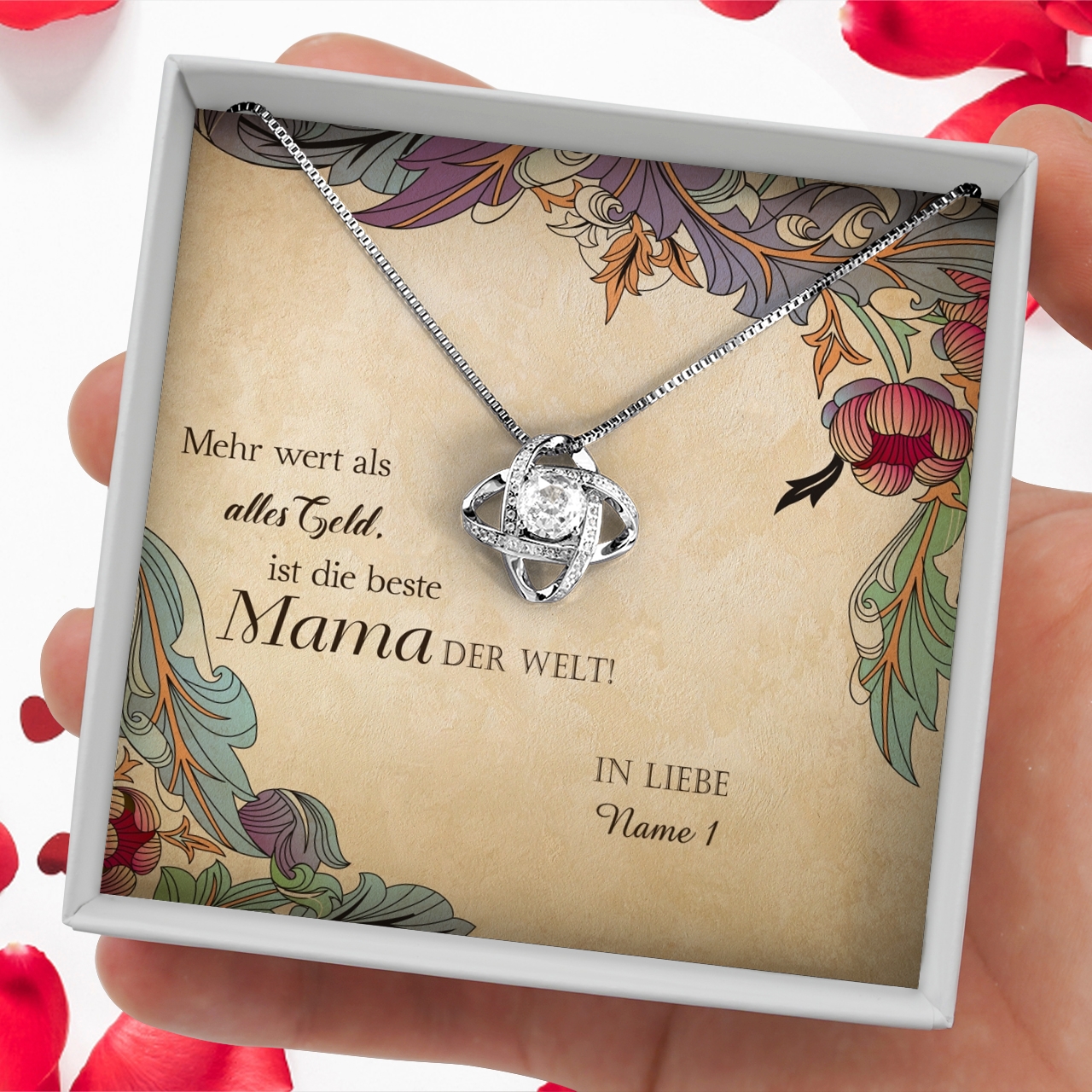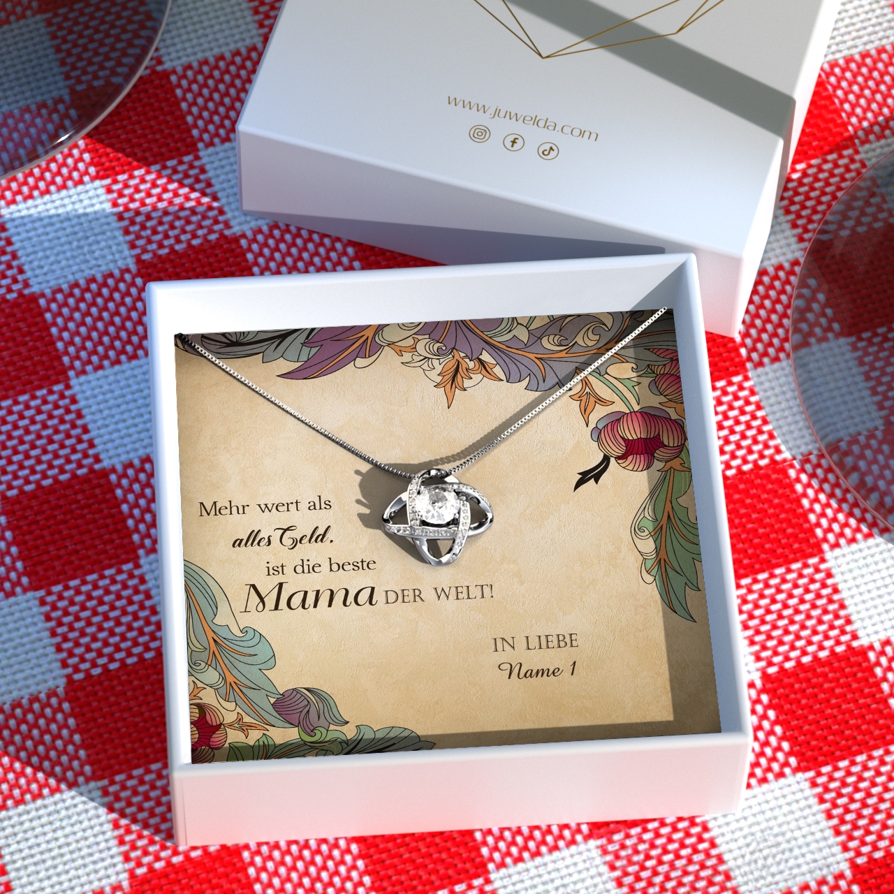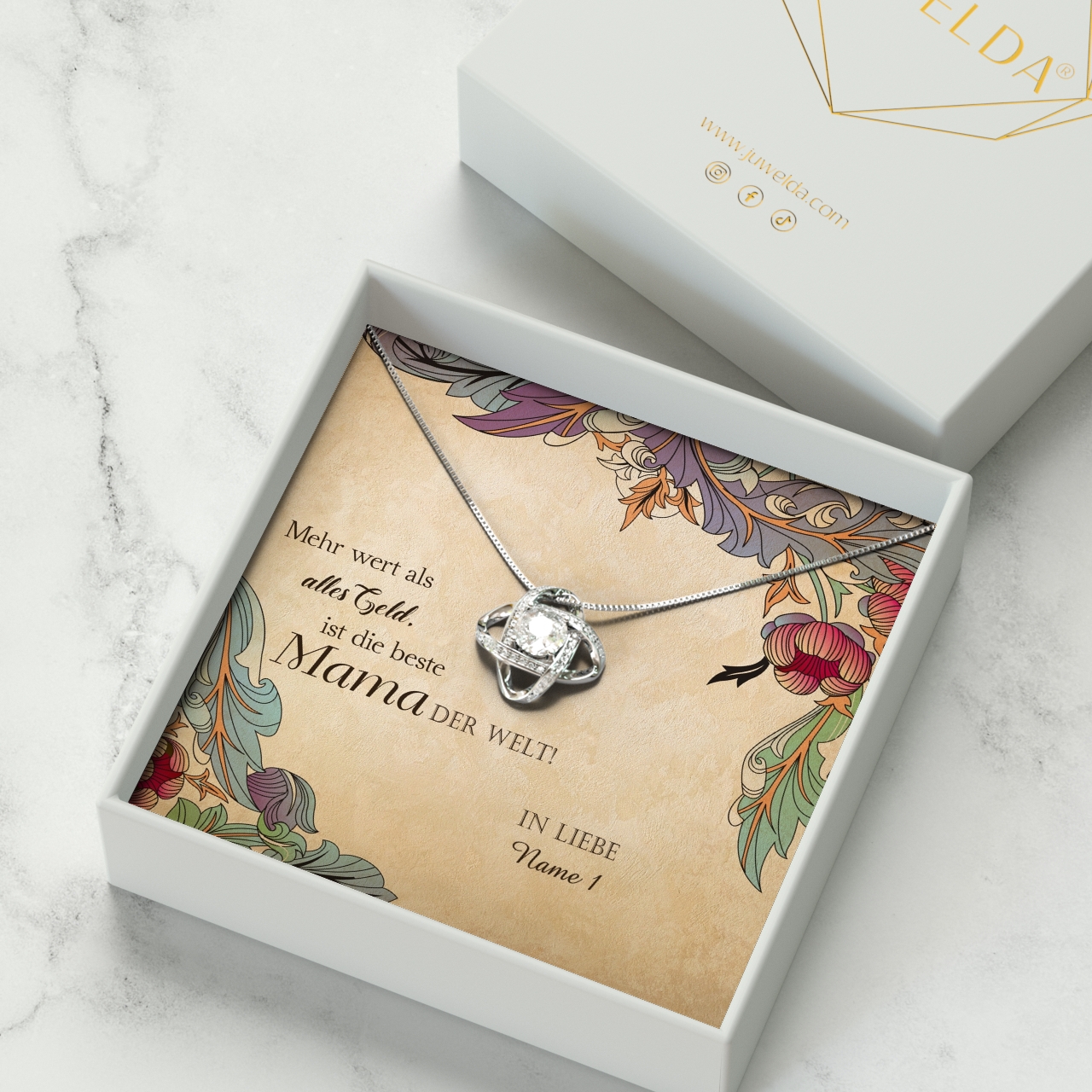 Ohne Mama wäre das Leben trist und langweilig? Sie bringt Dich zum Lachen, wenn Du traurig bist und würde mit Dir Pferde stehlen? Dann bringe sie mit einem ganz besonderen Präsent zum Staunen. Dafür kannst Du mir nur wenigen Klicks bei uns ein individuelles Geschenkpaket zusammenstellen. Die märchenhaft schönen Schmuckstücke sind in vielen Varianten im Angebot. So kannst Du ein Juwel wählen, das perfekt zu Mama passt. Das Vintage-Design dieser personalisierbaren Grußkarte ist elegant und detailliert gestaltet. Verewige Deinen Namen und auch die Namen weiterer Geschwister auf der Grußkarte.